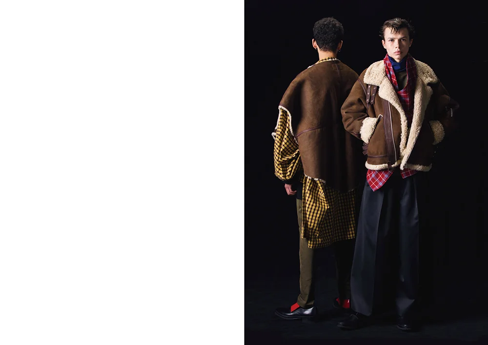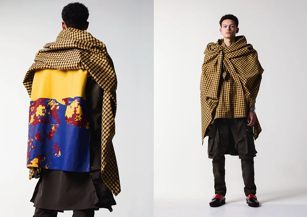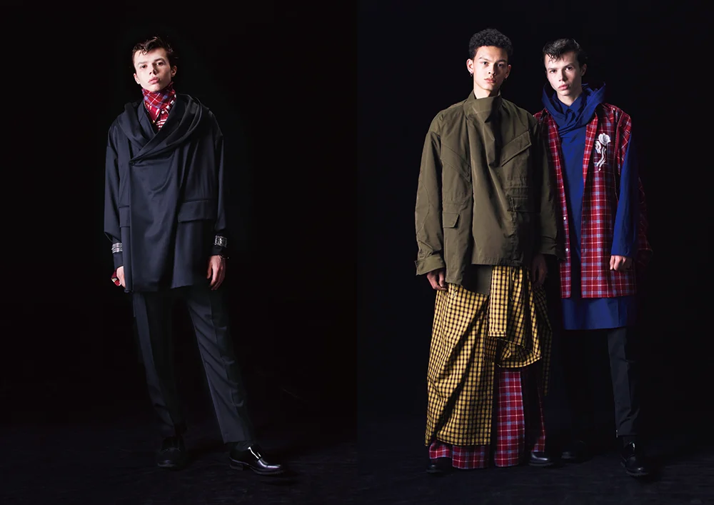 ALMOST BLACK refers to traditional Japanese dying technique in which the indigo hue is so deep that it looks black. For their "MULTIPLE EXPOSURE" collection, ALMOST BLACK developed a line of garments that represent a wide diversity of ethnic groups and fashion styles. Their use of bold colors and checkered patterned fabrics were inspired by Japanese-American photographer Yasuhiro Ishimoto's multi exposure Exhibition Catalogue.