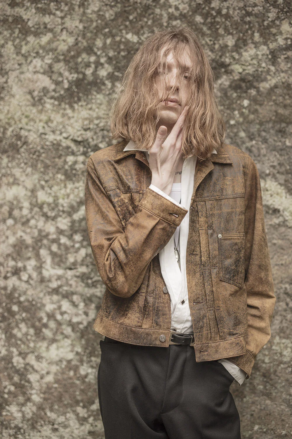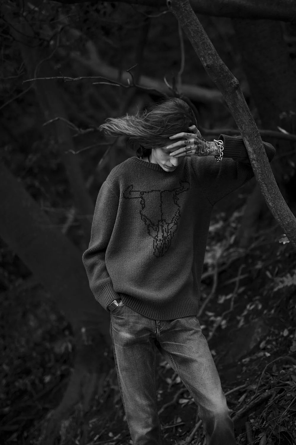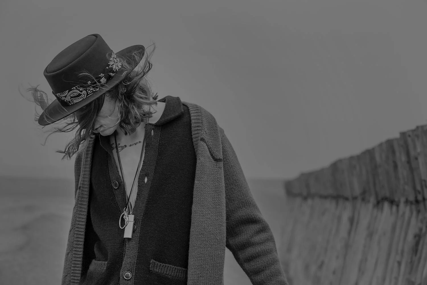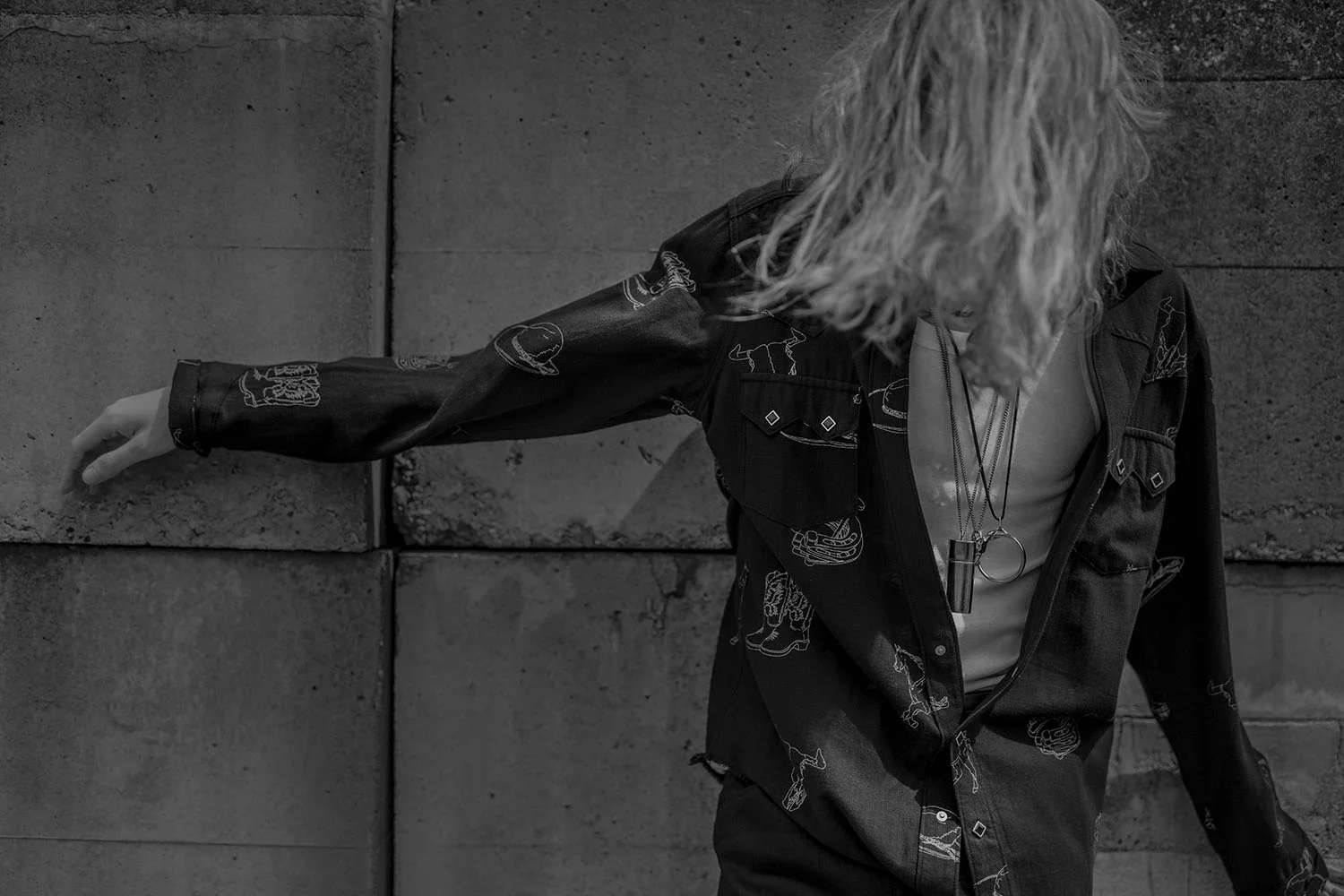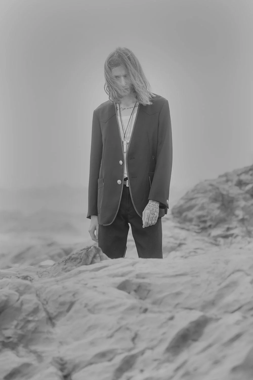 The latest collection incorporates Western details, silhouettes, and patterns into key pieces. Brown and black dominate the color schemes as seen in distressed leather jackets and slim-fitting trousers. Layering of multiple pieces is highlighted throughout with light cardigans, blazers, overcoat jackets, and accessories ranging from bandanas to cowboy hats.