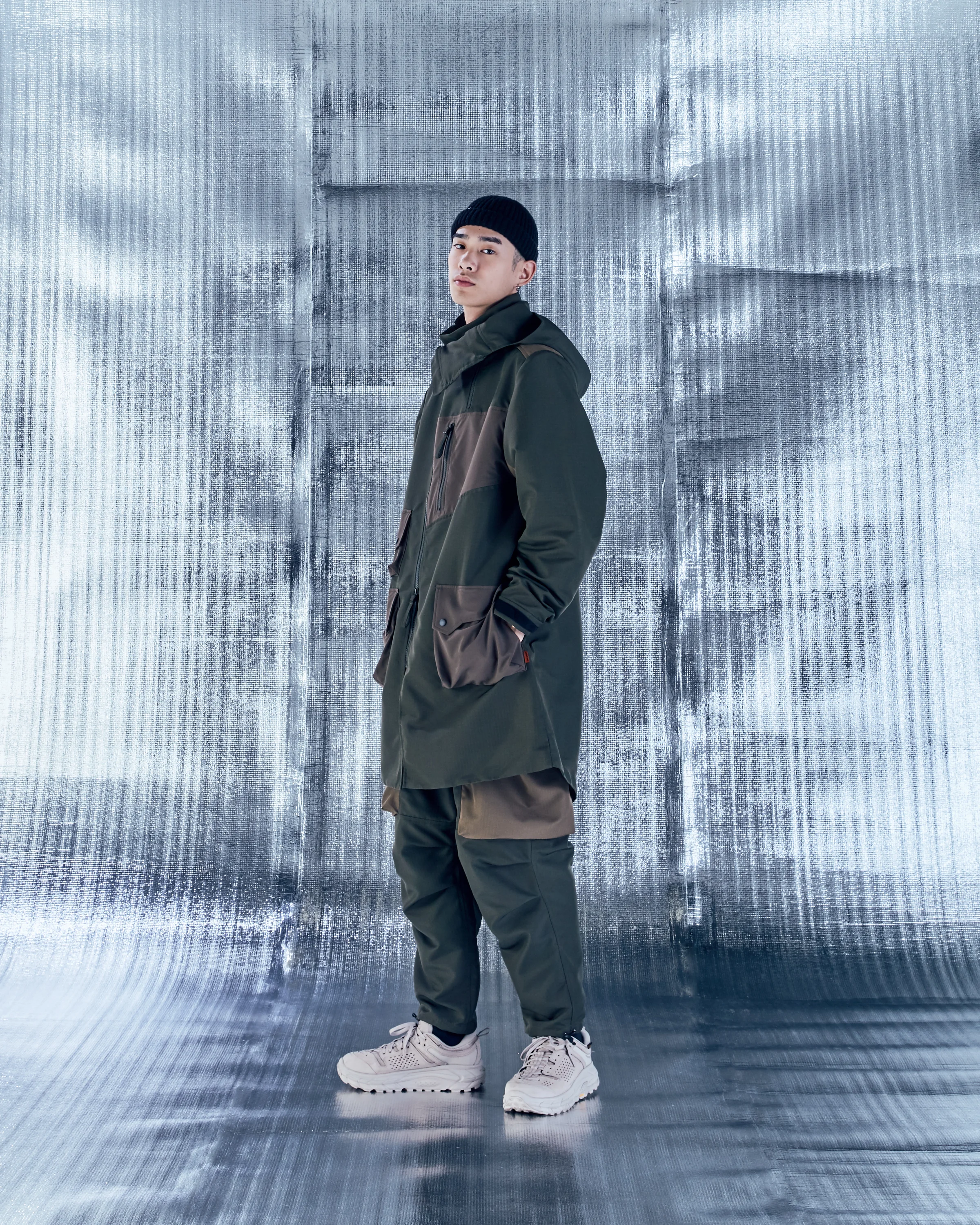 Among a backdrop of earth tones, the pieces coordinate in a heavily militaristic arrangement, combining for an almost unmatched synergy. Long parkas as well as similarly fashioned pullovers and utility vests are hit with an assortment of large compartments throughout their body, with asymmetric zippers splitting each piece at odd ends. Silhouettes are characteristically large, creating a one-of-a-kind profile which GOOPIMADE has taken as their personal aesthetic. An accompanying set of cargo trousers complete the full ensemble, finishing off their collaborative efforts.