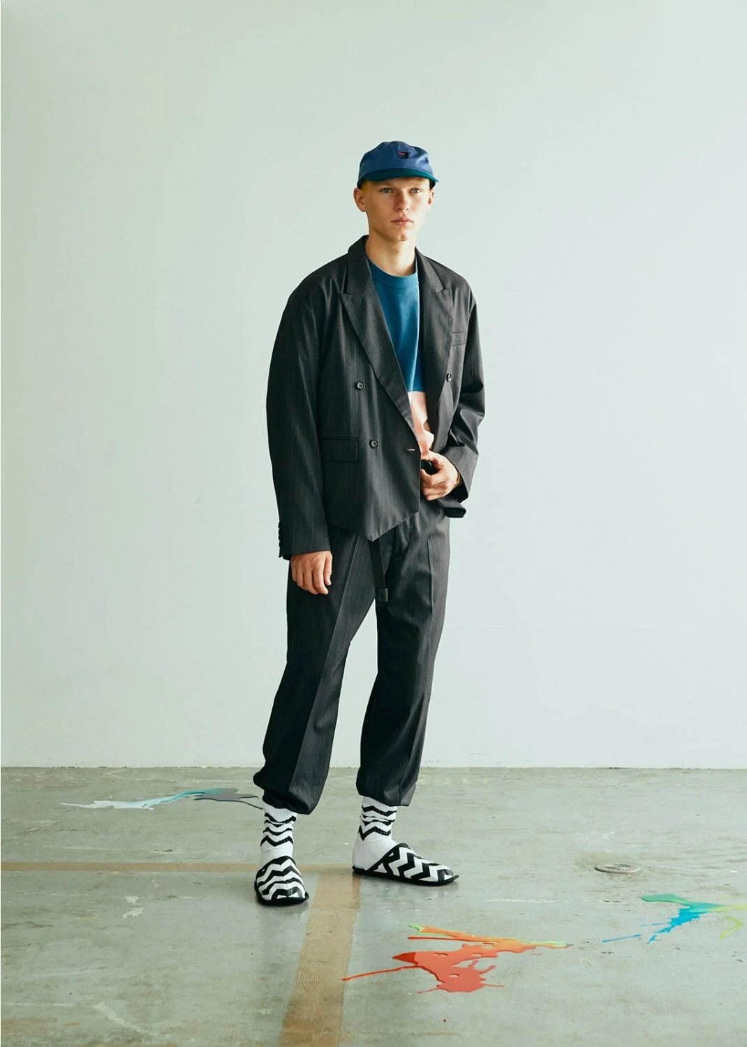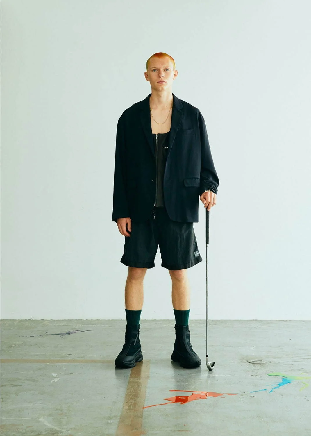 Despite not needing that extra bit of warmth, the seasonal range is ripe with outerwear: though pieces aren’t of the same bulk -- with no appearance from down fill or insulating wools -- offerings like the double-breasted blazer, back-print blouson, and army jacket are surely welcome additions for the rare chilly day. The latter piece, shedding its more serious interpretations, features an ornate graphic across the covering blue backdrop, a slight floral aesthetic shared by the breadth of camp collar shirting. Utility by way of vests and sling pouches act in cohesion of some of the many rain parkas, which are no stranger to the bold as some opt for black and white chevrons, neon blues with compartments in spades, or even classic yellows in poncho constructions. These, however, are in no way close to matching the lively artwork almost impossible to miss on Nobuyuki Murayama’s selection of work jackets and short-sleeve tops.