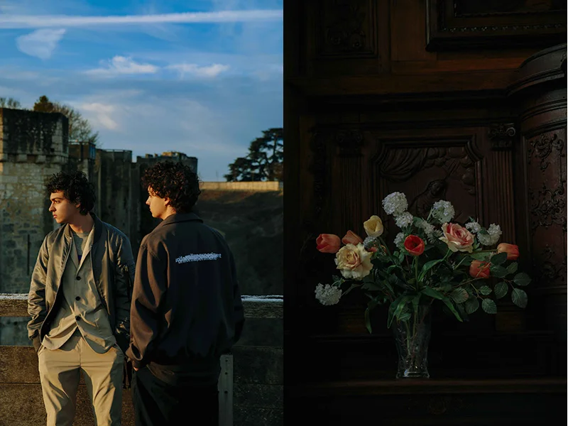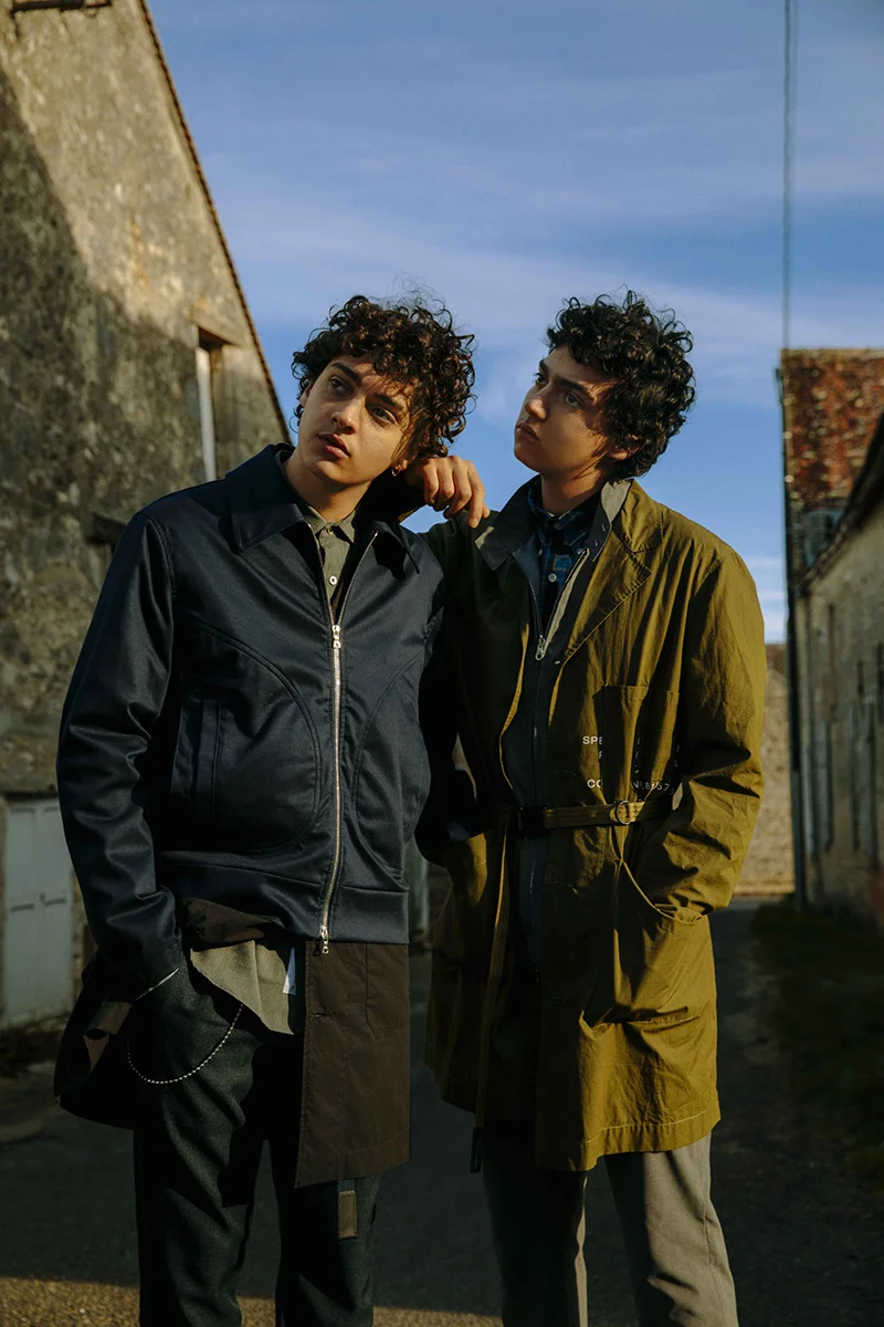 Inspired by historic architecture of cathedrals and brick buildings, the editorial entitled “detour” highlights the layering capabilities of the entire collection by focusing on lightweight Spring/Summer outerwear. Navy MA-1 blousons are paired with military green coats and slim-fitting trousers for an everyday-ready look. Louder jackets with uniform experiment text patterns and crewneck sweaters featuring their color chart logo are balanced with minimal shirts, trousers, and their minimal trainer sneakers.