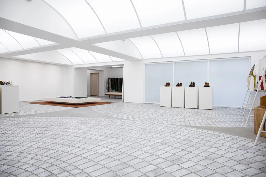 Design is kept extremely minimal, allowing the clothes themselves to act as art pieces of sorts. Denim of its many variants and short-sleeved tops are displayed across the simplistic white constructions of hanging racks, matching the barren backdrop that reflects in its colorless paint. Skylights open up to a plethora of natural lighting, beaming down on the hand-constructed footwear, which sit atop a pedestal equally bare bones. Tiled flooring section off the varied segments of the space, distracting in no way from the printed rugs on which a base of sprawled shirting lies. Huge mirrors, wooden furniture, and much more complete a location that is wholly visvim in identity with the true experience only achieved in person.