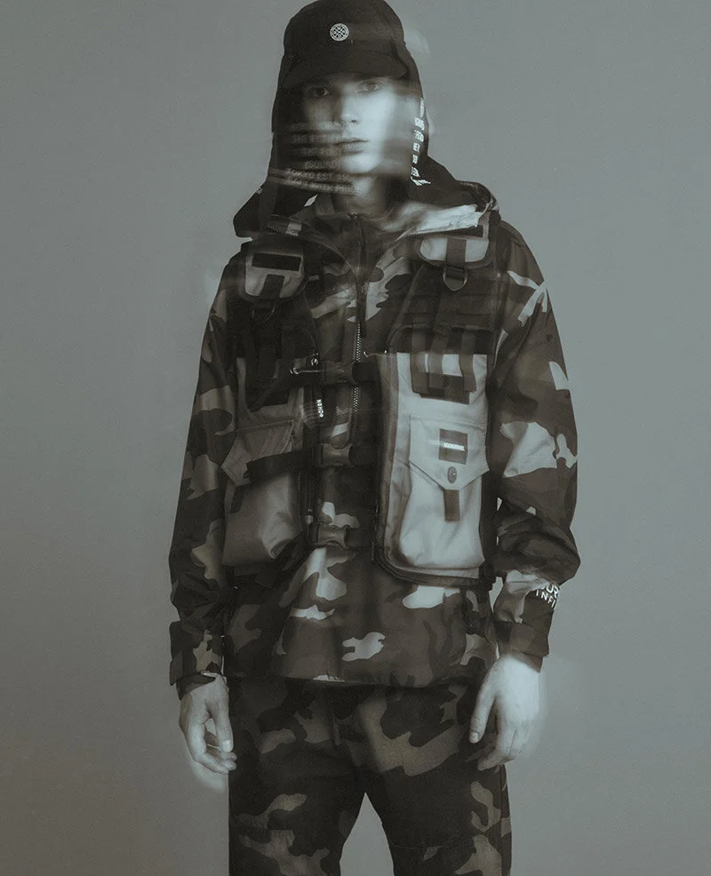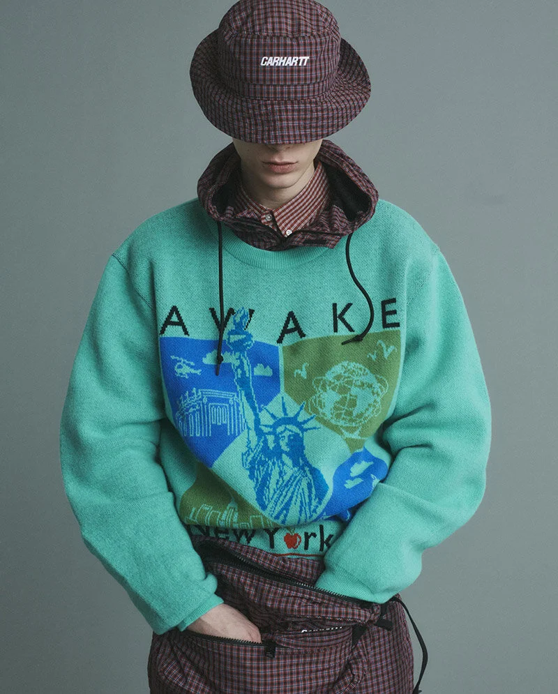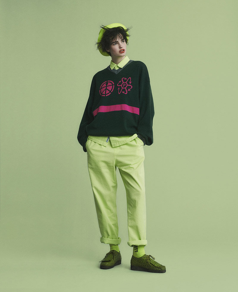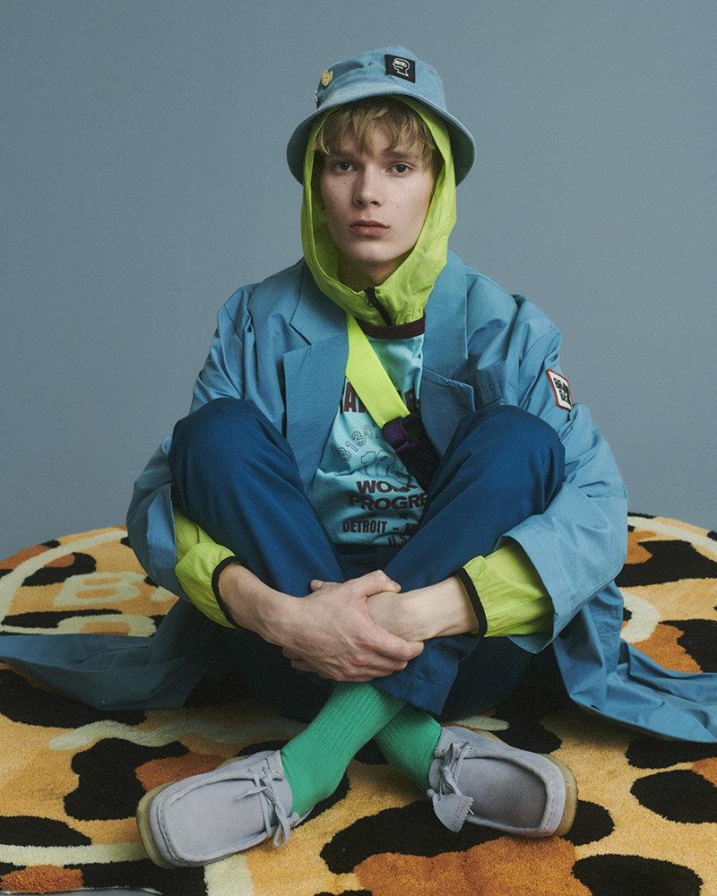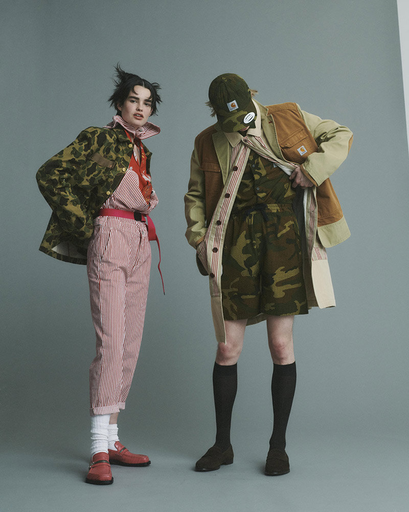 Silver Mag keeps Carhartt WIP’s workwear ethos at the core of each look while integrating garments from other labels as well as collaboration items. Multiple Japan labels are presented, ranging from FPAR’s banner hoodie alongside Carhartt WIP’s overalls to Neighborhood’s military aesthetics and UNDERCOVER’s forward-thinking fashion genius. Their neon green set of shirt and trousers are contrasted with a Rassvet knit sweater featuring their double logo graphics while their look with Brain Dead is a playful study on color and graphics. Additional brands showcased with Carhartt WIP include Heron Preston, A.P.C., P.A.M. (Perks And Mini), Awake NY, and COMME des GARÇONS JUNYA WATANABE MAN.