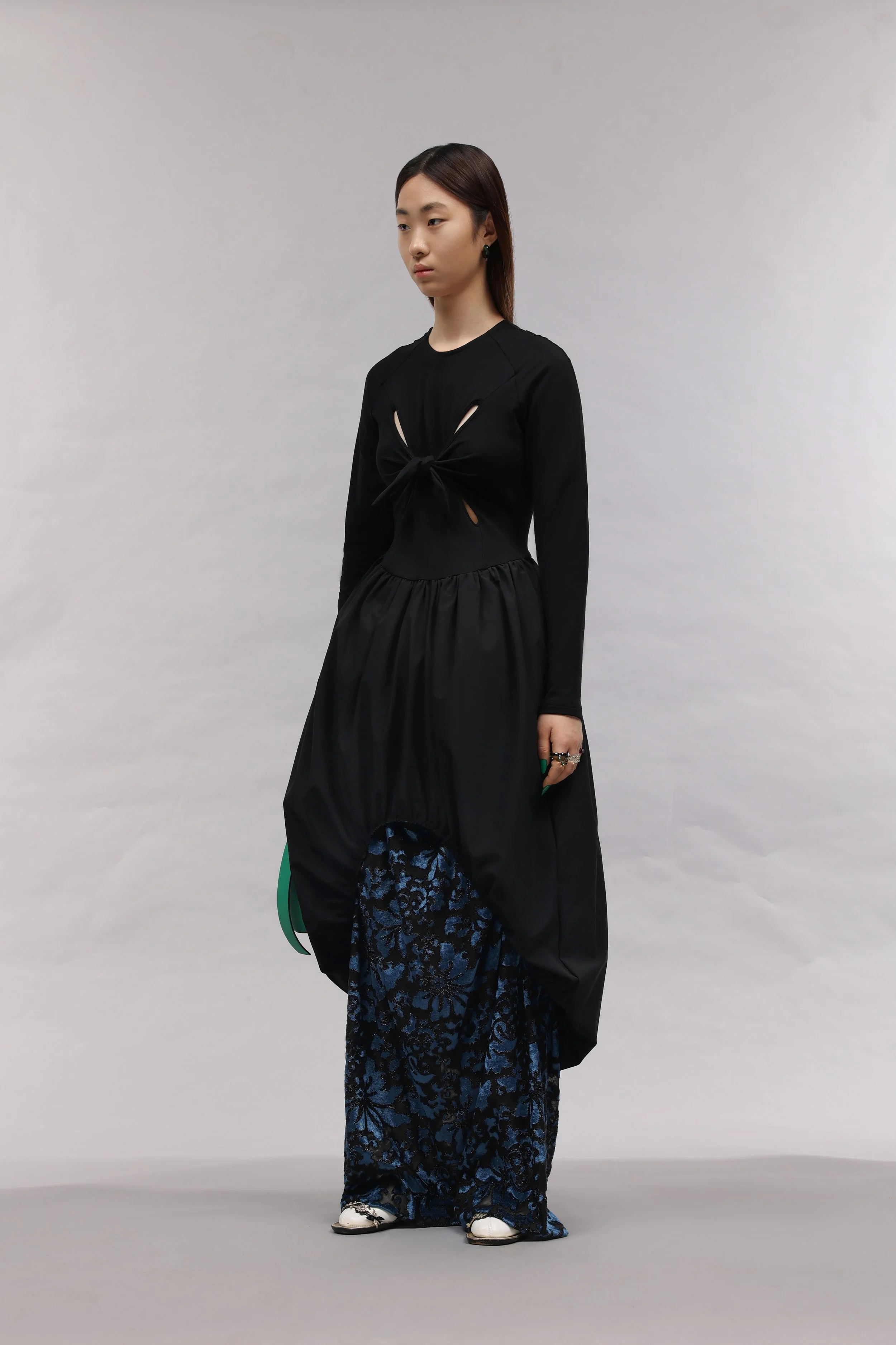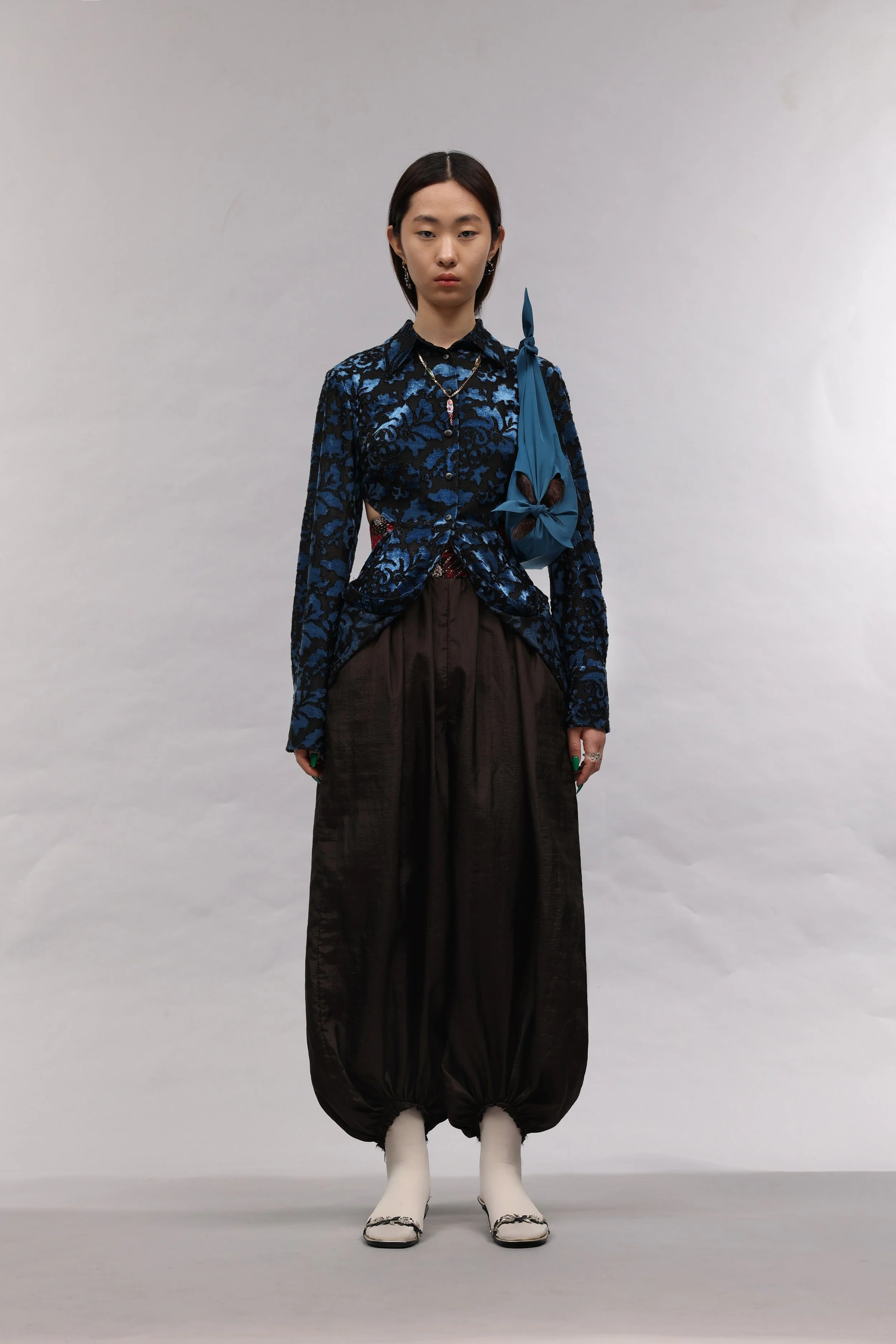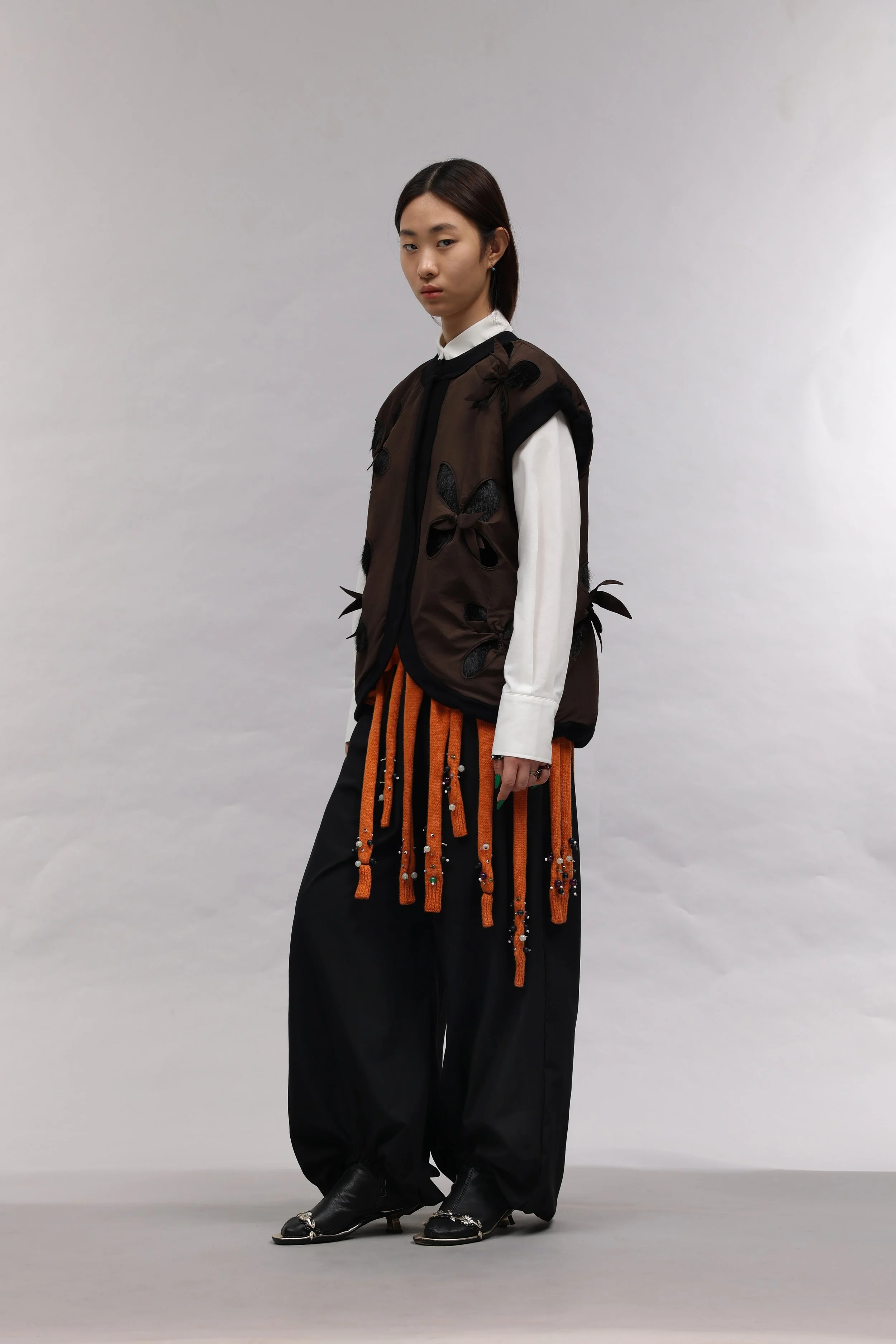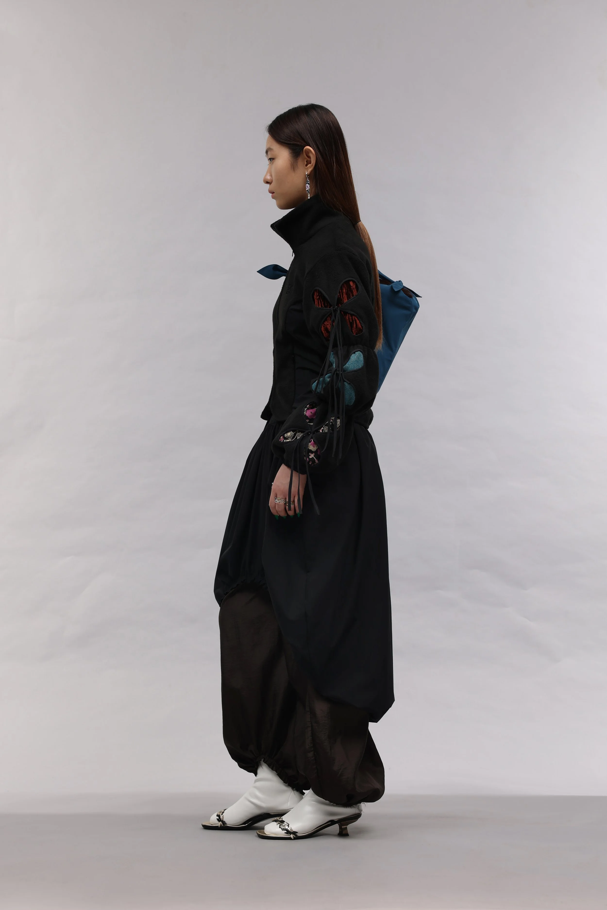 As a Korean born in Uzbekistan, J.Kim’s design work is a tool to establish her own design language by exploring her unique identity in a way that the industry has yet to be exposed to. Drawing on cultural references from Uzbekistan and Korea, the garments reference traditional uniforms and lifestyles to architecture and local traditions.