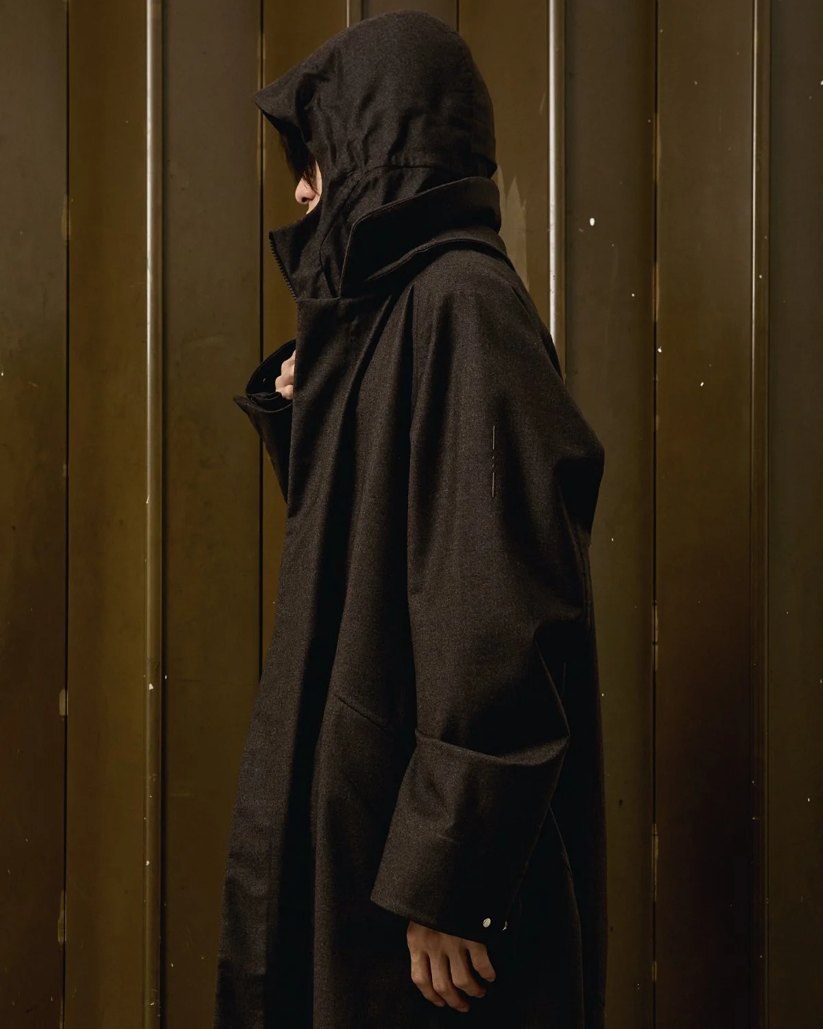 Consisting of outerwear, legwear and a bag, it sees J.L-A.L’s signature design language and ergonomic pattern cutting fused with Marzotto’s rich fabric development and innovation heritage, who are responsible for developing a custom water-repellent three-layer wool. Iconic styles from Autumn/Winter ‘24, such as the Atlas Coat, Spire Jacket and Strata Jacket, are revisited by the aforementioned technical wool fabric and a seam-sealed construction for increased weatherproofing. While introduced in a new context, the pieces express familiar design codes that are defined by doubled and curved collars, concealed pocket flaps and elevated metallic hardware.