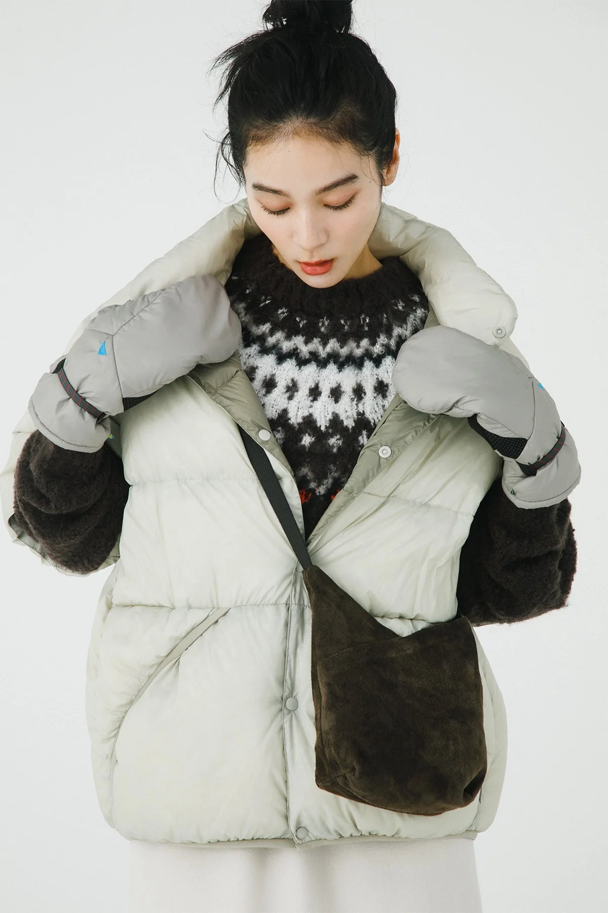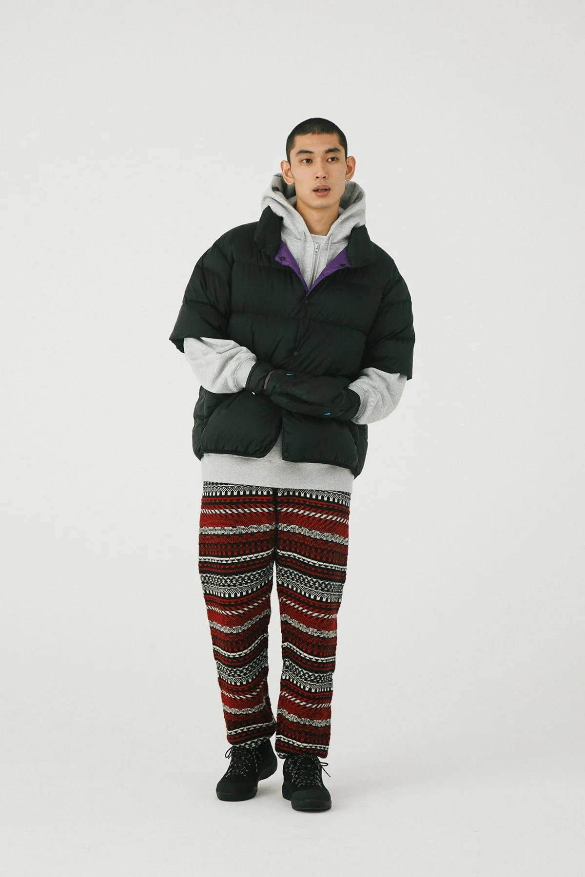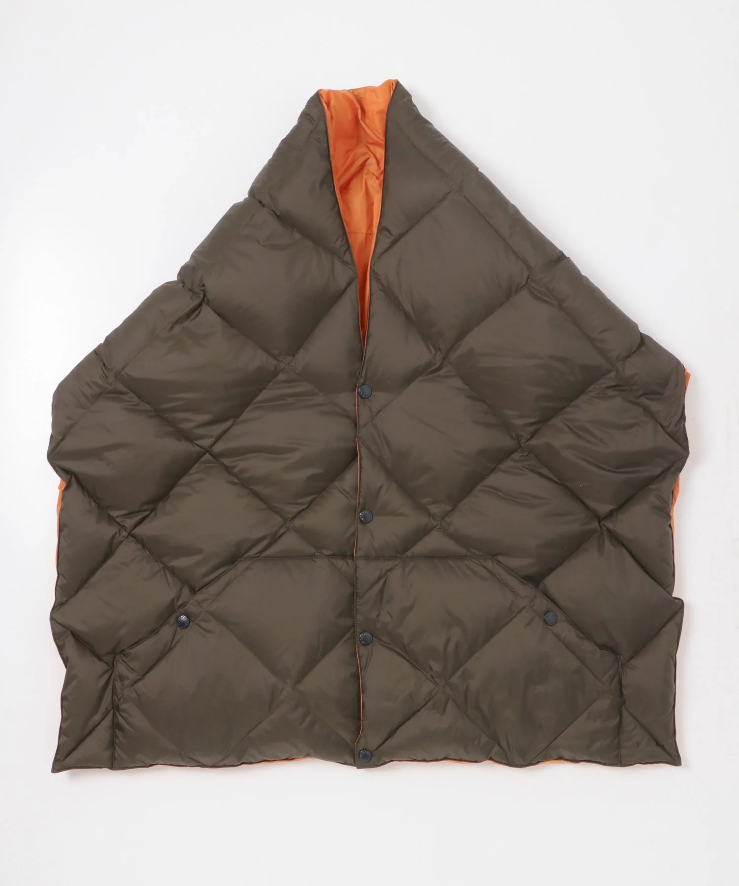 In their debut project, EKAL leans on Taion’s specialist insulation, specifically an 800FP lightweight and voluminous down. The half-sleeve down jacket has a stand-up collar, creating a full and puffy look, with two overlapping front pockets with binder tape, and a contrasted interior lining. Secondly, the reversible down shawl adheres to the silhouette it borrows its nomenclature from, with hand pockets and a button fastener on the front, allowing you to wear it like a vest. It comes in two reversible colours: Ice Grey/Khaki and Chocolate Brown/Brick Orange.