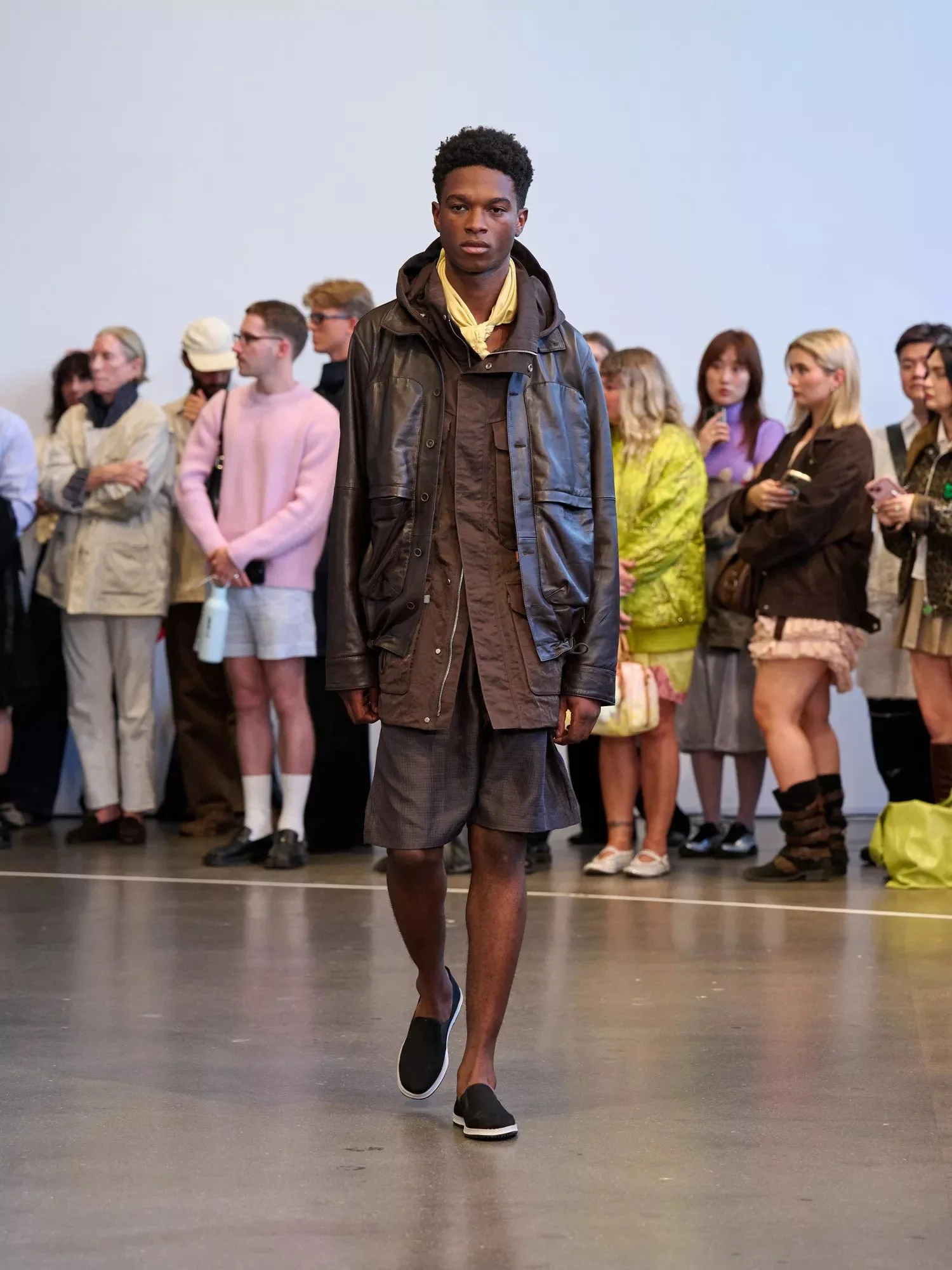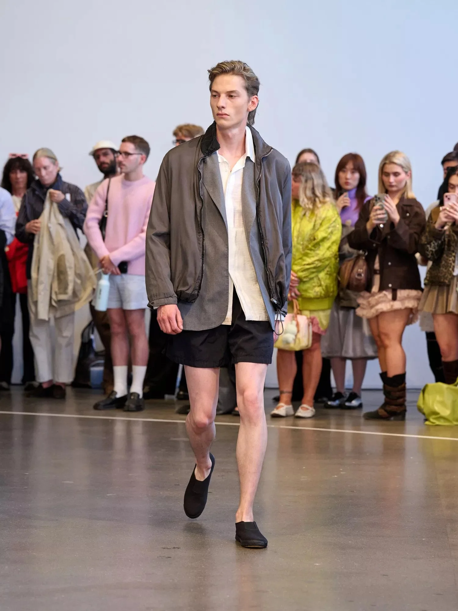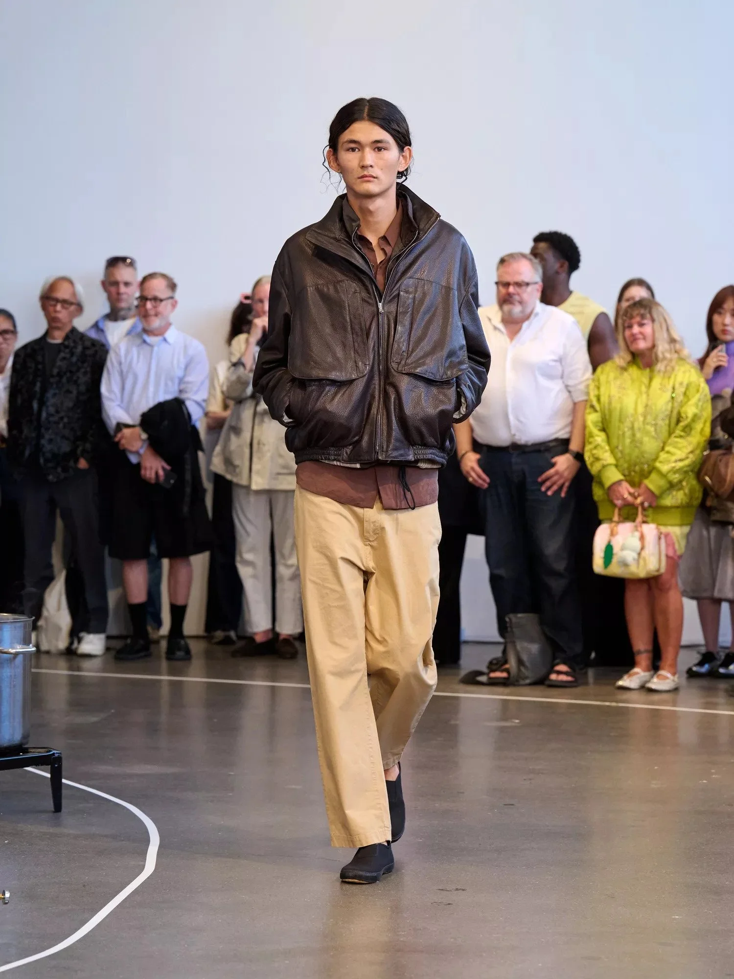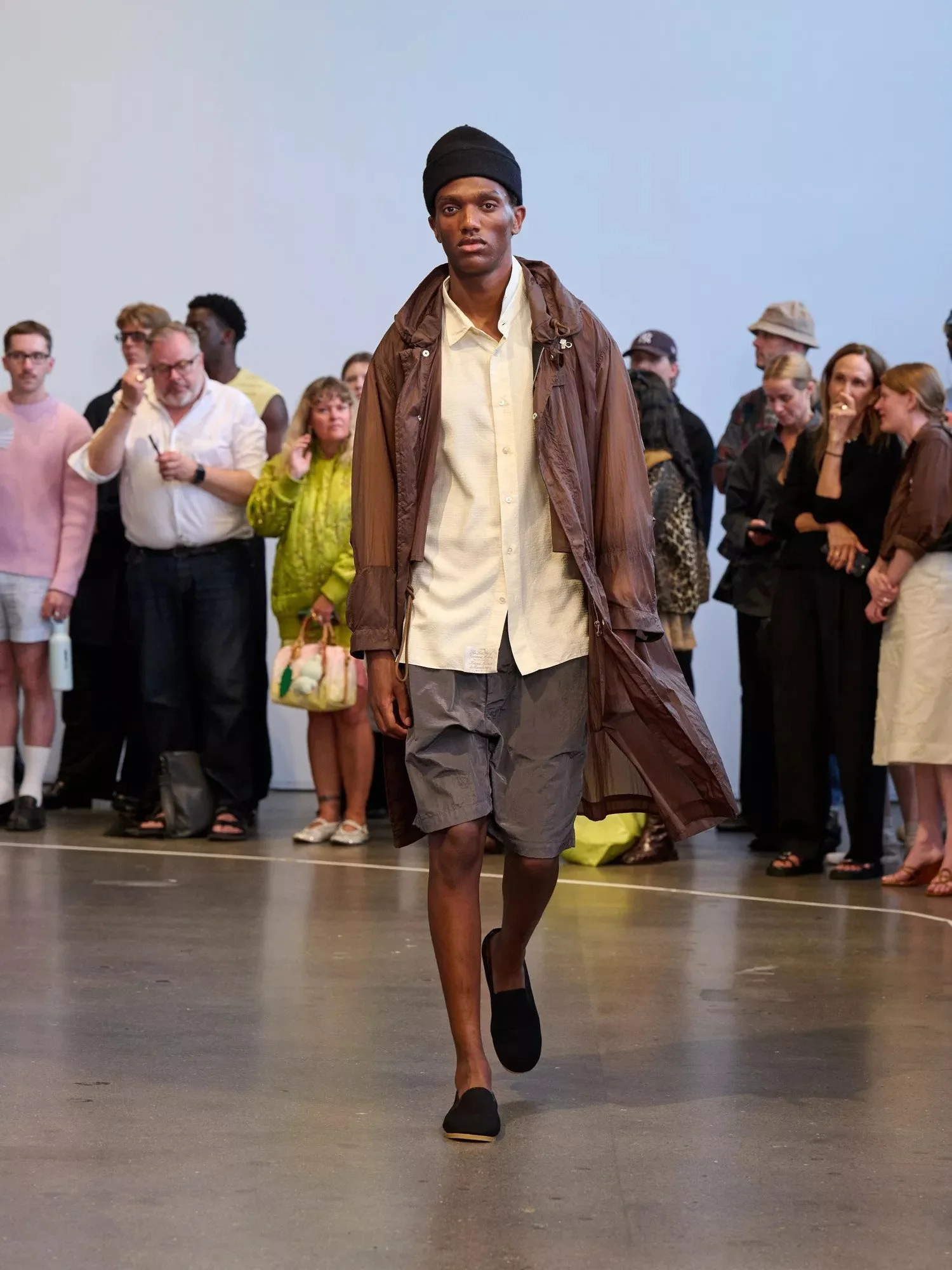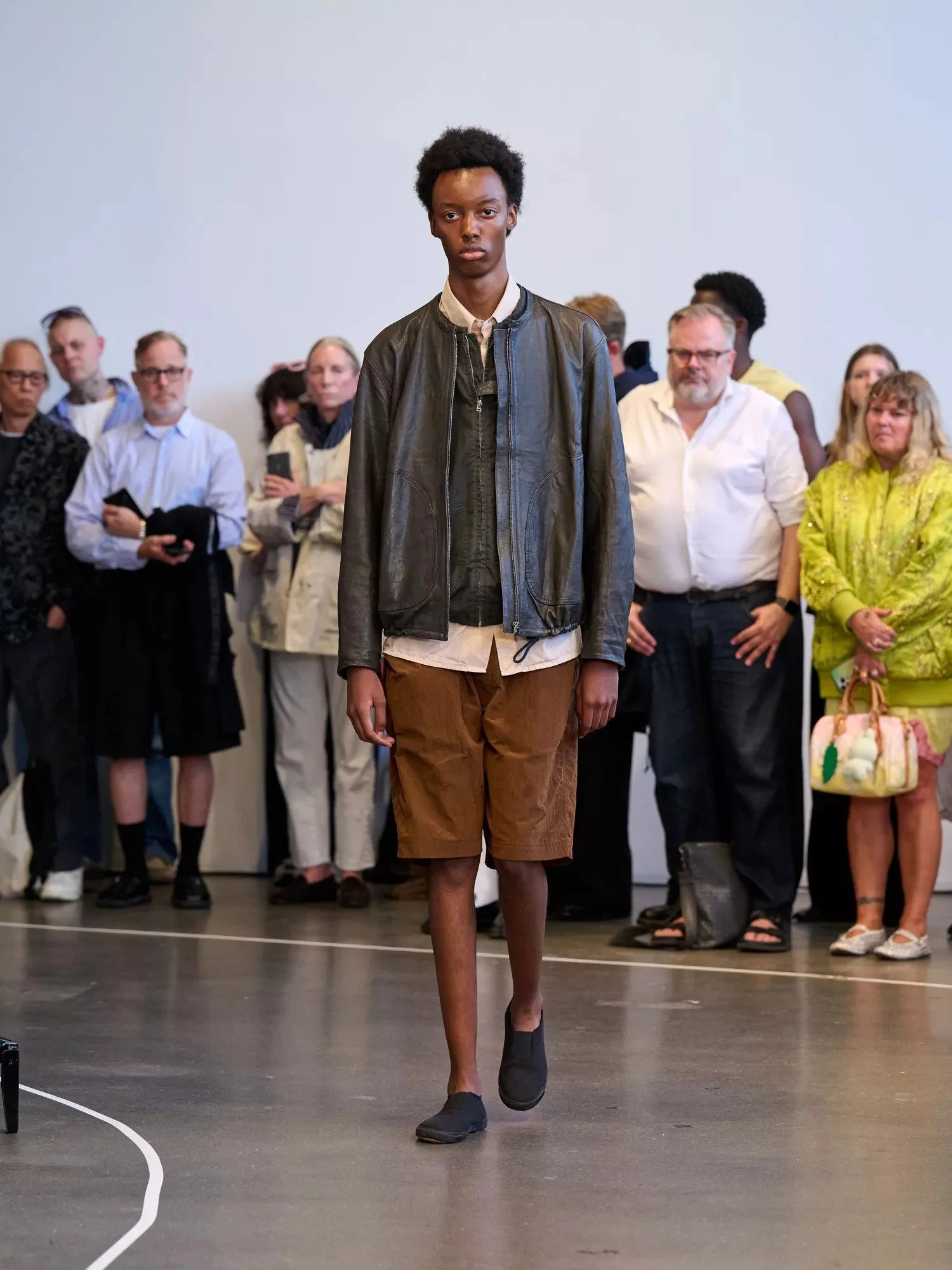 Spring/Summer ‘26 quickly becomes a quiet metaphor for observing the end of Winter and embracing what lies ahead: potential, life, growth, and light. From concept to material choice, design to styling, every decision is intentionally rooted in storytelling, going beyond producing clothing just for the sake of it and using it as a vessel for the culture and history of Ranra’s native Iceland. This subtlety powered the collection, challenging the notion of a traditional runway show as models moved freely through the space, as press and onlookers watched just meters away. Leather jackets adopted deep, earthy tones, mirroring the soil of their native landscape - a starting point for life - while airy silhouettes crafted from cotton-linen and silk-ripstop shorts mirrored the sweeping caresses of the wind, a force vital for growth. Woollen sweaters honour traditional methods, materials, and silhouettes, while bottoms, outerwear, and shirting closely align with the brand’s modern and transitional intentions. Accompanying the apparel are several iterations of Ranra’s ‘KALT’ footwear style, born from the brand’s in-house programme and an evolution of past collaborations with the likes of Salomon.