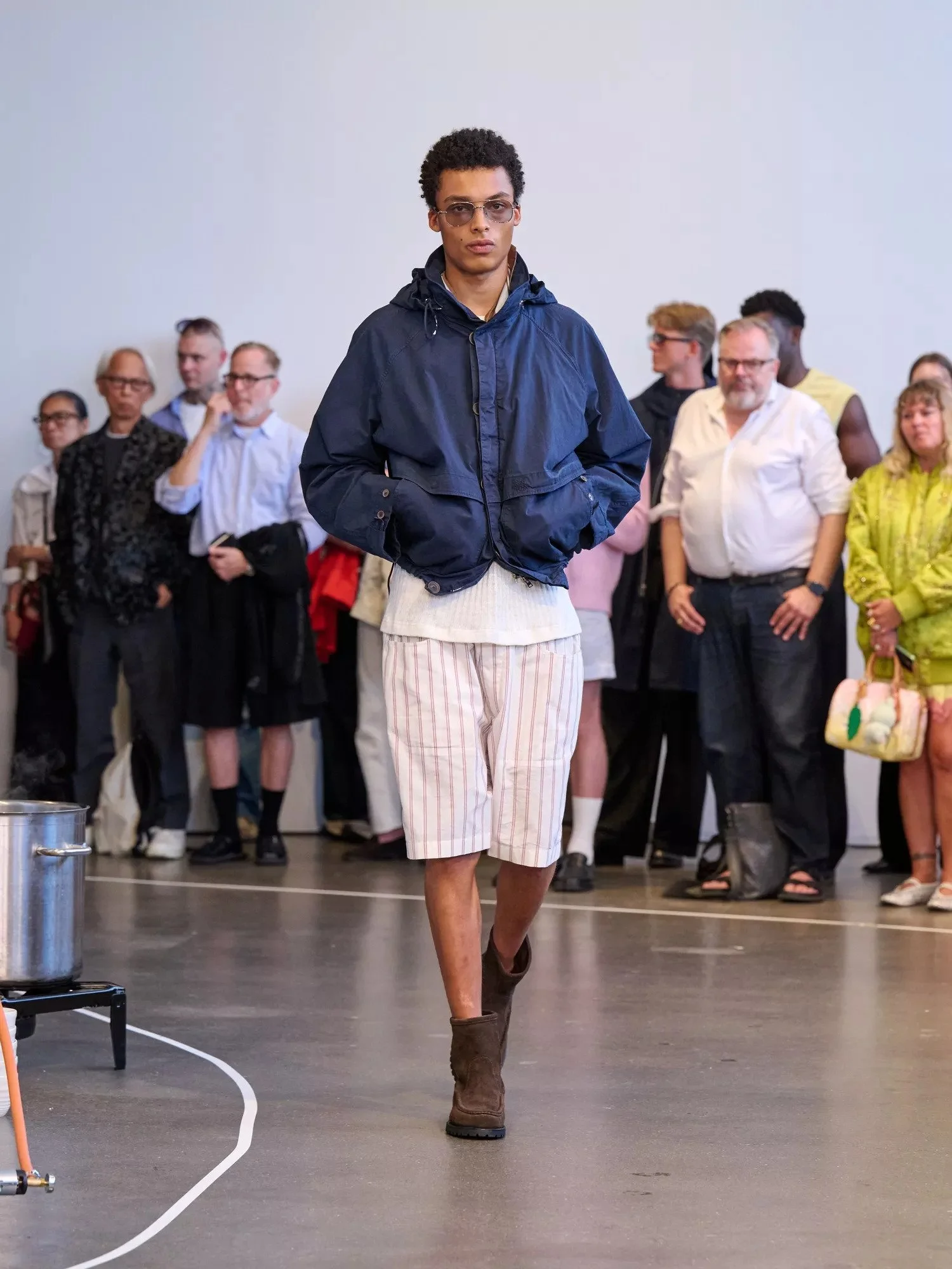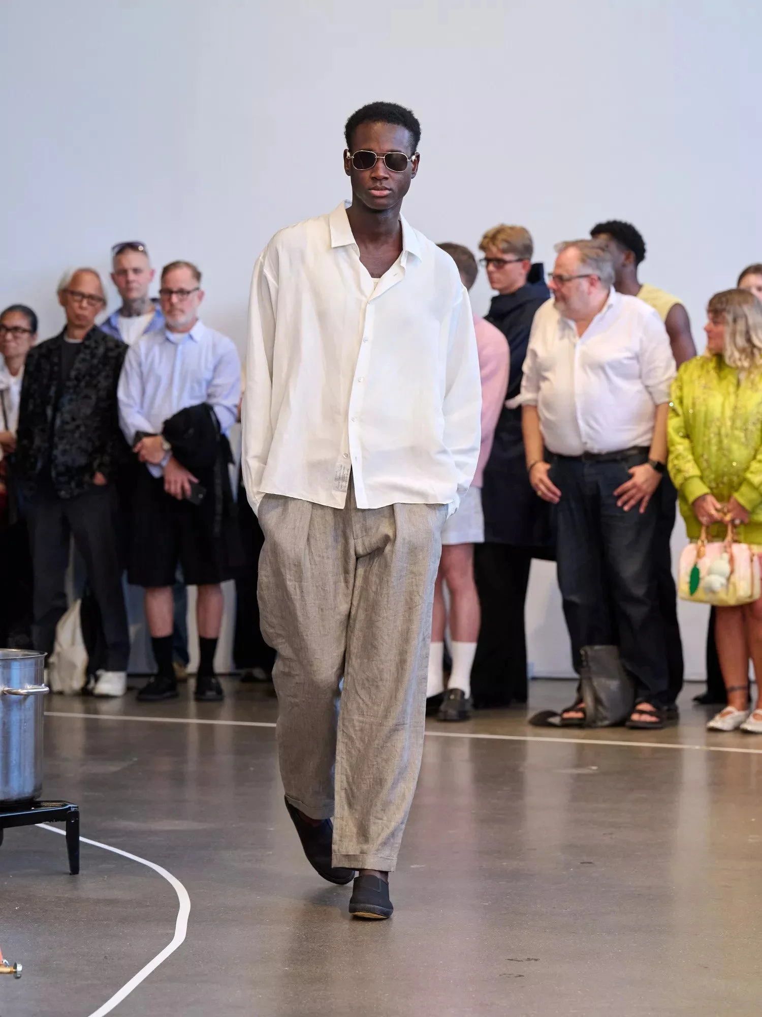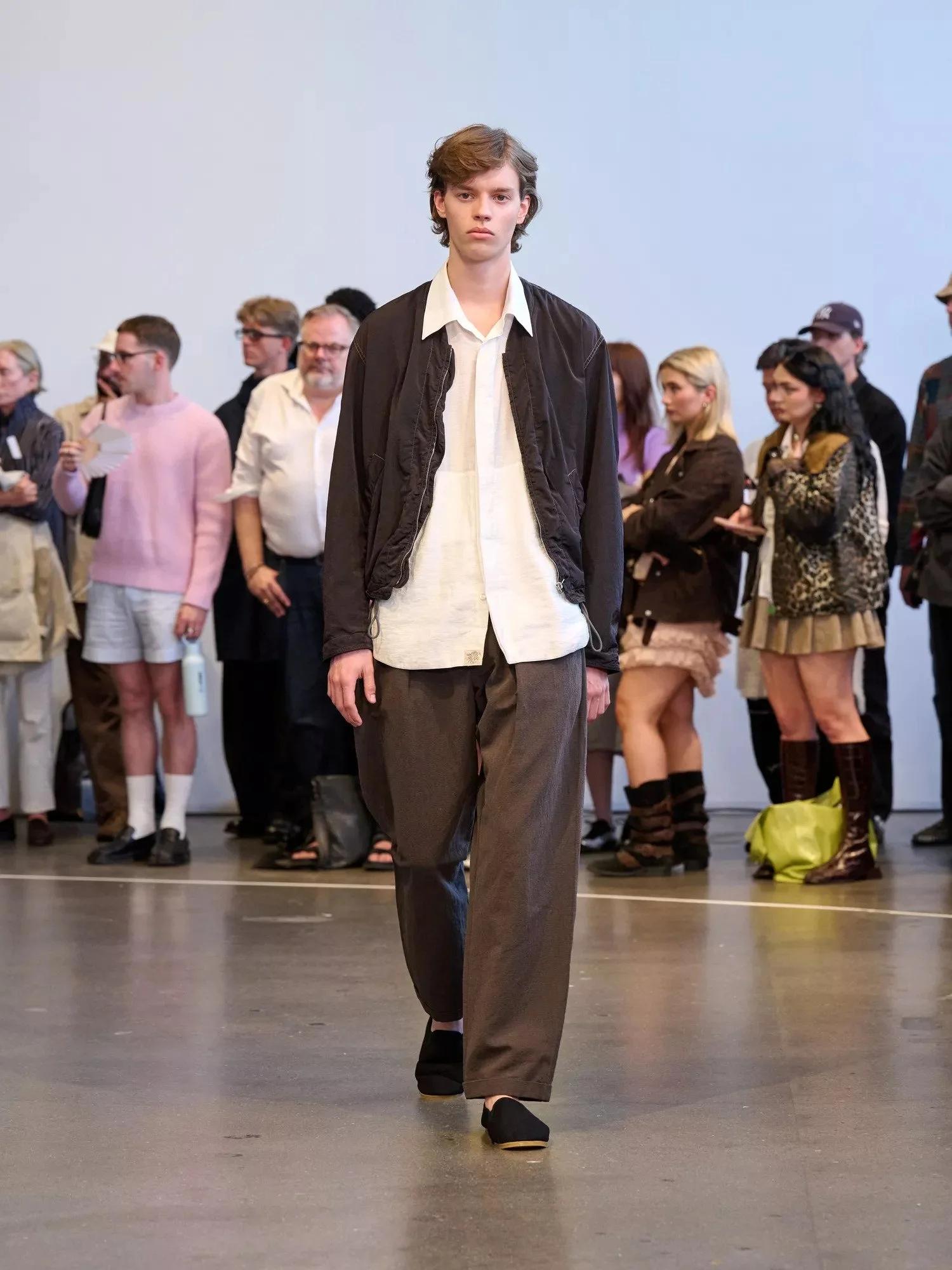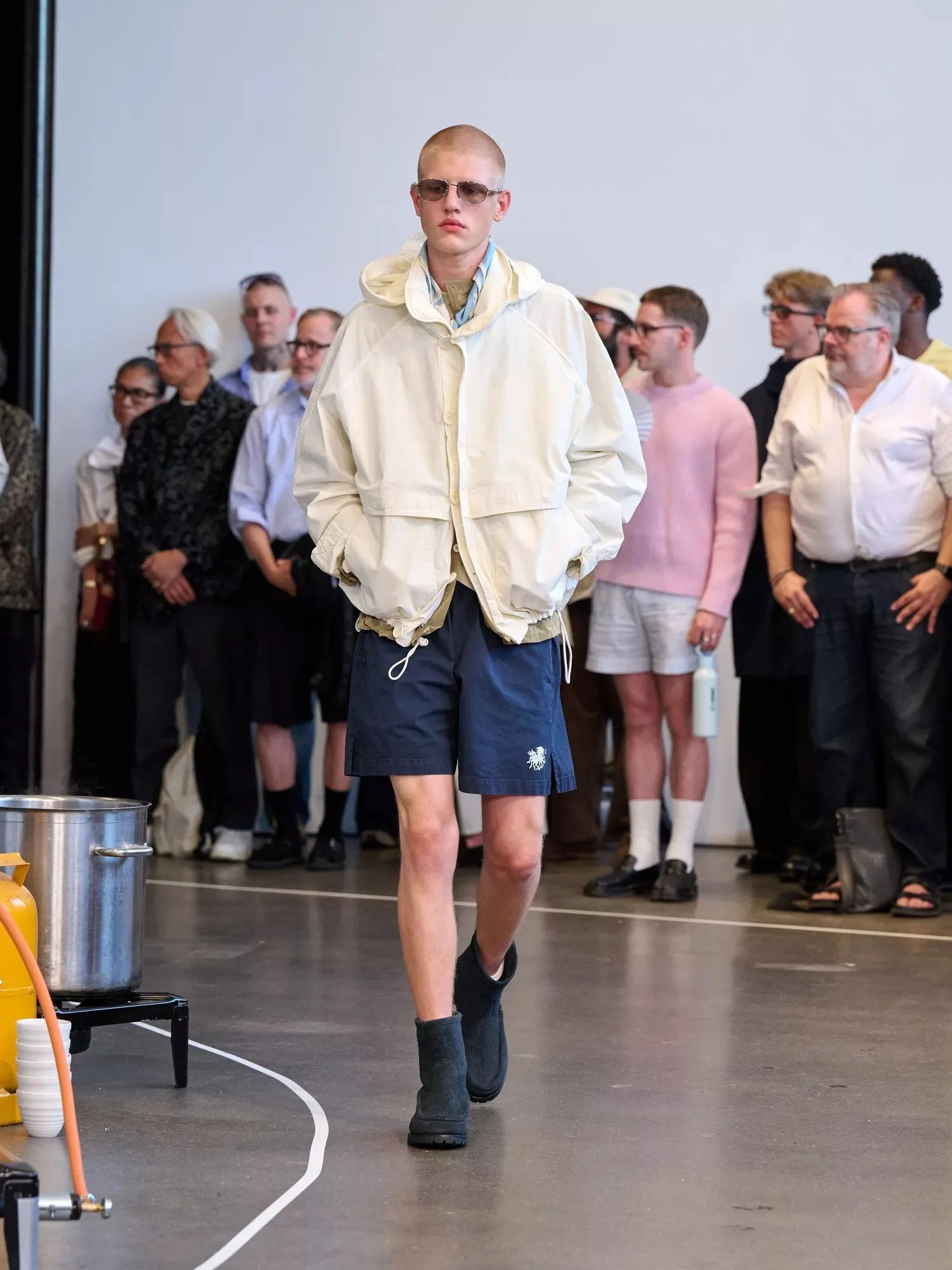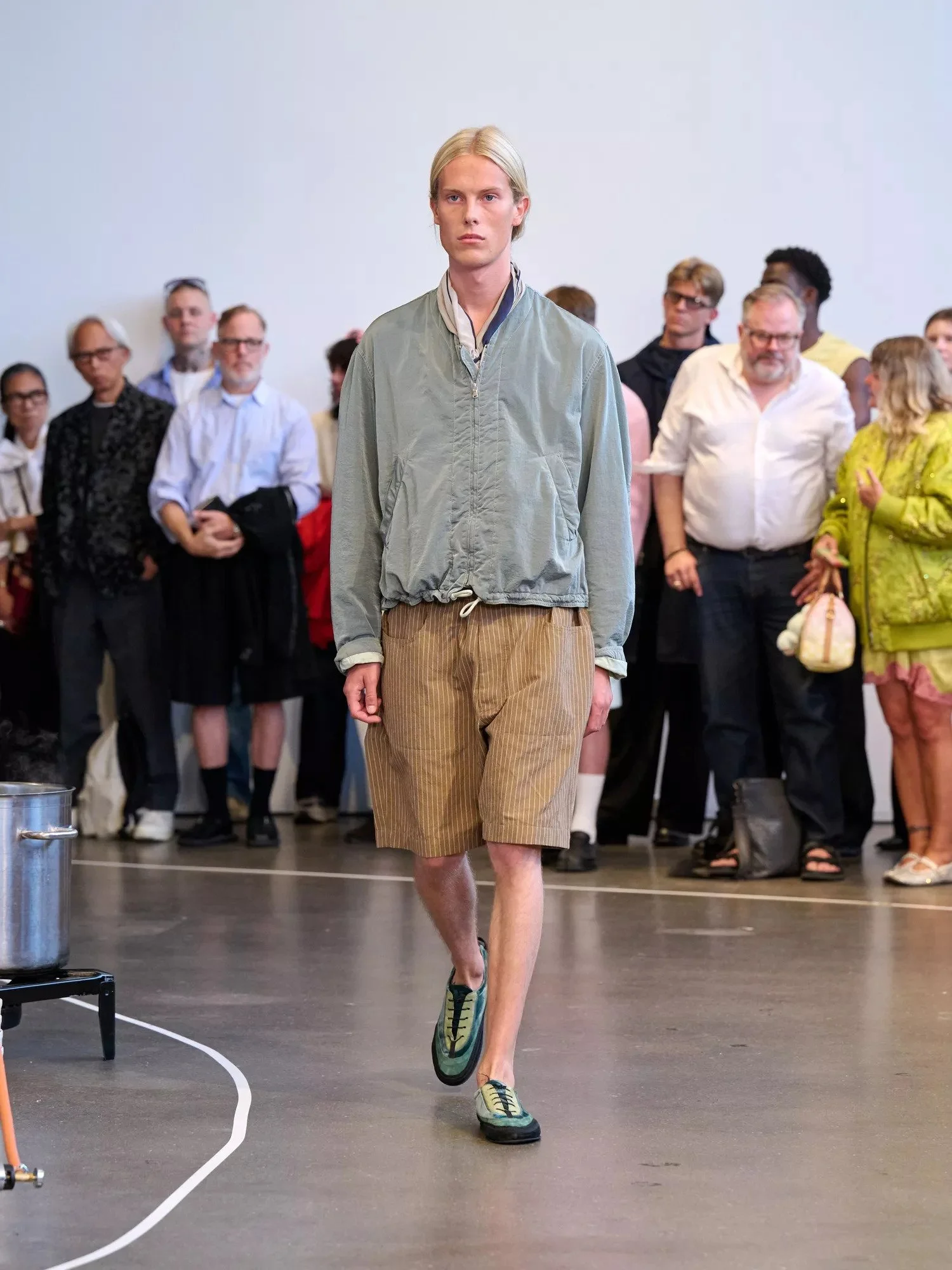 Spring/Summer ‘26 quickly becomes a quiet metaphor for observing the end of Winter and embracing what lies ahead: potential, life, growth, and light. From concept to material choice, design to styling, every decision is intentionally rooted in storytelling, going beyond producing clothing just for the sake of it and using it as a vessel for the culture and history of Ranra’s native Iceland. This subtlety powered the collection, challenging the notion of a traditional runway show as models moved freely through the space, as press and onlookers watched just meters away. Leather jackets adopted deep, earthy tones, mirroring the soil of their native landscape - a starting point for life - while airy silhouettes crafted from cotton-linen and silk-ripstop shorts mirrored the sweeping caresses of the wind, a force vital for growth. Woollen sweaters honour traditional methods, materials, and silhouettes, while bottoms, outerwear, and shirting closely align with the brand’s modern and transitional intentions. Accompanying the apparel are several iterations of Ranra’s ‘KALT’ footwear style, born from the brand’s in-house programme and an evolution of past collaborations with the likes of Salomon.