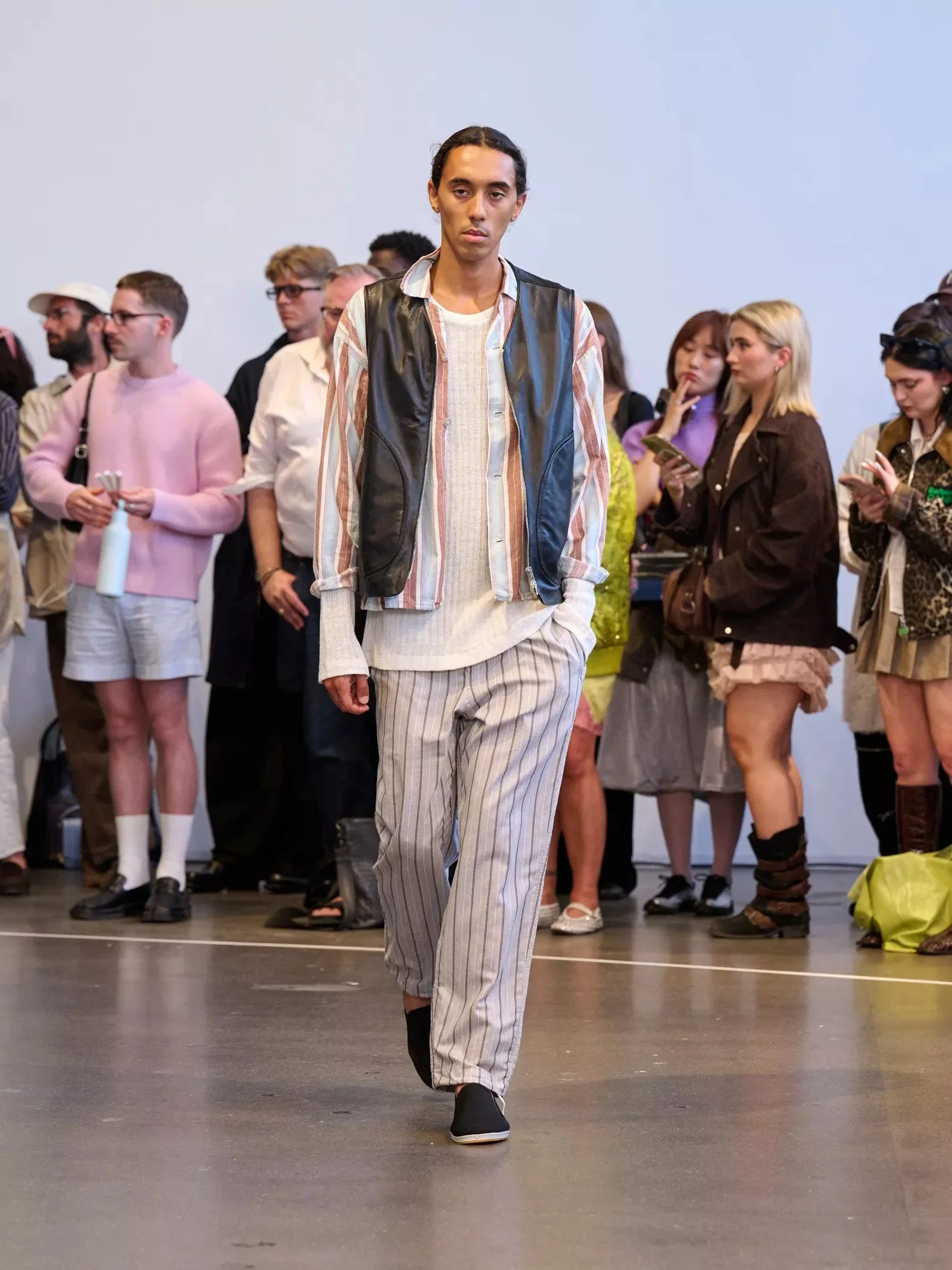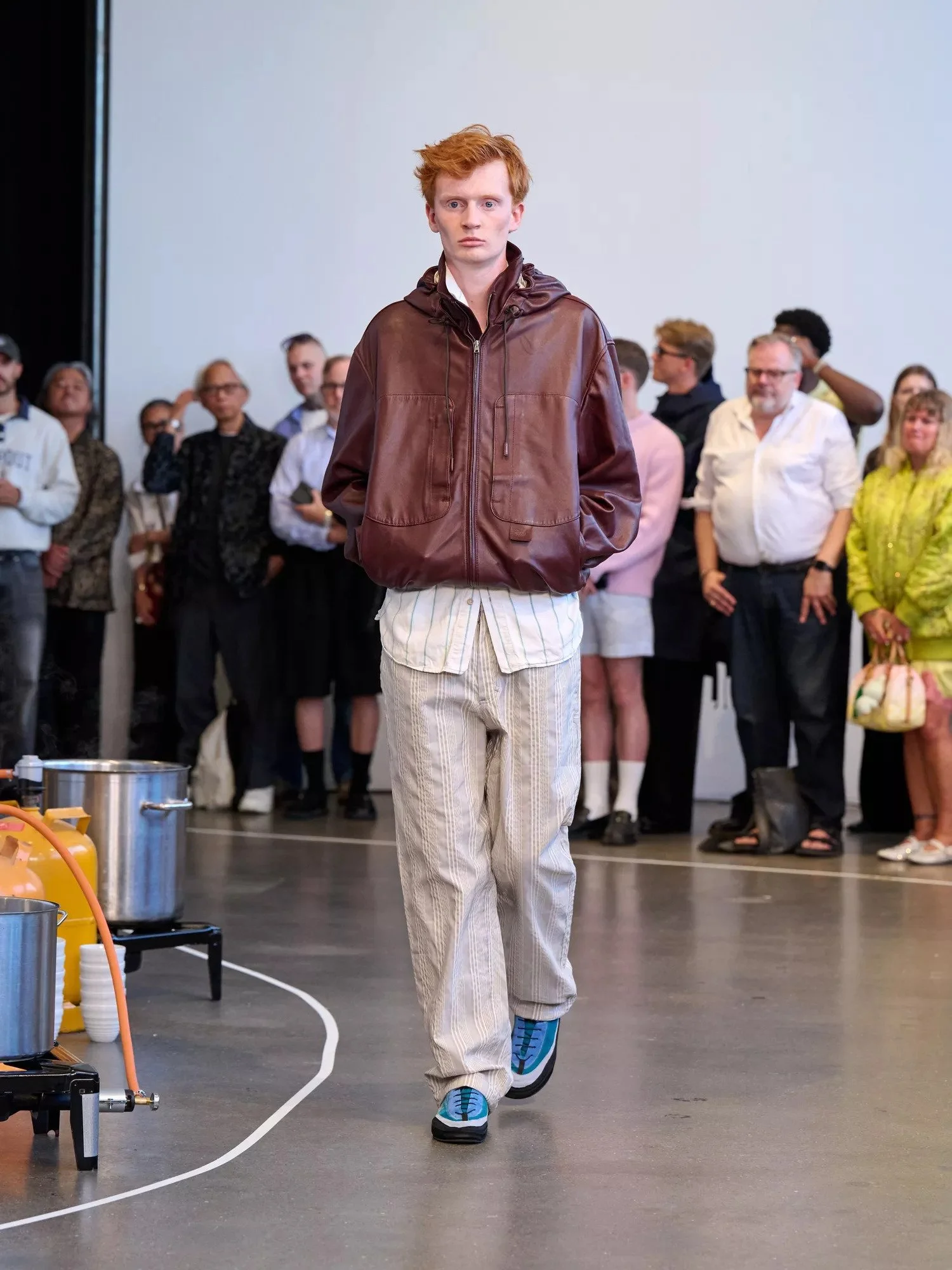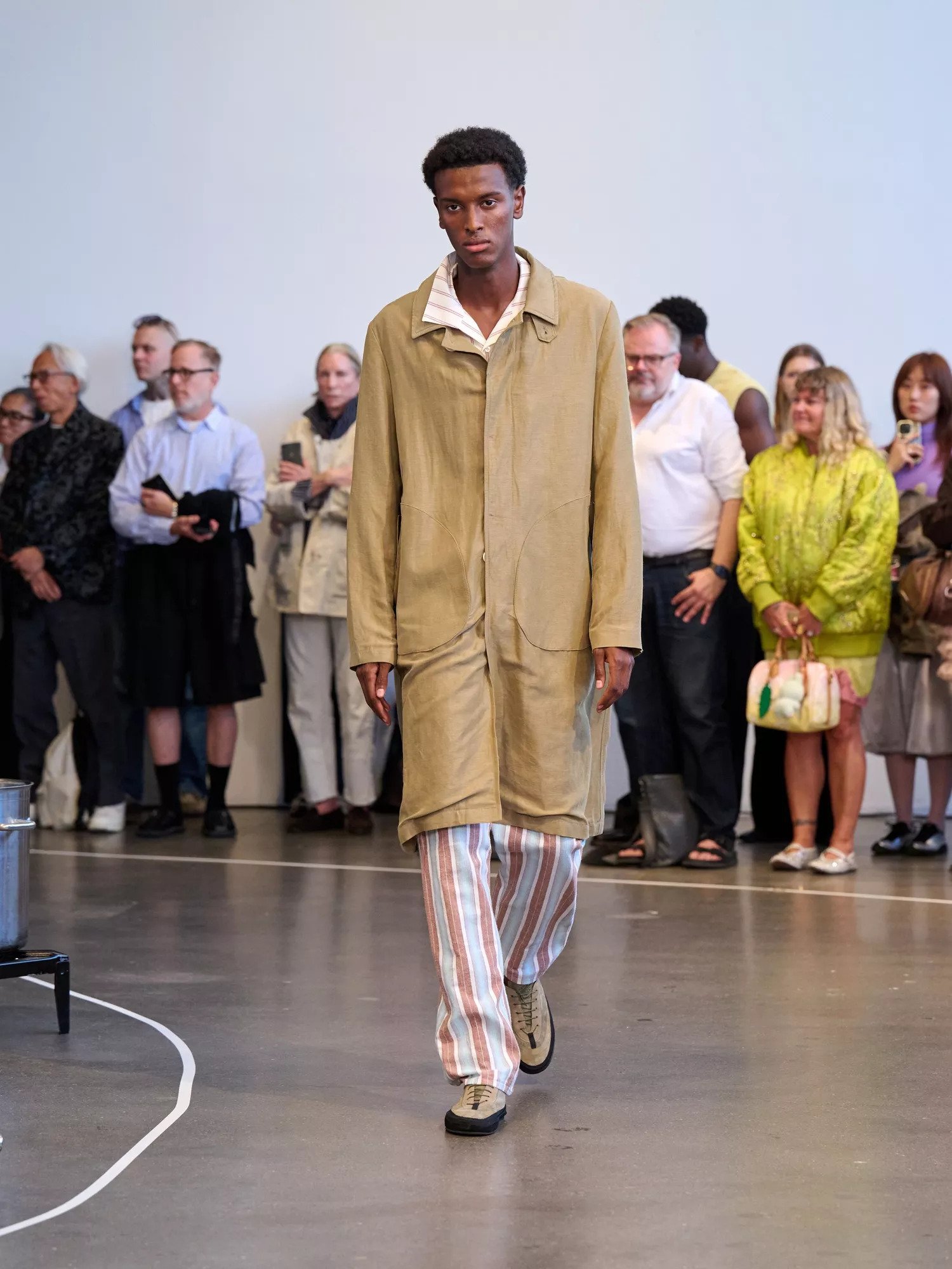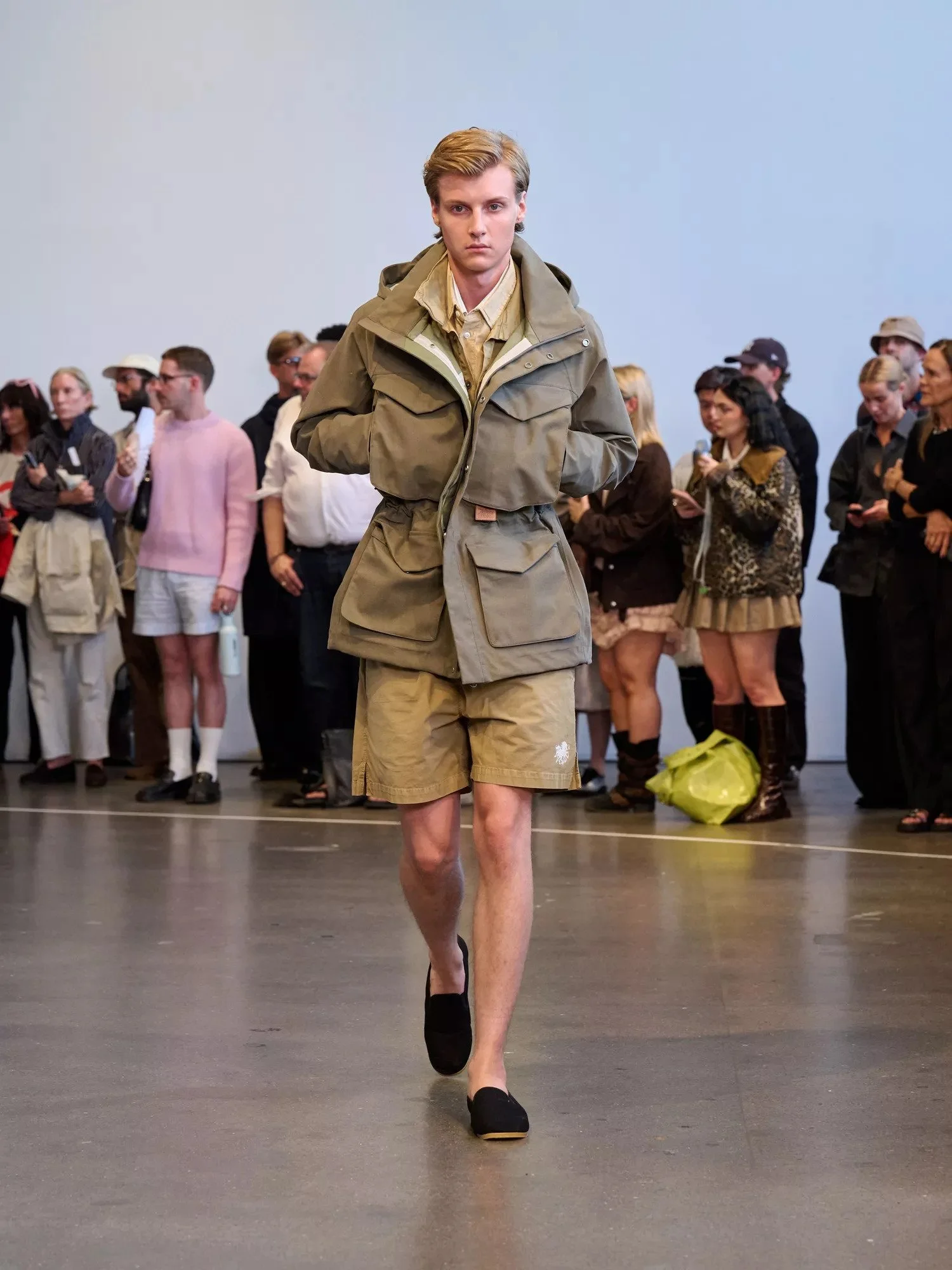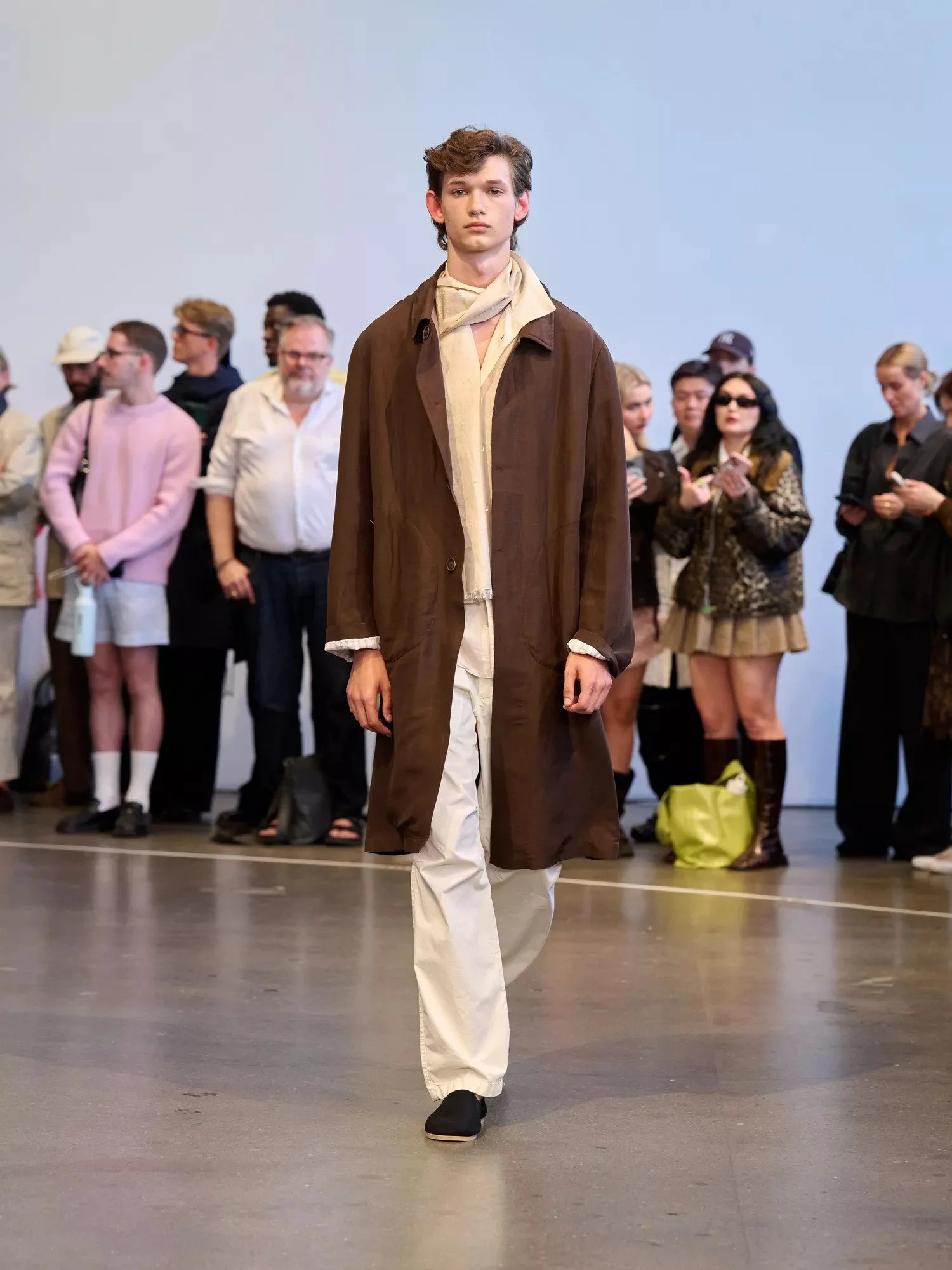 Spring/Summer ‘26 quickly becomes a quiet metaphor for observing the end of Winter and embracing what lies ahead: potential, life, growth, and light. From concept to material choice, design to styling, every decision is intentionally rooted in storytelling, going beyond producing clothing just for the sake of it and using it as a vessel for the culture and history of Ranra’s native Iceland. This subtlety powered the collection, challenging the notion of a traditional runway show as models moved freely through the space, as press and onlookers watched just meters away. Leather jackets adopted deep, earthy tones, mirroring the soil of their native landscape - a starting point for life - while airy silhouettes crafted from cotton-linen and silk-ripstop shorts mirrored the sweeping caresses of the wind, a force vital for growth. Woollen sweaters honour traditional methods, materials, and silhouettes, while bottoms, outerwear, and shirting closely align with the brand’s modern and transitional intentions. Accompanying the apparel are several iterations of Ranra’s ‘KALT’ footwear style, born from the brand’s in-house programme and an evolution of past collaborations with the likes of Salomon.