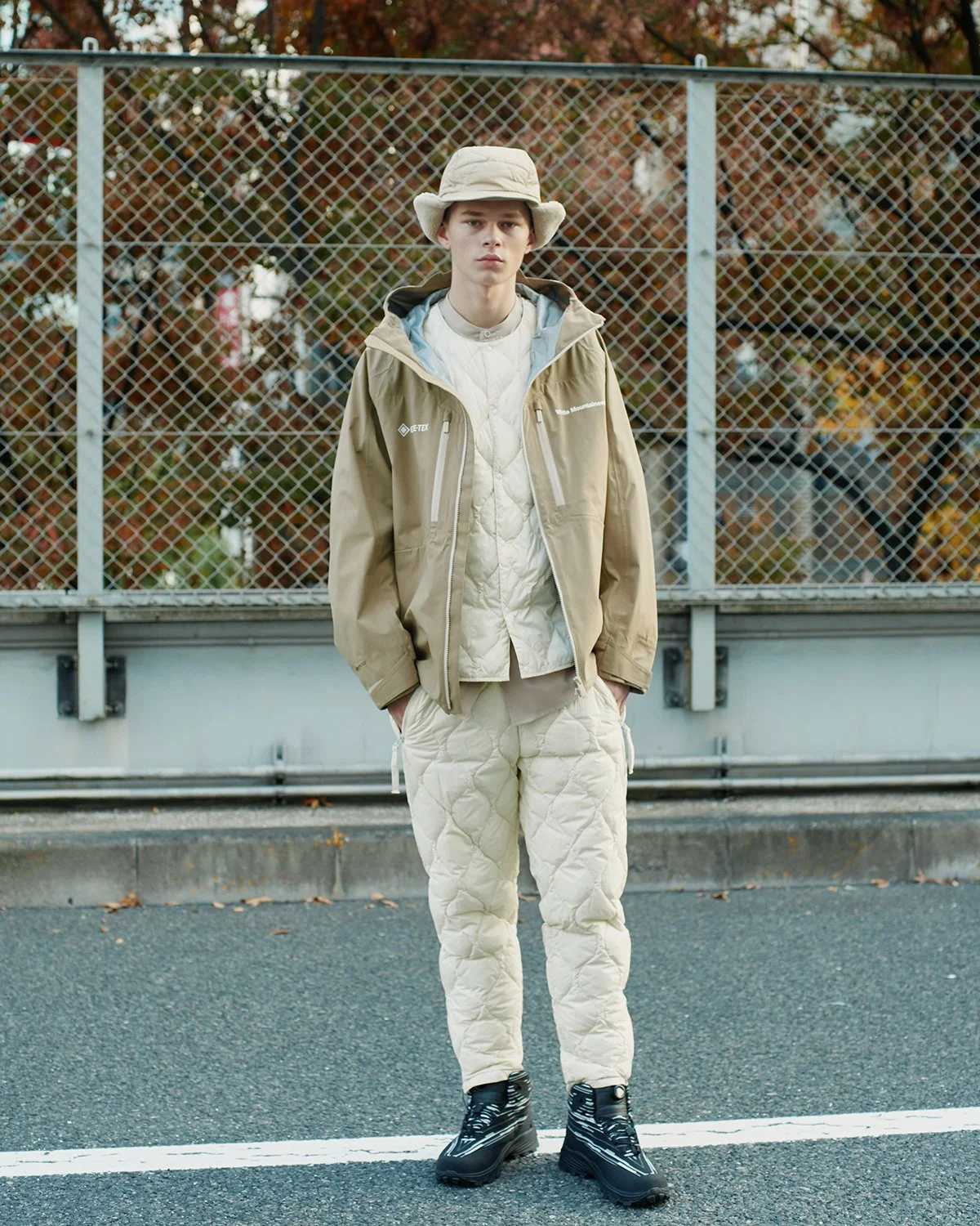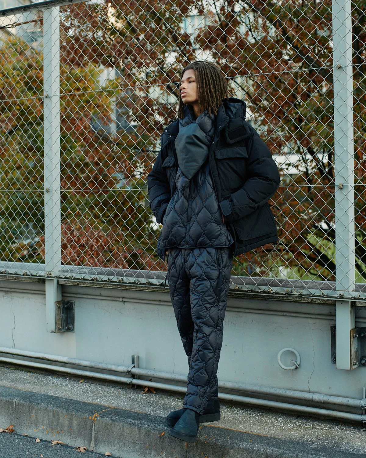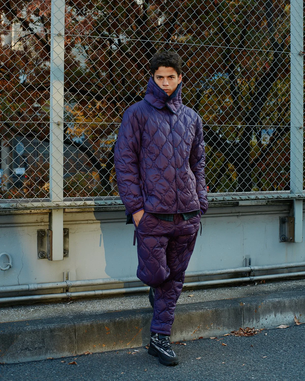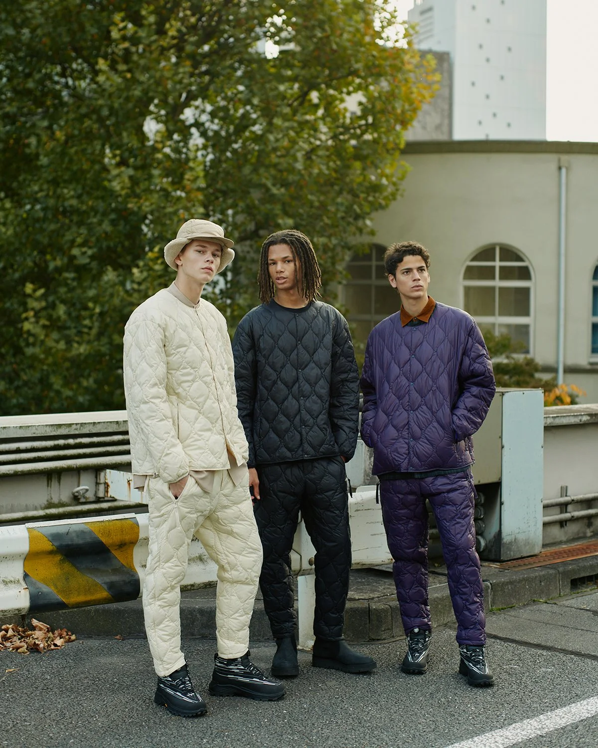 Combining Taion’s minimal and simple approach to downwear with White Mountaineering’s unique perspective on functionality, the duo has created a two-piece set: a light down and down pants. Both pieces celebrate the versatility of Taion’s down technology, and can be worn individually or as part of a set depending on the conditions and preference. As expected, every piece offers reliable warmth. There are three colourways available: purple, black, and cream.
