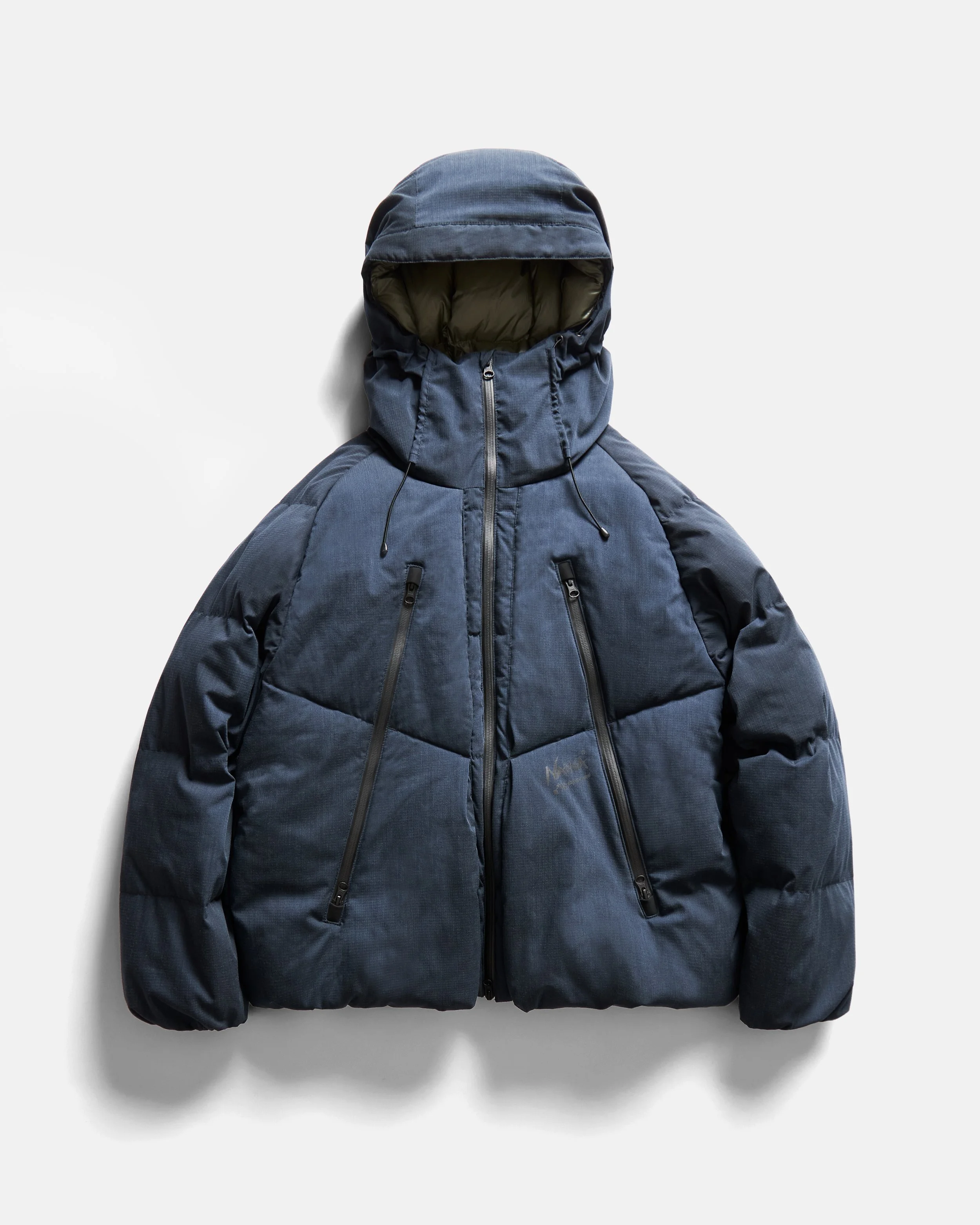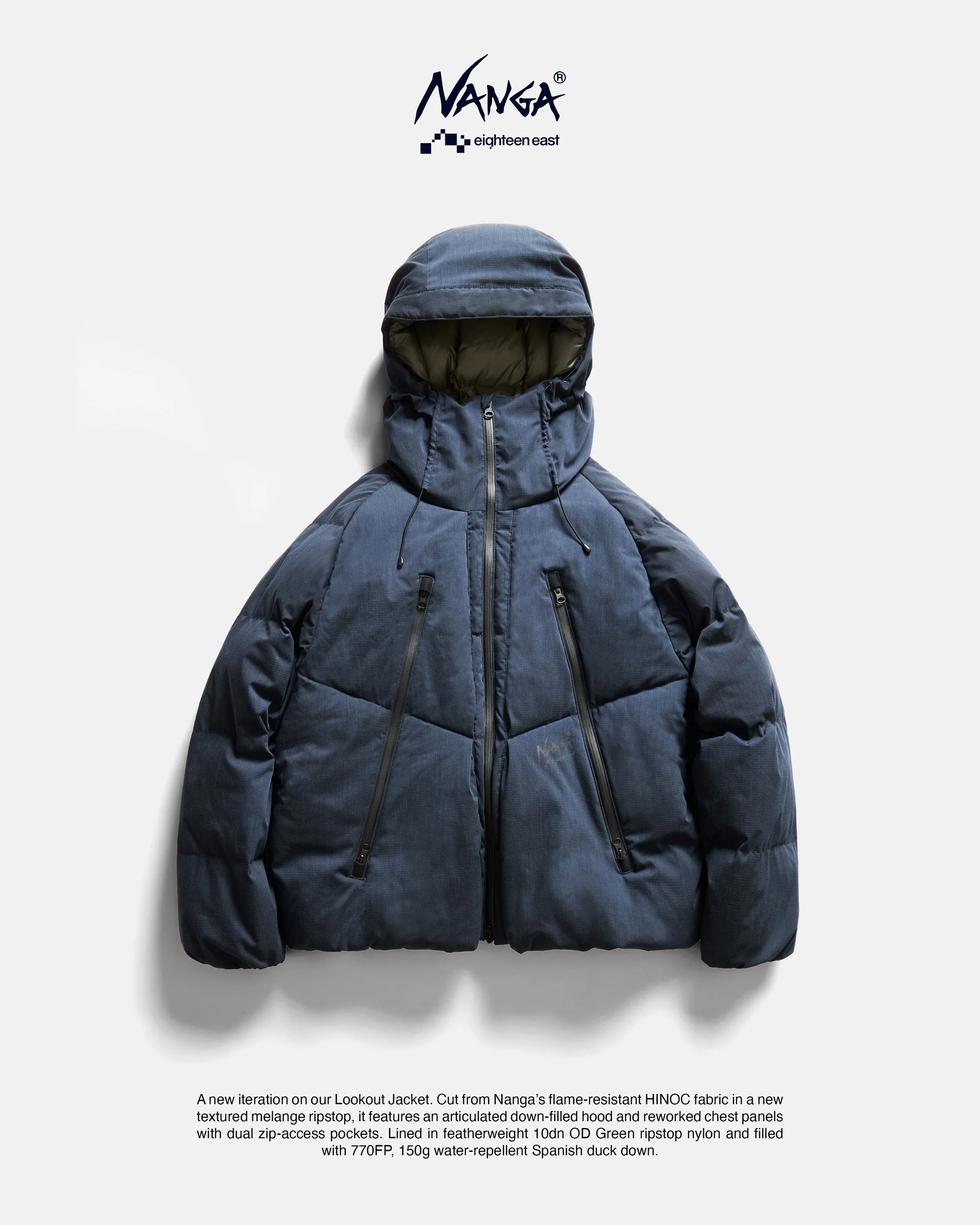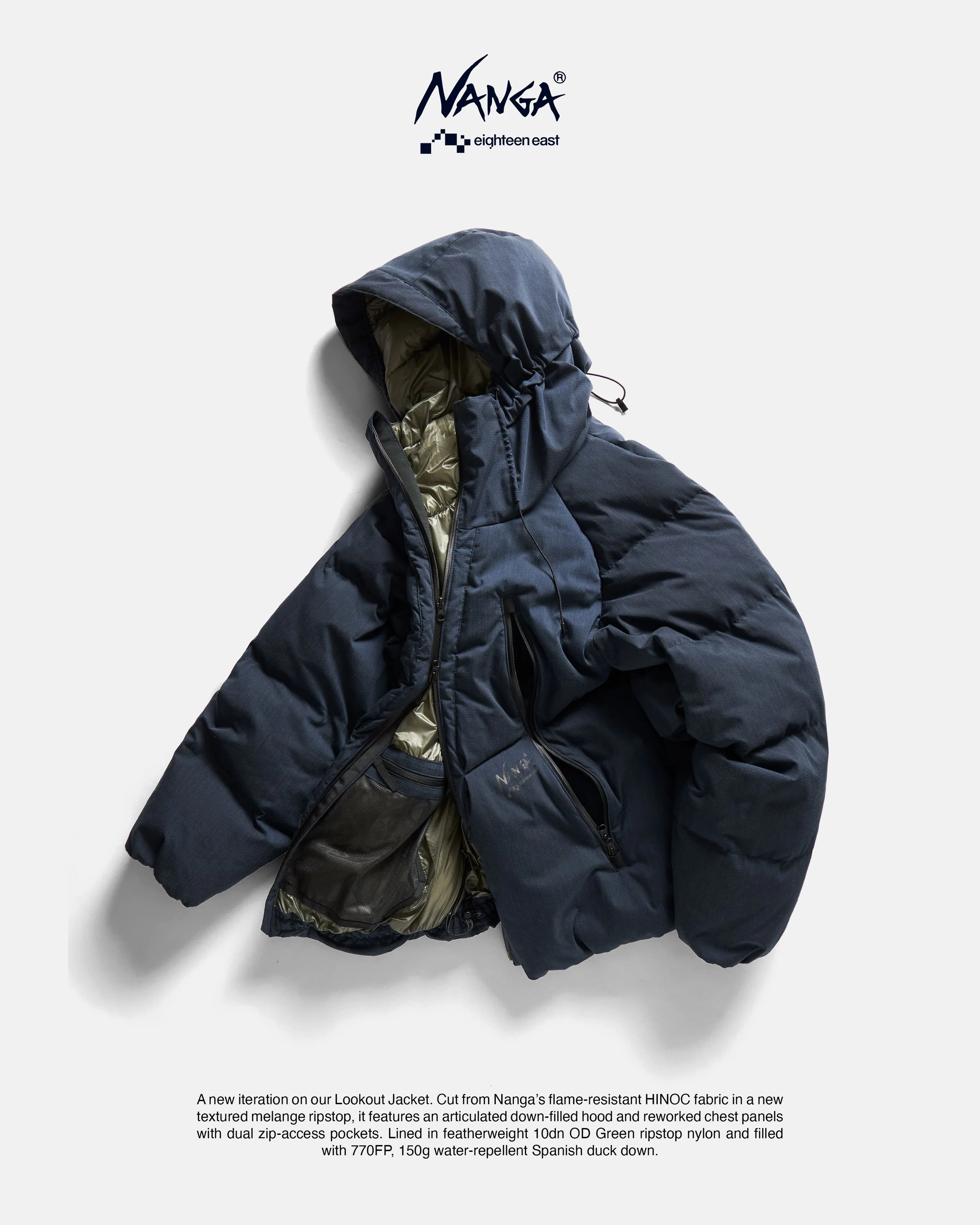 For Winter ‘25, the duo double-downs on their initial outerwear silhouette, the Lookout Jacket, with some updates to design and materiality. The jacket was built from the ground up, starting with NANGA’s flame-resistant aramid fabric, now called HINOC, but the weave has been tweaked to a textured melange ripstop. Regarding the silhouette, 18 East has added an articulated down-filled hood and overhauled the exterior pocket system to feature two oversized chest panels with two interior compartments, all accessed by 2 large, heat-sealed two-way zippers. The interior is lined with ultra-lightweight ripstop nylon and insulated with 770fp water-repellent Spanish duck down. Additional features include raglan cut sleeves, elasticated cuffs, and a two-way front zipper.