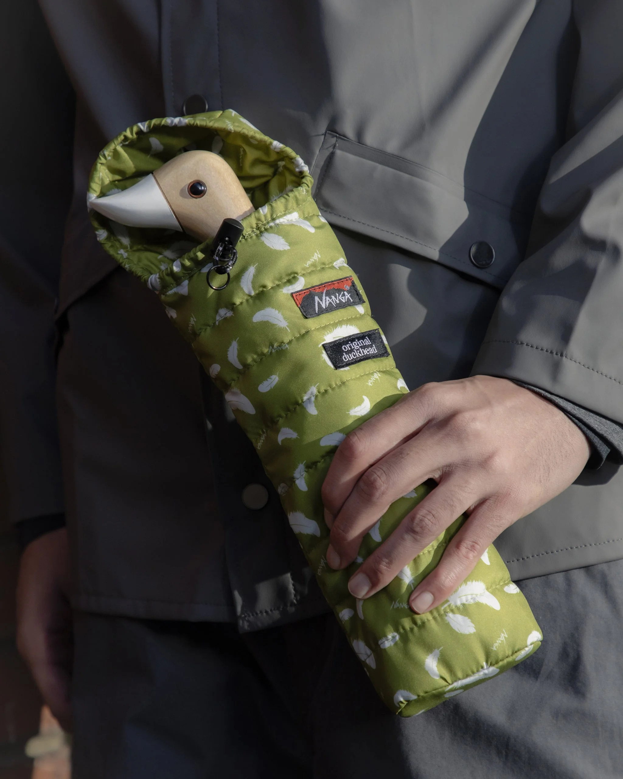 In a visit to New York in 2023, the NANGA team discovered the original Duckhead Umbrella and felt an immediate synergy between the two brands, finding a natural fit and basis for collaboration. The umbrella features a green canopy with a white, feather-inspired motif, nodding to both brands’ relationship with ducks, green hardware, and a natural wood handle. But, it doesn’t end there - the umbrella is neatly packaged in a puffy case that resembles a NANGA sleeping bag.