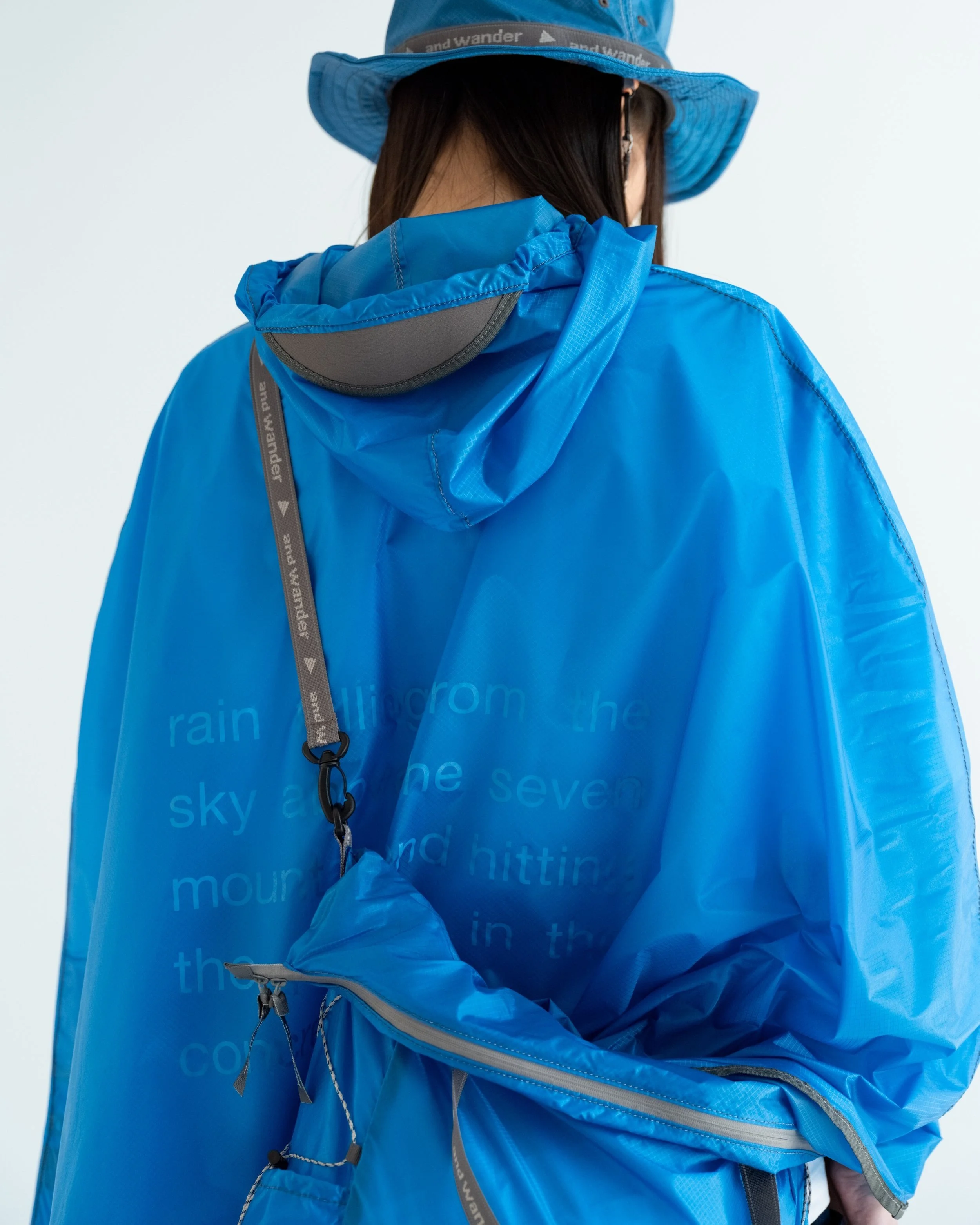 The all-blue collection takes its inspiration from the mountains surrounding the hometown of eye_C´s founder and editor-in-chief, as well as the concrete streets of Tokyo. The result is a specially dyed version of and wander’s sil Poncho and sil Tote Bag which is constructed of INVISTA's durable 30D CORDURA nylon material which is resistant to abrasion, tearing, and wear, and has excellent water repellency and water resistance of over 1000mm due to its silicone coating.