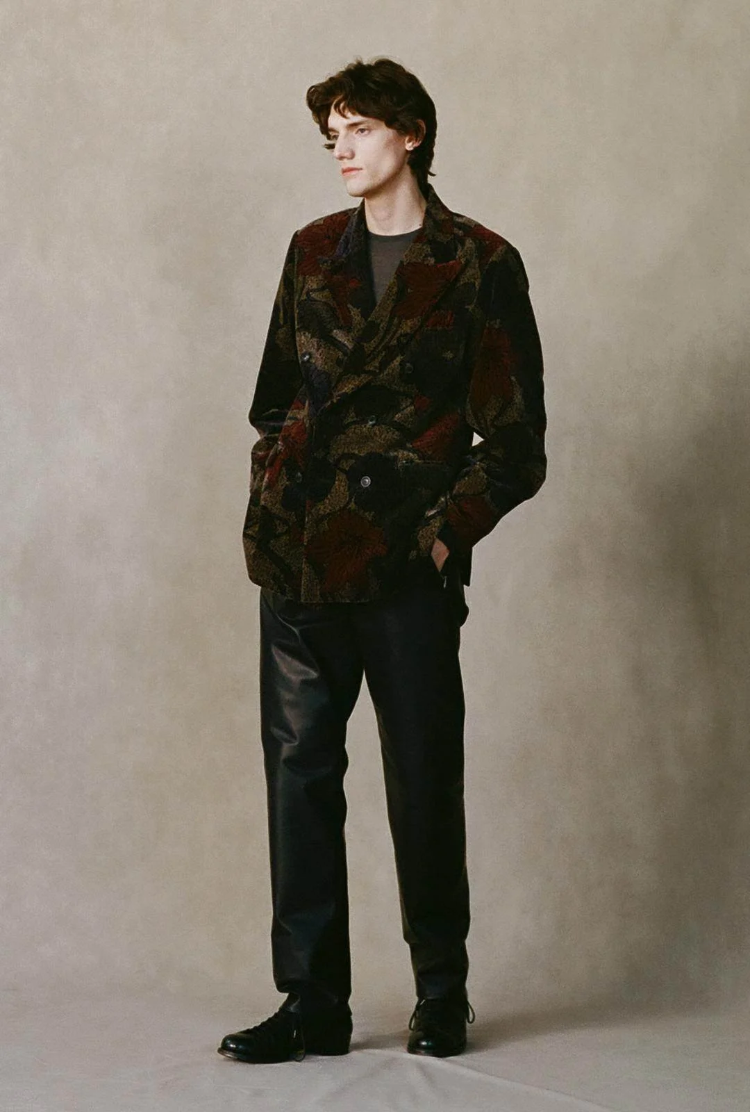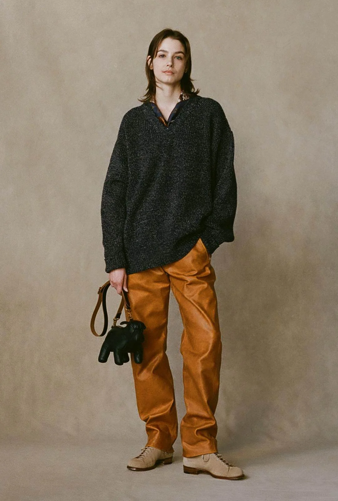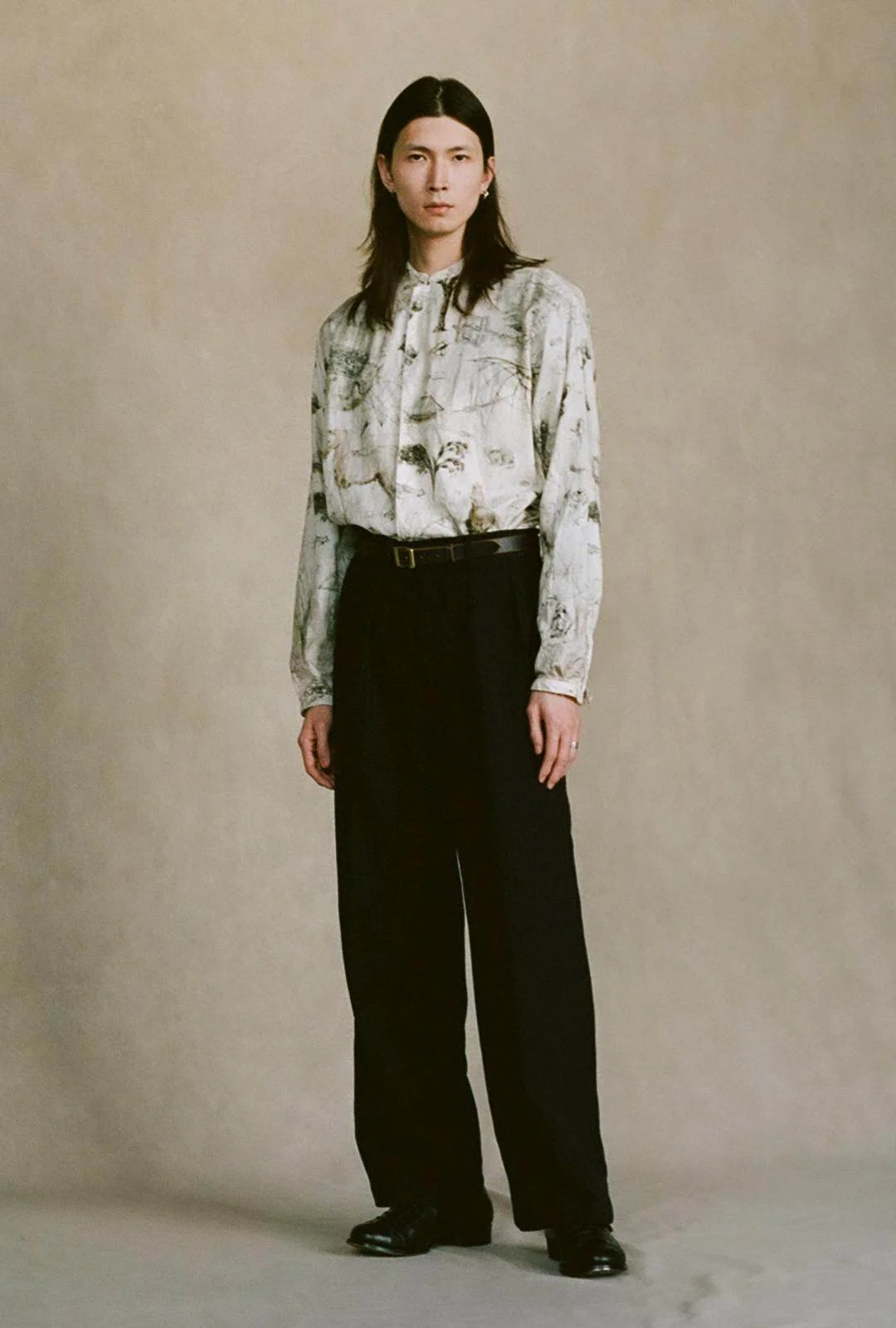 Since its inception, the Japanese label has paved its own path, creating a sense of identity that is not bound by conventions or expectations. Its Autumn/Winter ‘25-26 collection, titled ‘Fictional Identities’, channels this by weaving character into each garment without losing sight of the brand’s intentions or aesthetic. Each product category is equipped with a cacophony of diverse pieces, across knitwear, shirting, leather goods, outerwear, and footwear, among others. Starting with outerwear, one of NICENESS’ fields of expertise, heavy floral fleece jackets, duffle coats, and long leather jackets front the selection. Similarly, its legwear offering consists of bottoms constructed from a mix of fabrics, experimenting with texture, and failing to conform to a single, defining shape - wide and slim are both appreciated. Bags are crafted from leather and take the form of playful canine silhouettes as well as weekend bags and leather totes with handles. Shirting and tops are complete with button-down checked shirts with chest pockets and daring Western-inspired prints. Knitwear plays a critical role in the collection, with button-up sweaters and mock necks acting as layering tools in transitional weather.