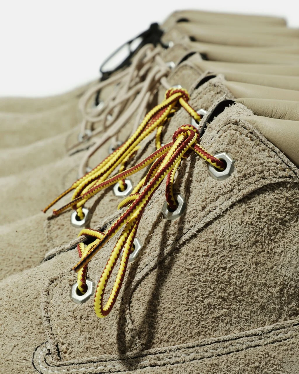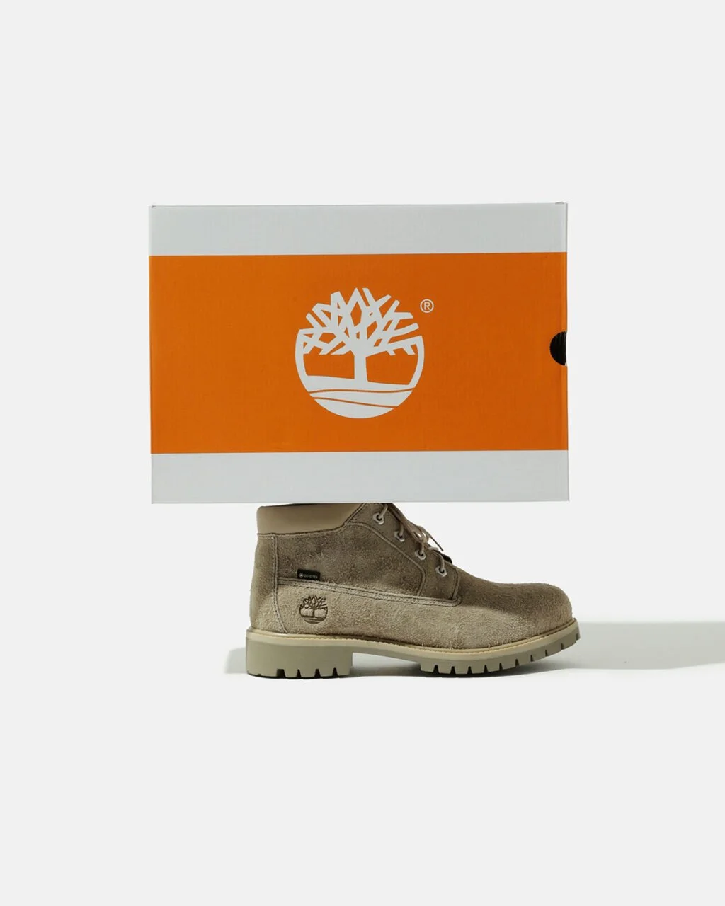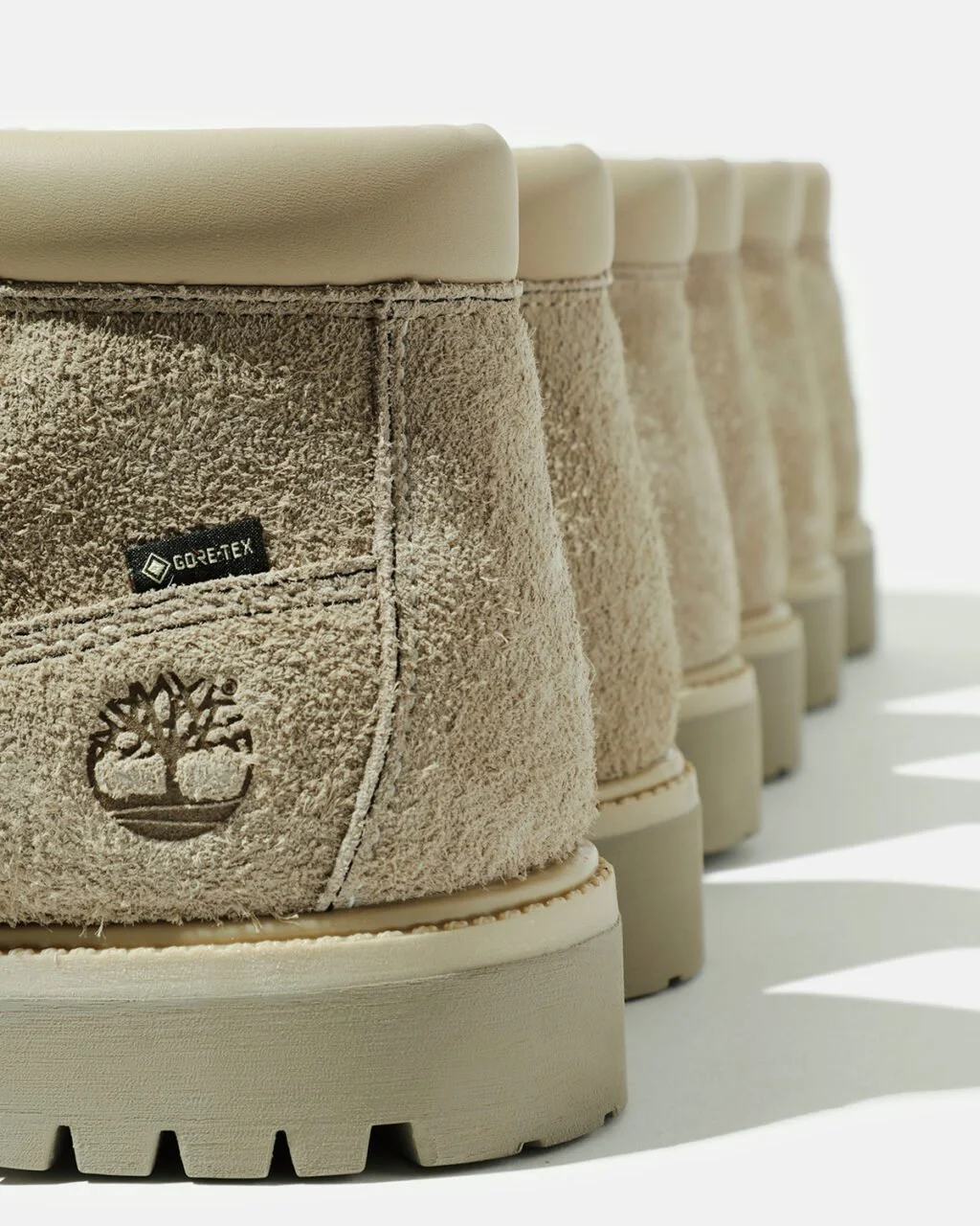Modelled on Timberland’s ‘Waterproof Chukka Boot’, the Chukka Boot Vibram GTX maintains the boot’s original components while incorporating elements unique to this collaborative series, such as a textured long-pile suede upper and two-tone white and black stitching. For the first time in its lineage, Timberland’s Chukka Boot will be made waterproof courtesy of an integrated GORE-TEX membrane. Bolstering its performance, a Vibram compound is fitted to the outsole, increasing traction on wet and dry surfaces. To complement or contrast the tan suede upper, the boot comes with three different coloured laces.