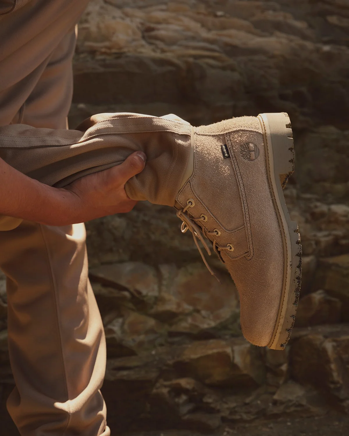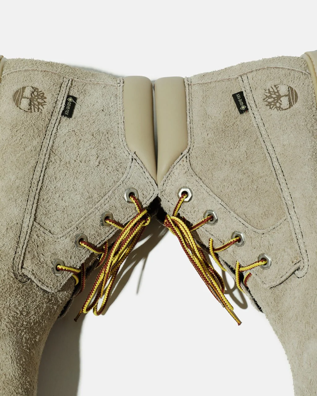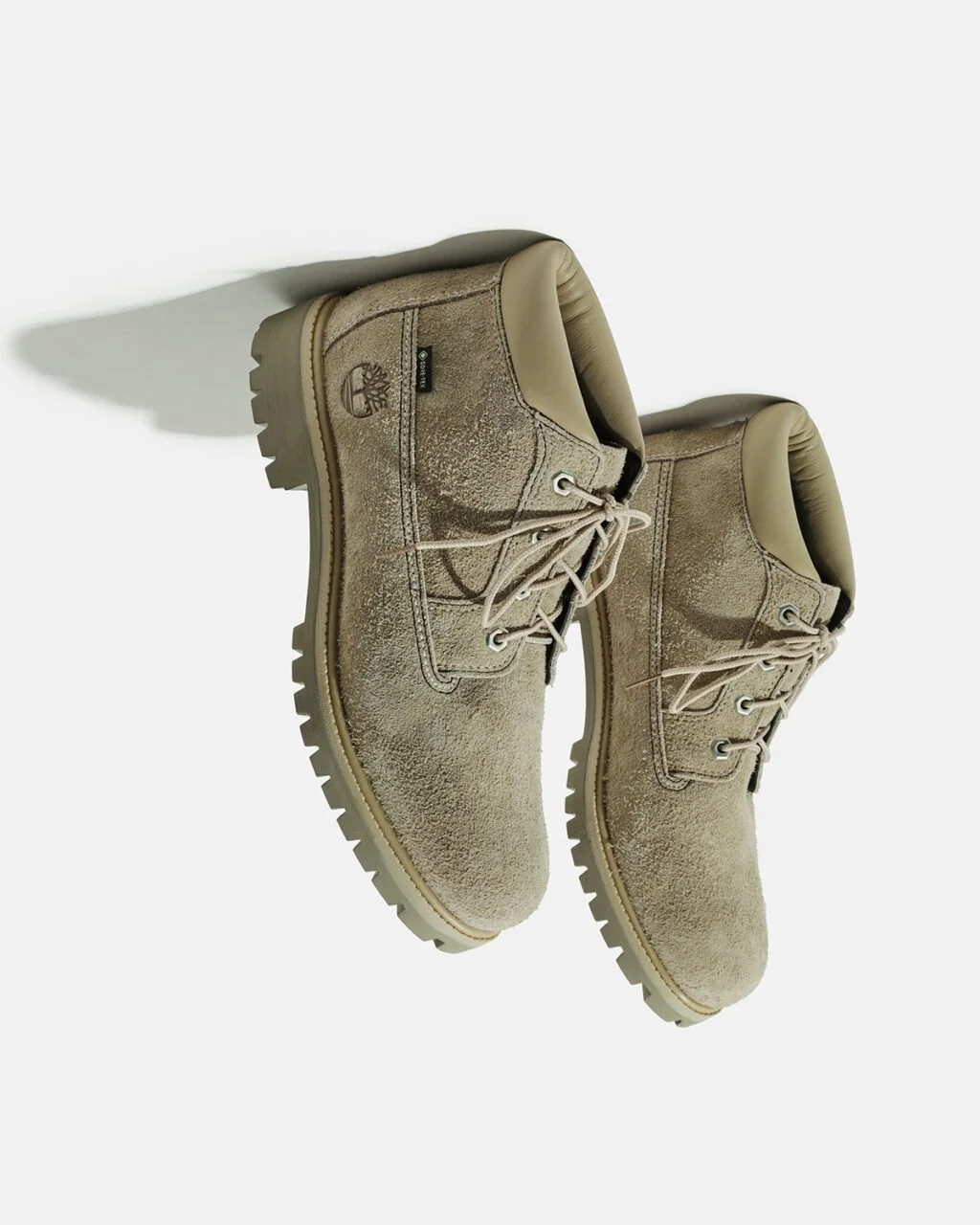 Modelled on Timberland’s ‘Waterproof Chukka Boot’, the Chukka Boot Vibram GTX maintains the boot’s original components while incorporating elements unique to this collaborative series, such as a textured long-pile suede upper and two-tone white and black stitching. For the first time in its lineage, Timberland’s Chukka Boot will be made waterproof courtesy of an integrated GORE-TEX membrane. Bolstering its performance, a Vibram compound is fitted to the outsole, increasing traction on wet and dry surfaces. To complement or contrast the tan suede upper, the boot comes with three different coloured laces.