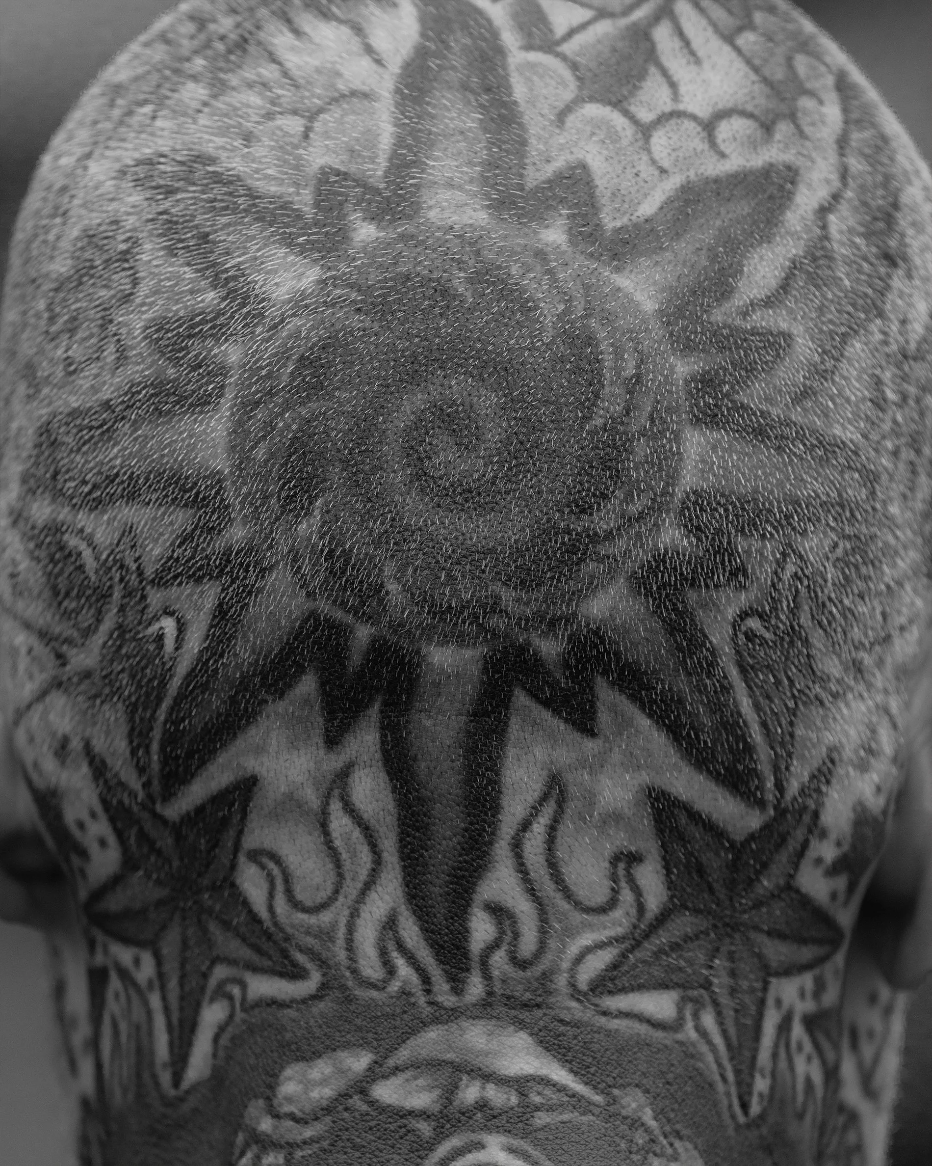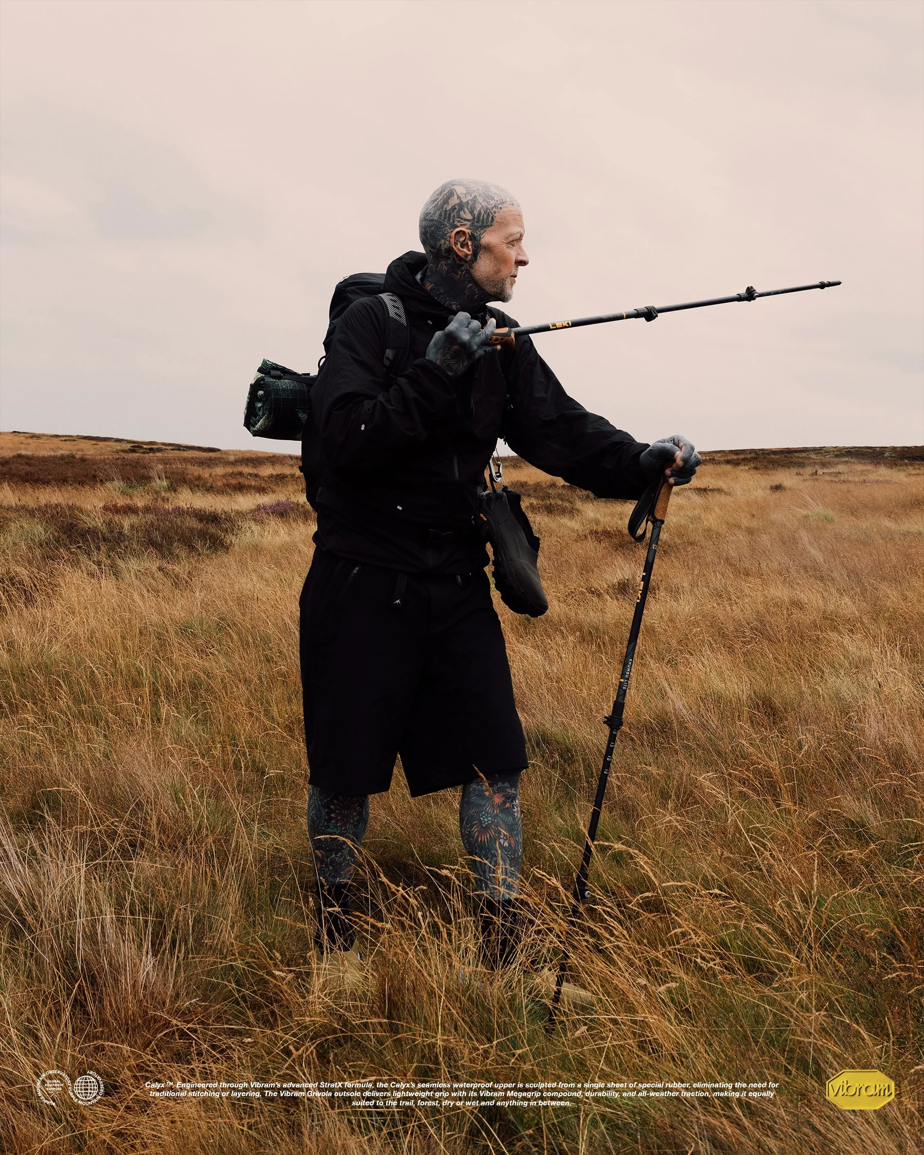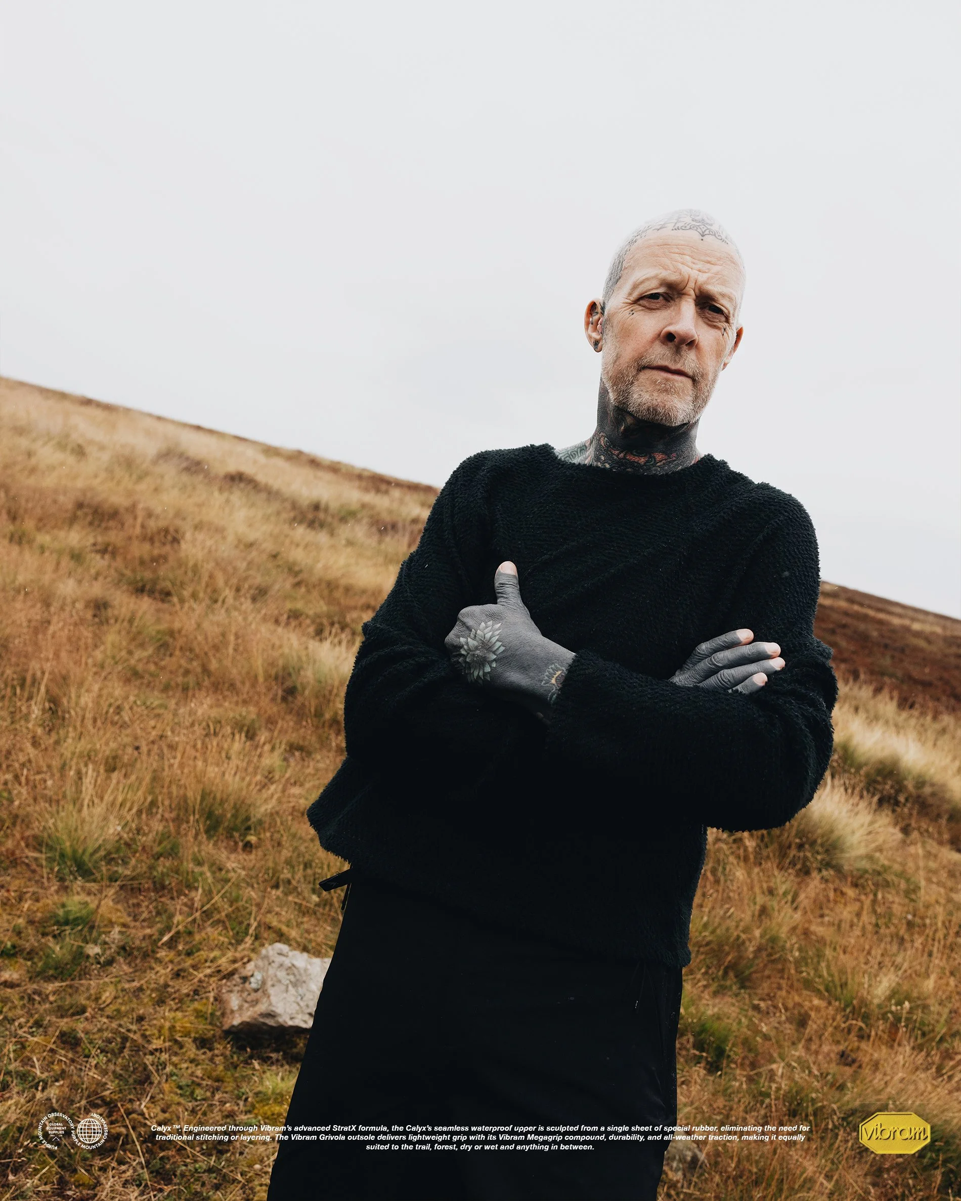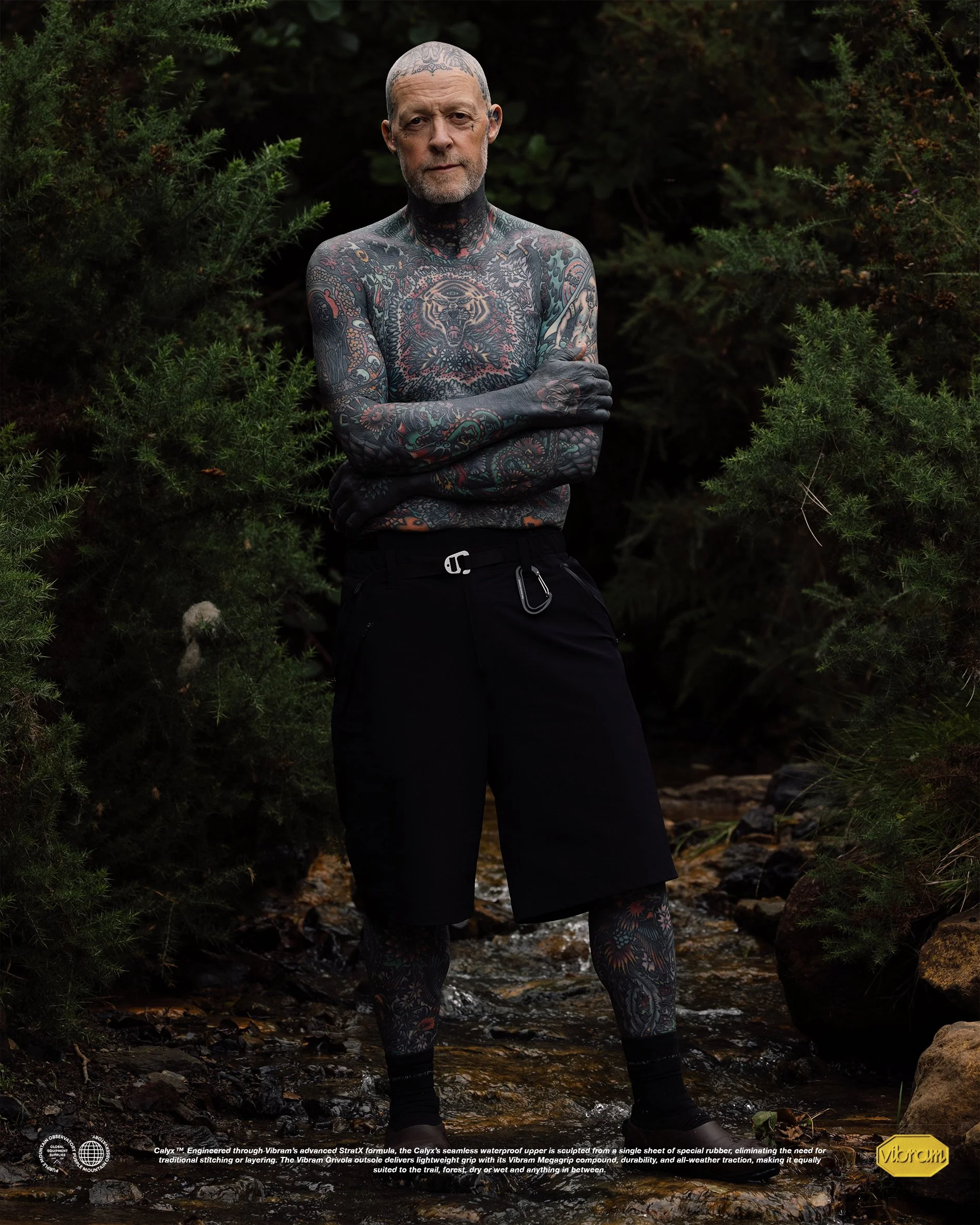 The star of the lookbook is tattooist and hiker Alex Coates, covered from head to toe in ink. On his hikes, Alex often finds ram skulls, symbolic relics that become props in the imagery, connecting Alex’s body to the landscapes he moves through.