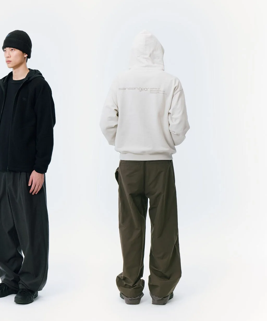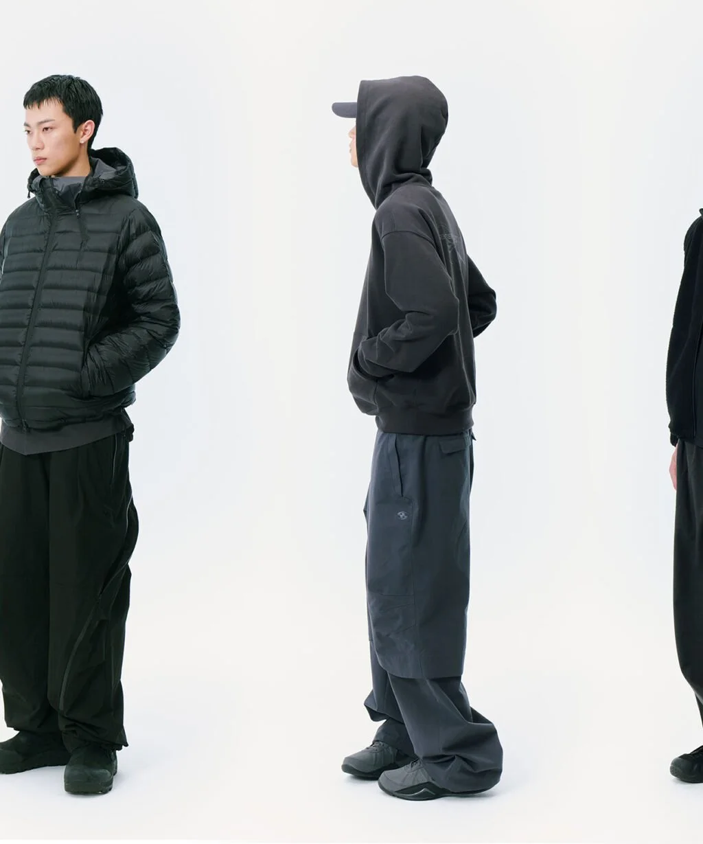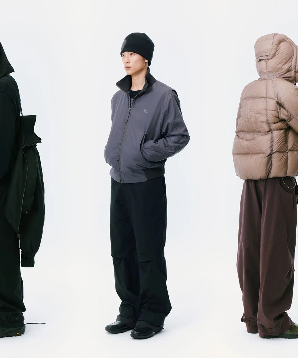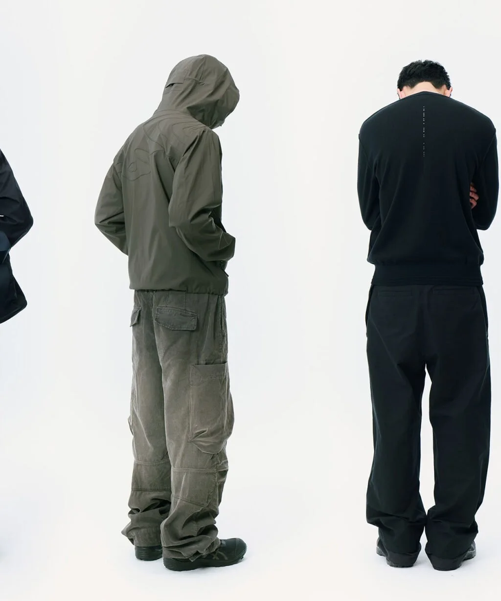 As time wears on for the still young Korean label, each collection arrives with an imbued energy, offering silhouettes that actually feel new. This season, SAN SAN Gear presents a signature range of apparel consisting of outerwear, trousers, shirting, tops, sweats, knitwear, and accessories. There are many highlights throughout the categories, starting with outerwear, where fleece jackets feature asymmetric zippers, puffers are insulated with down for maximum warmth, and shell jackets are decorated with exterior seam taping, highlighting the unfiltered hidden functionality of weatherproof gear. The Trucker contrasts the technical landscape of Autumn/Winter, adhering to a shorter, workwear-inspired silhouette with laser-cut pockets and a clean button placket. Adhering to traditions, knitwear is constructed using a heavy cotton blend with a tight neck and slouchy shoulders, while laser-cut pockets provide a sharp balance and nod to the Korean brand’s toying between heritage and modernity. Legwear comes in many forms, with pleated wide trousers and darted pants sitting alongside lightweight trousers with snap closures and 3L taped pants. Character is achieved in the collection through over-dyed materials that offer a worn-in patina, irregularly placed zippers, raw finishing, and a cohesive colour palette.