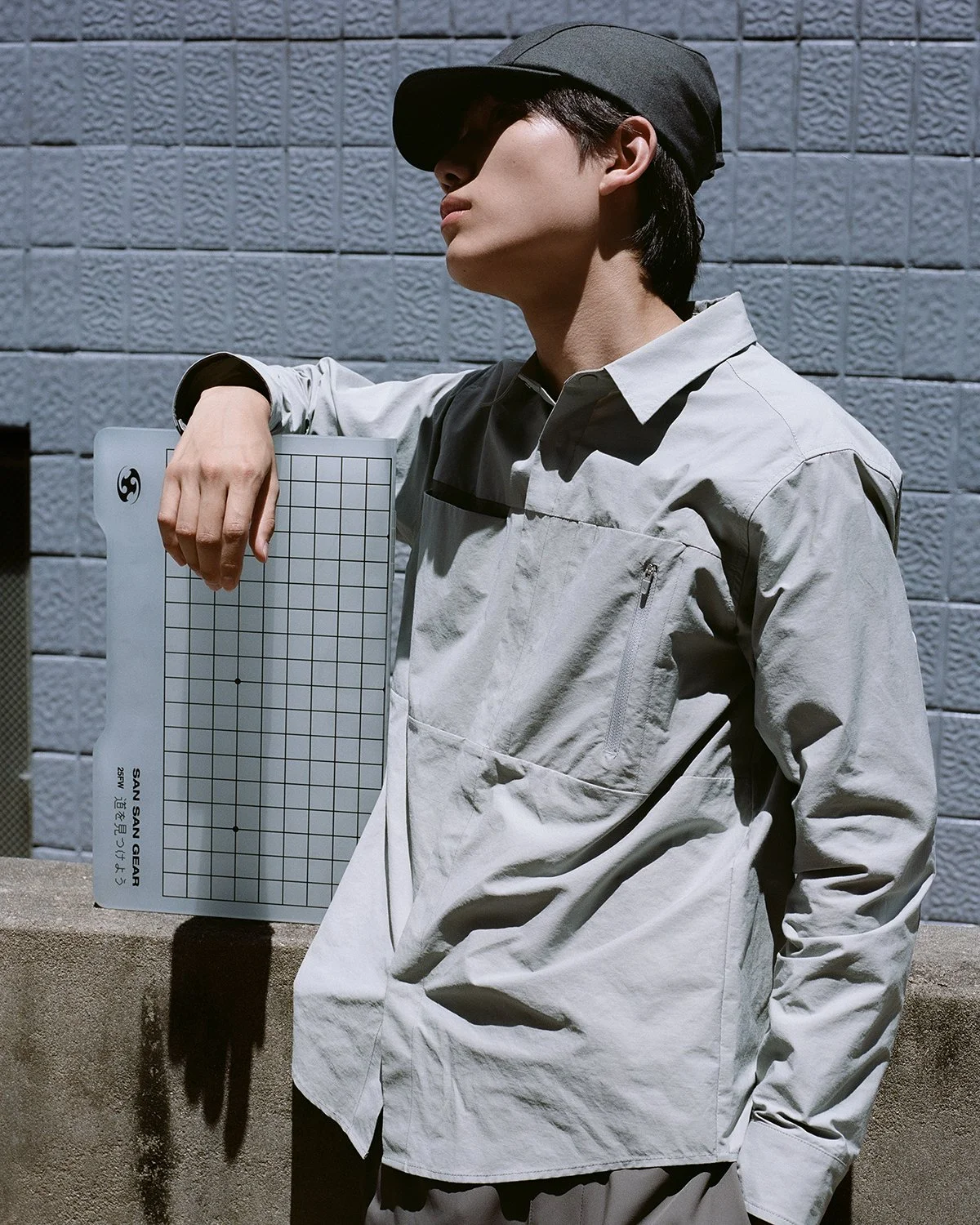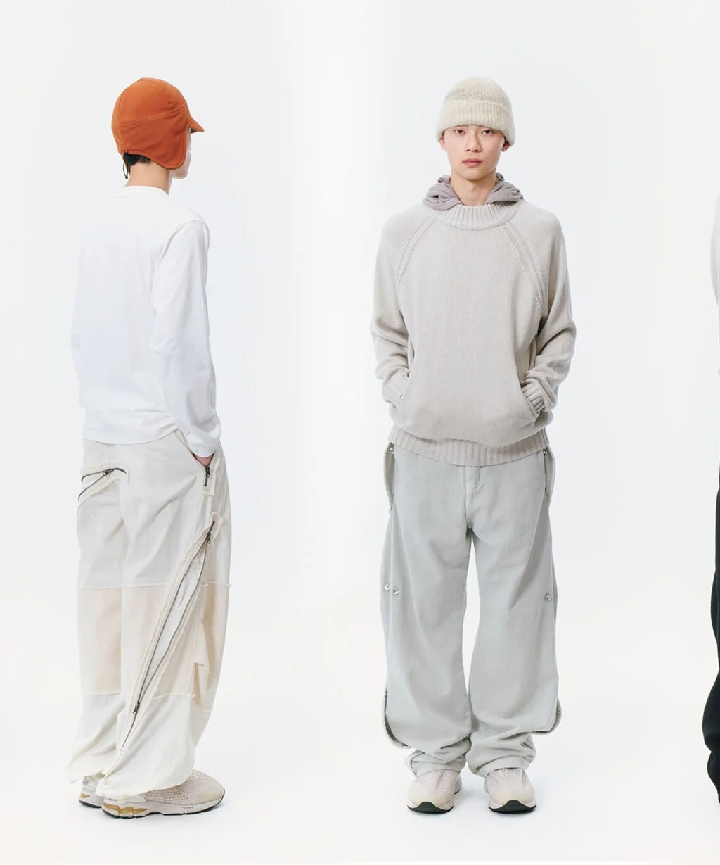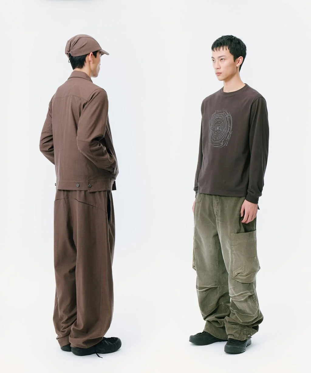 As time wears on for the still young Korean label, each collection arrives with an imbued energy, offering silhouettes that actually feel new. This season, SAN SAN Gear presents a signature range of apparel consisting of outerwear, trousers, shirting, tops, sweats, knitwear, and accessories. There are many highlights throughout the categories, starting with outerwear, where fleece jackets feature asymmetric zippers, puffers are insulated with down for maximum warmth, and shell jackets are decorated with exterior seam taping, highlighting the unfiltered hidden functionality of weatherproof gear. The Trucker contrasts the technical landscape of Autumn/Winter, adhering to a shorter, workwear-inspired silhouette with laser-cut pockets and a clean button placket. Adhering to traditions, knitwear is constructed using a heavy cotton blend with a tight neck and slouchy shoulders, while laser-cut pockets provide a sharp balance and nod to the Korean brand’s toying between heritage and modernity. Legwear comes in many forms, with pleated wide trousers and darted pants sitting alongside lightweight trousers with snap closures and 3L taped pants. Character is achieved in the collection through over-dyed materials that offer a worn-in patina, irregularly placed zippers, raw finishing, and a cohesive colour palette.