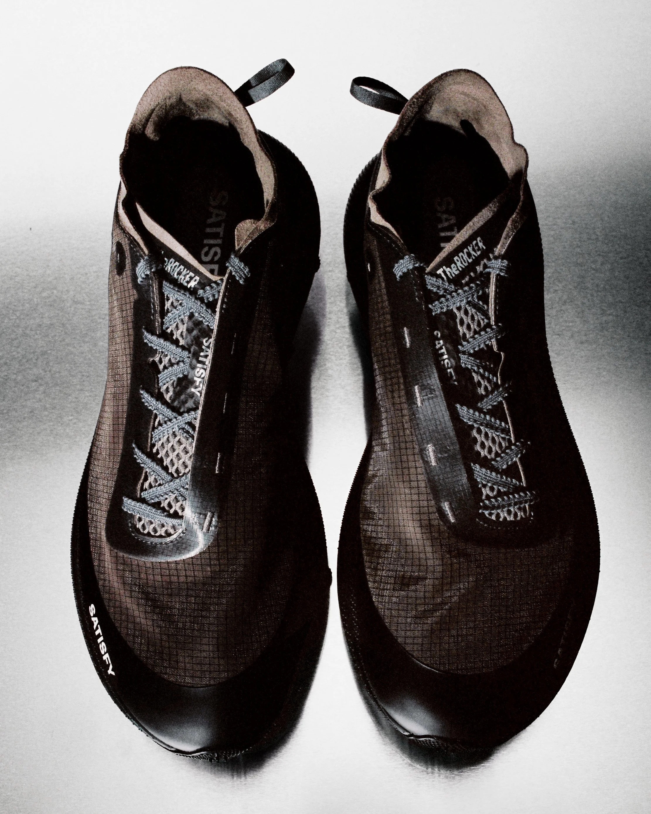 Coinciding with its meteoric rise throughout the performance running sector, Satisfy has established collaborations with adjacent partners, including Salomon, HOKA, norda, and Crocs, providing tools for endurance and recovery. Now, drawing on this knowledge and experience, the Parisian label epitomising form meets function is gearing up to release its inaugural footwear silhouette: TheROCKER, a running shoe engineered for those traversing multiple terrains.