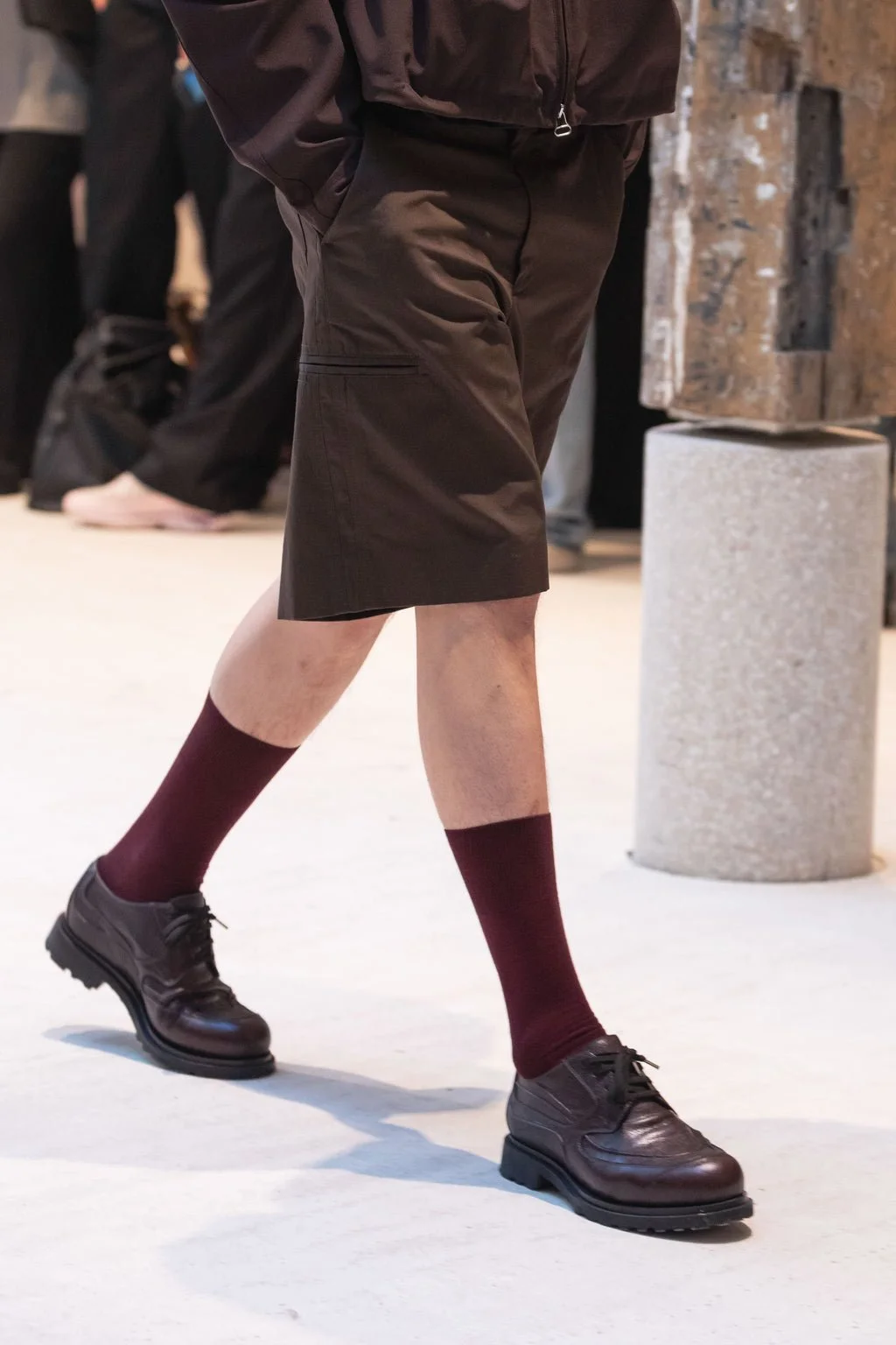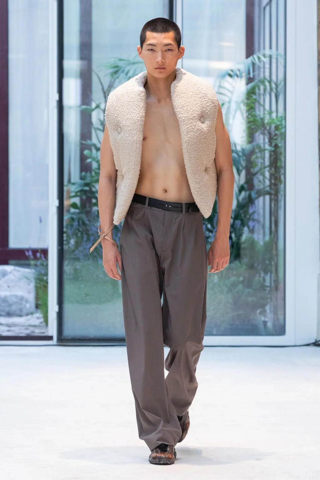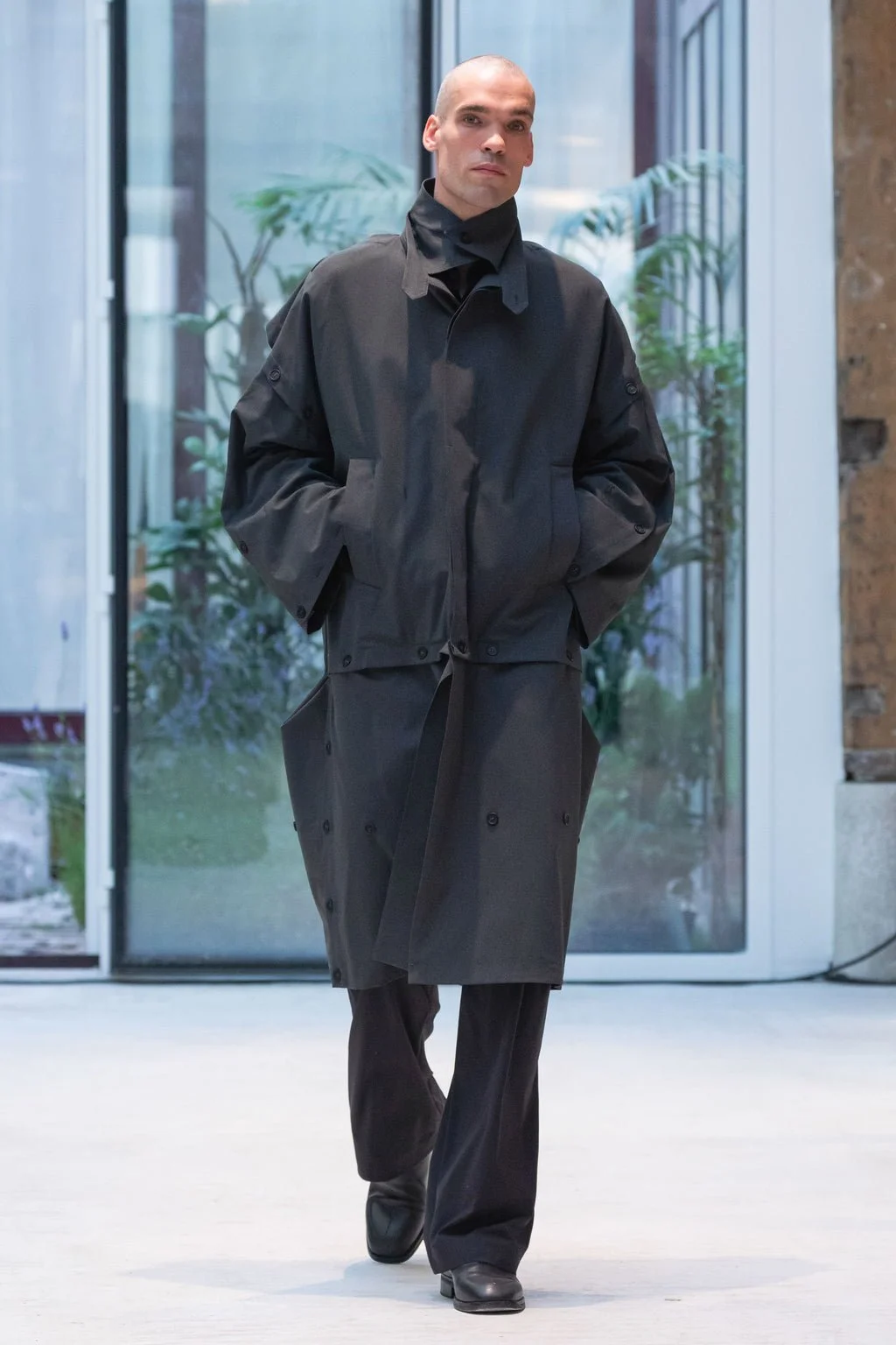 While the collection’s inspiration shifts to focusing on the principle of furniture design, specifically 1000 Chairs, the traditional brand codes are elevated and refined into a quieter, more considered expression. Core silhouettes are revisited with signature design elements, such as laser perforation, elegant draping, and structured forms, resulting in biker jackets with metal eyelets, modular long coats, oversized tailored trousers, and ergonomic messenger bags. Fabrication has become an element of its own, utilising a blend of linen, technical cottons, wool, leather, and natural cotton. Footwear comes by the way of a debut collaboration with Puma on the CELL Umbre and CELL Midnight, as well as in-house styles like the Shin Loafer, inspired by Grete Jalk's Lounge Chair.