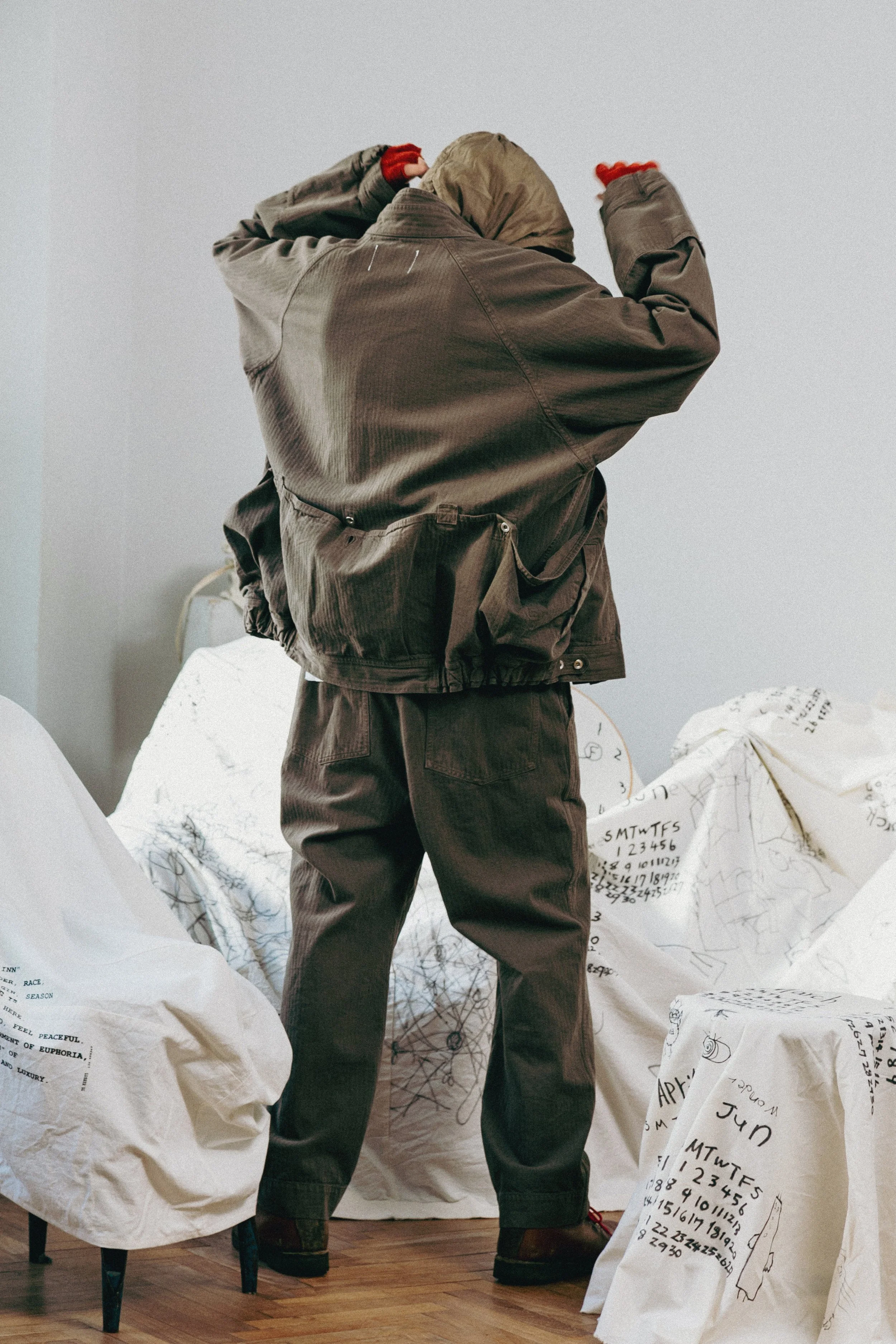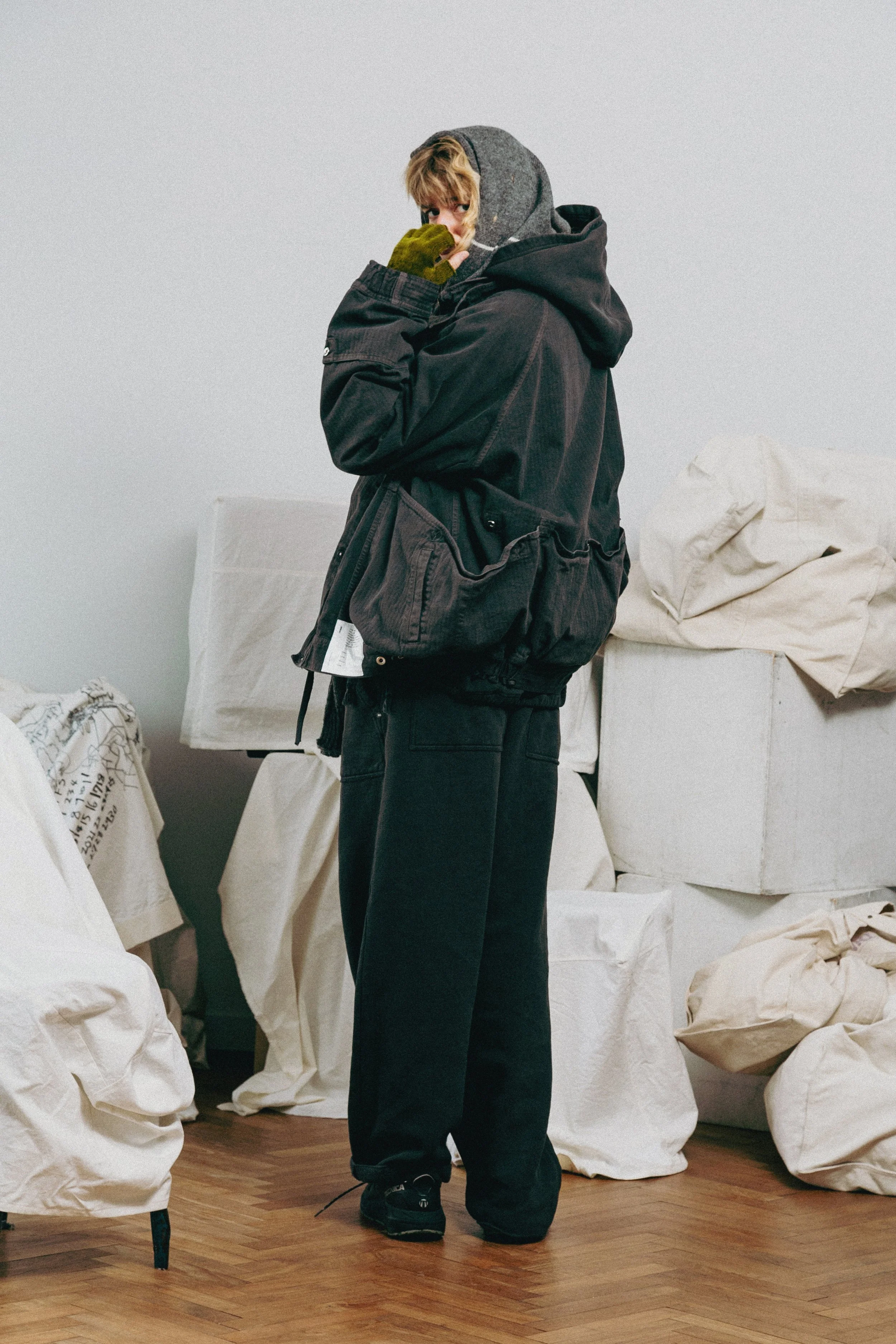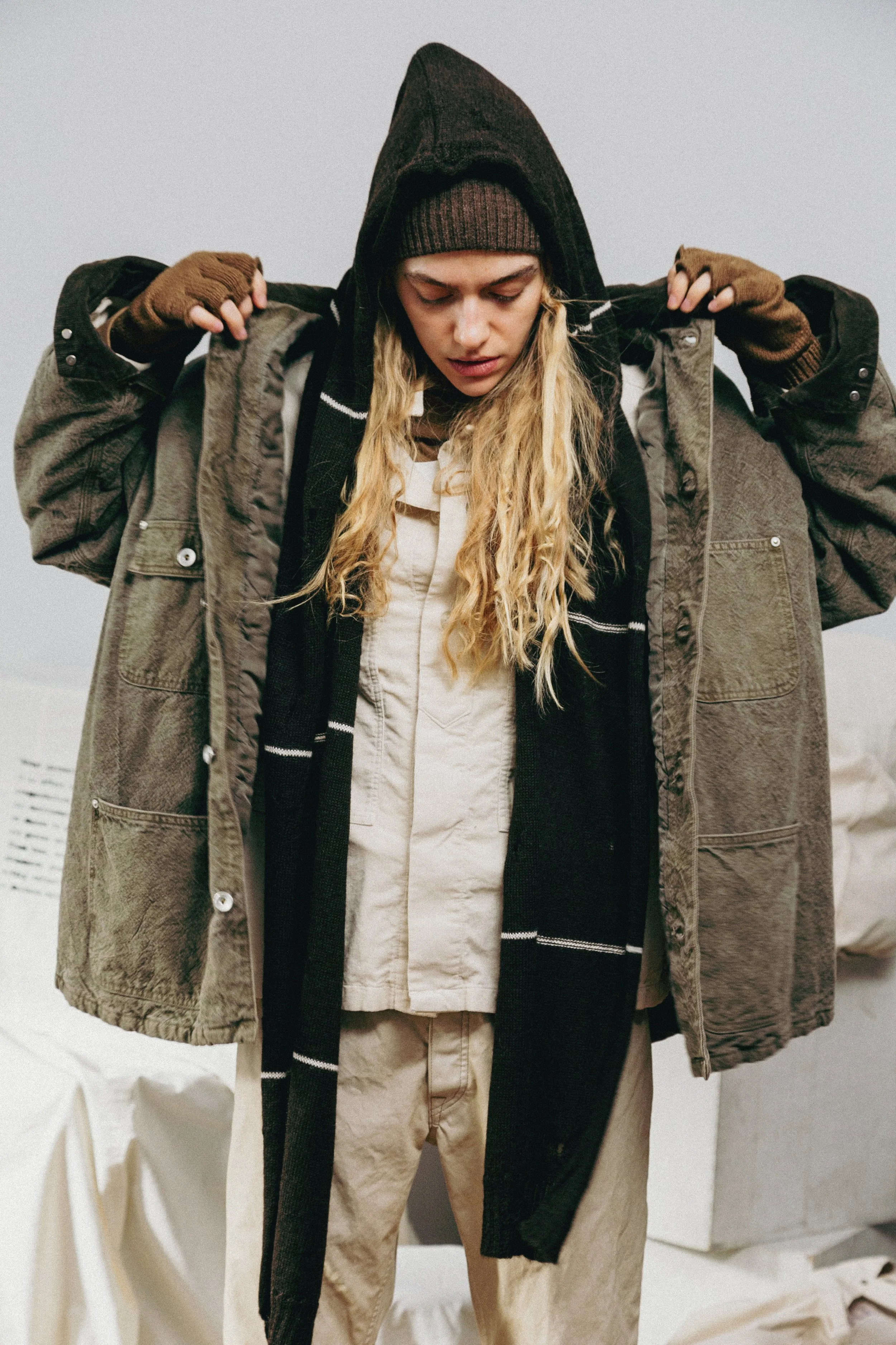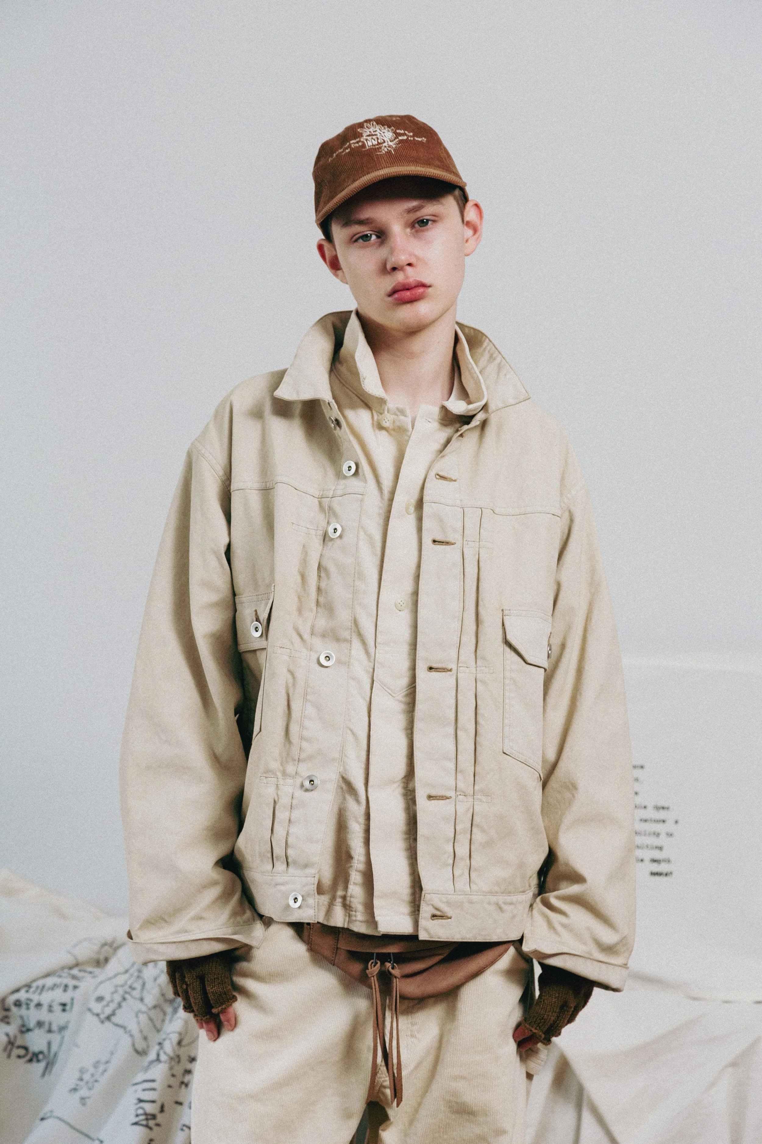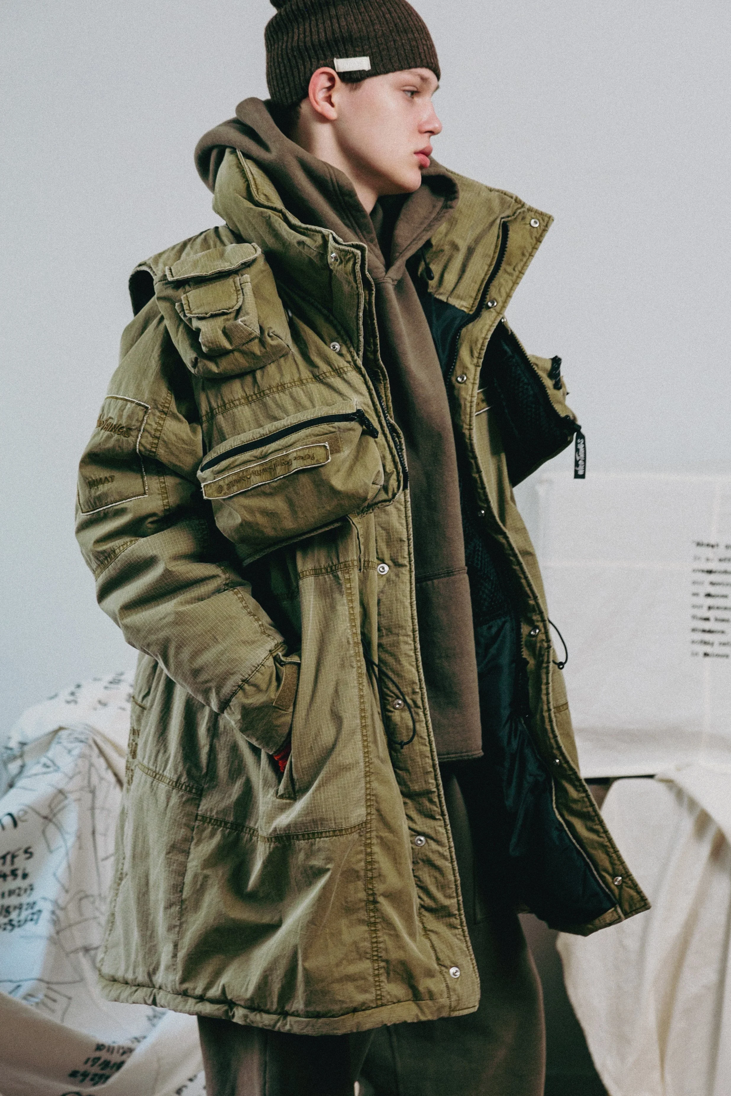 Outerwear, trousers, shirting, knitwear, and tops receive INNAT’s iconic hand - a piece-dyeing process that achieves a truly unique finish for each style. Soft pinks and worn-in blues appear alongside patina’d black and grey tones, delivering an effect often reserved for highly worn vintage garments. Nods to military and workwear uniforms are deliberate as they serve as the foundation of the collection - a never-ending supply of references. The Japanese label continues to deepen its partnership with WILD THINGS, reworking outerwear silhouettes originally designed for military use and creating pieces of wearable art.