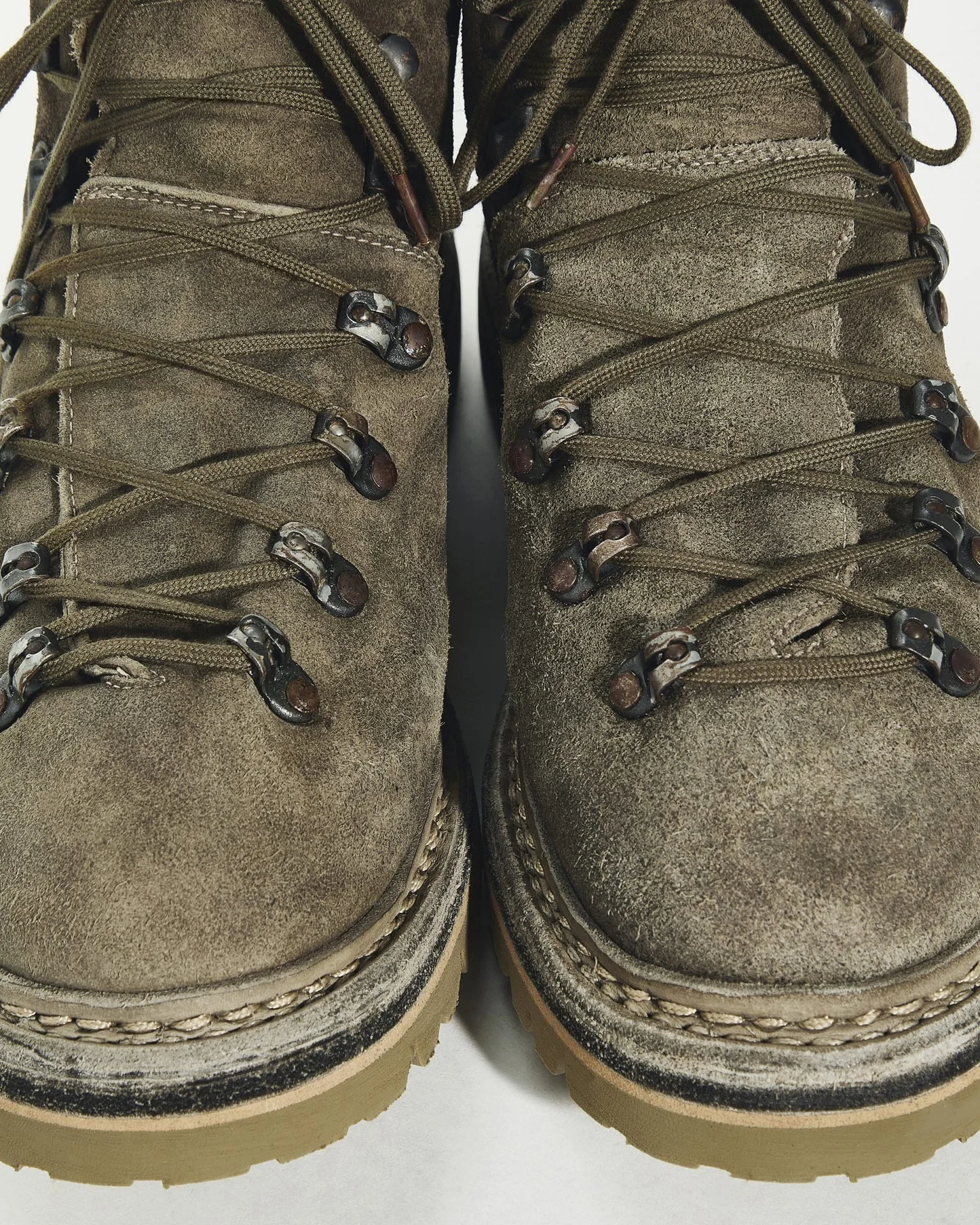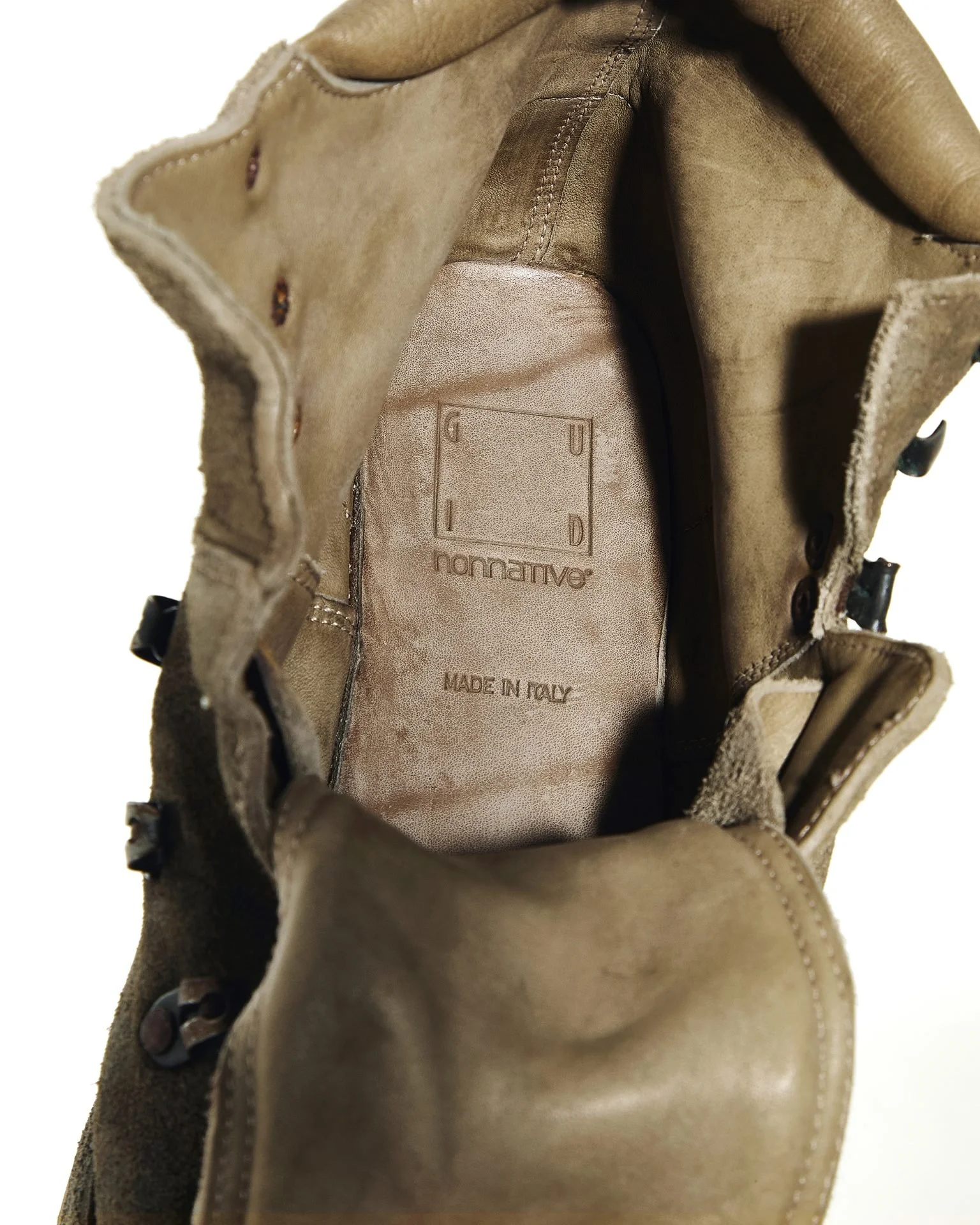 Arriving in a ‘Vintage Khaki’ colourway, following successive releases, the patina’d leather upper is achieved using GUIDI’s unique tumble-dyeing process, creating a subdued, pale tone with a rich palette that cannot be achieved elsewhere. This is complemented by aged metal eyelets and hooks, paired with thin cottage laces. To unify the overall tone, nonnative commissioned an exclusive Vibram sole to coordinate with the upper's colour, laces, stitching, and tongue.