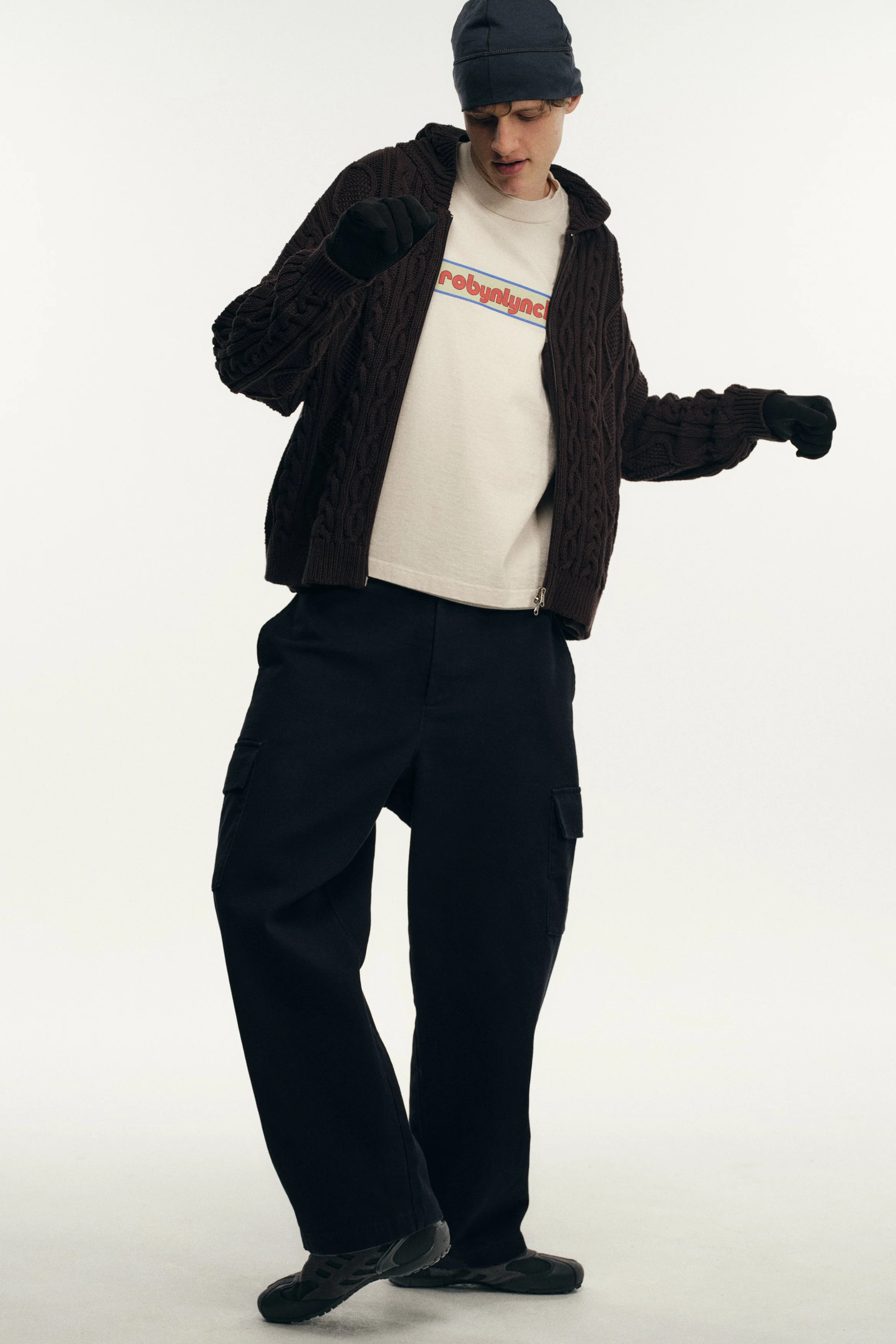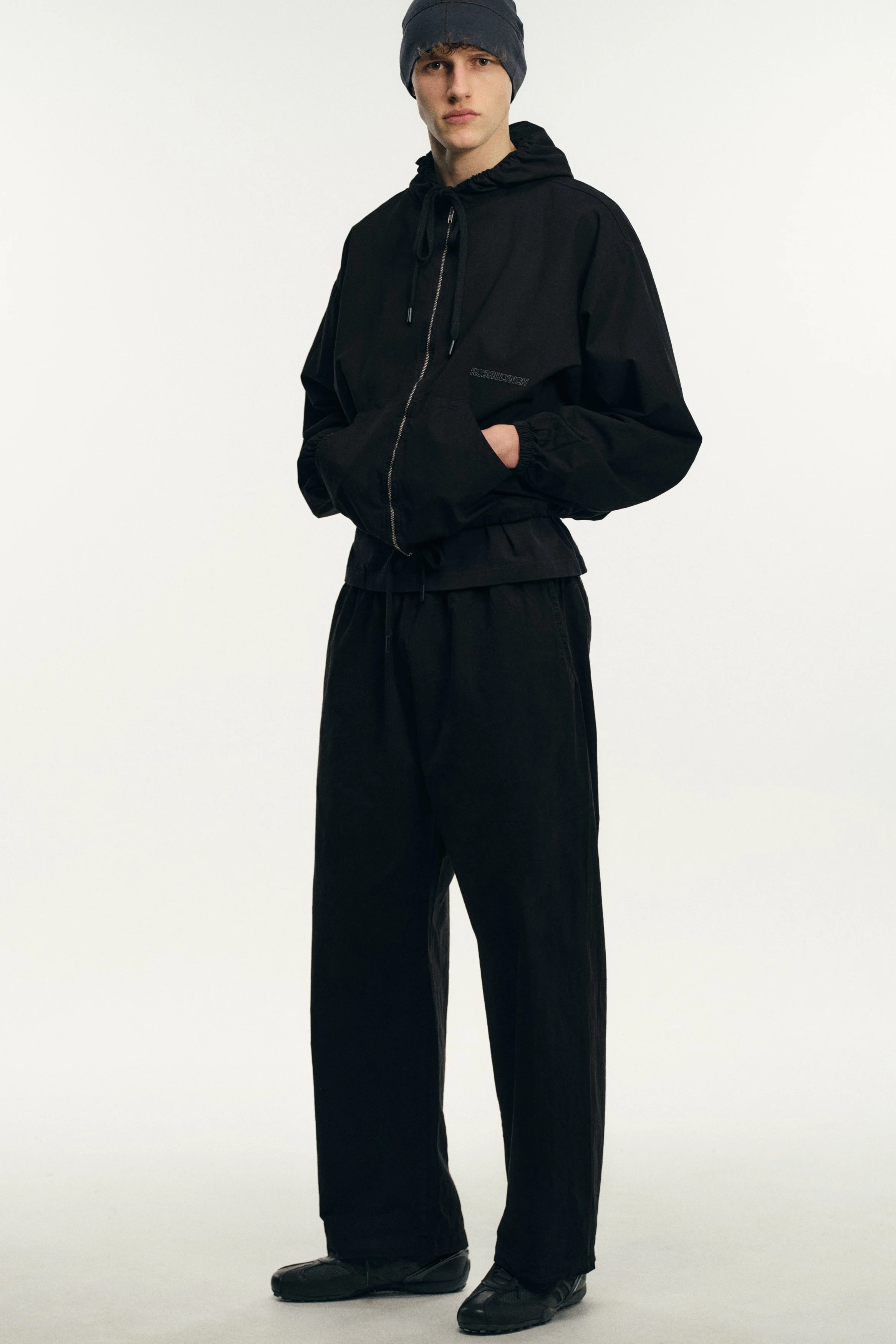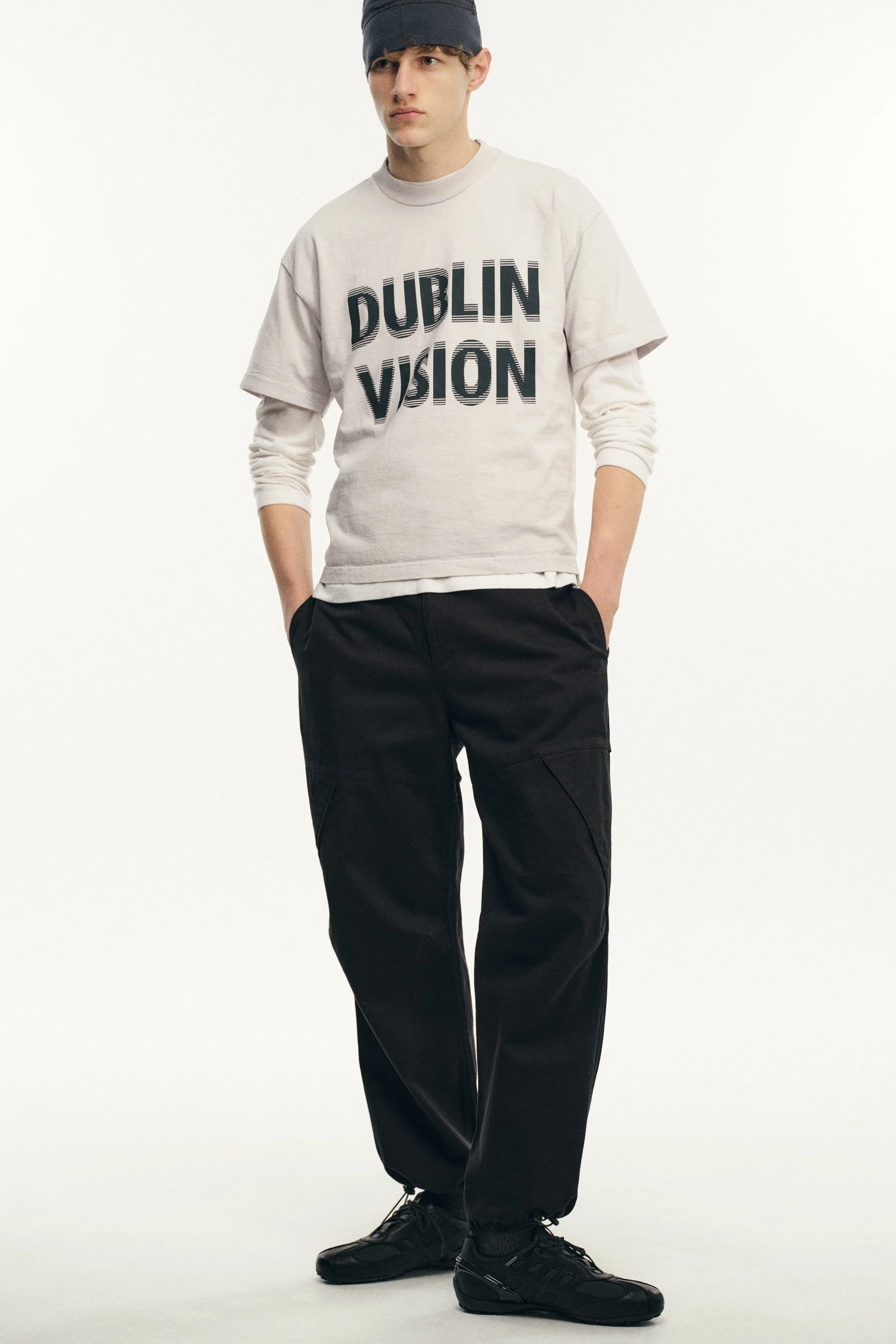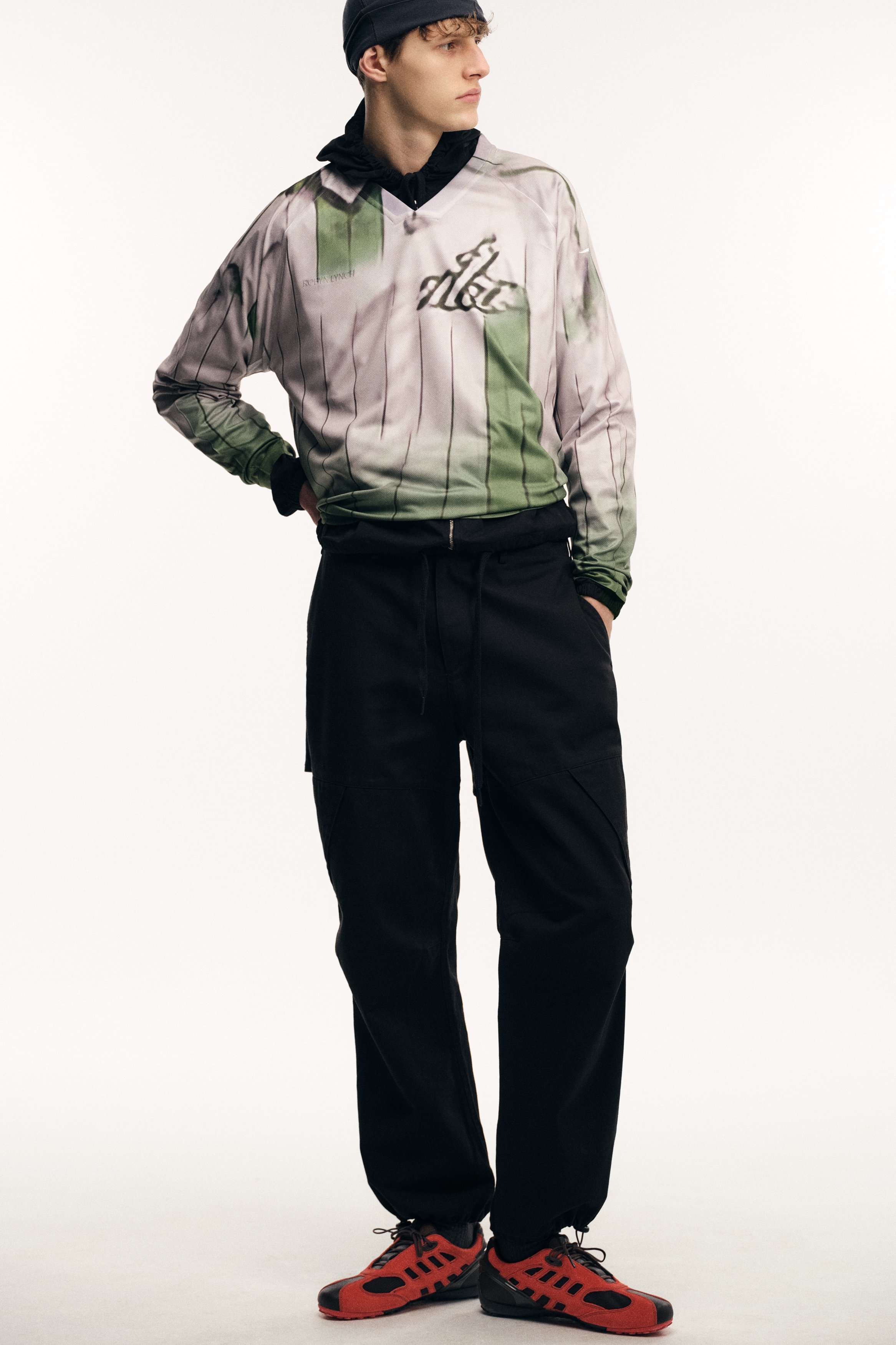Founded in 2018 by the Dublin-born designer who lends her name to the brand, Robyn Lynch explores themes of identity, community, and sport, distilling them into seasonal collections. Autumn/Winter ‘26 is built on the foundations of Lynch’s personal wardrobe, returning to familiar shapes and refining them through fabric, proportion, and detail. Here, the priority becomes comfort and versatility, shaping a collection that can be worn in the studio, to college, and for drinks with friends, while fitting into the Robyn Lynch universe. Sports jerseys, graphic tees, functional raincoats, cable knit jumpers, jeans, and footwear nod to the past while looking to the future. Graphics are reappropriated from vintage bootlegs, tourist merchandise, and subcultural references, such as ‘License to Kildare’ - a mash-up of License to Kill and Kildare, a county - and Dublin Vision, taking cues from souvenir shops around Temple Bar. Denim is treated with worn washes to give a sense of familiarity and age. Texture and rhythm emerge through stripe patterns inspired by vintage knitwear. Technical outerwear evolves through considered panel lines and practical construction. The collection is presented alongside the latest Geox collaboration, seamlessly integrating performance footwear into Robyn Lynch’s wardrobe.