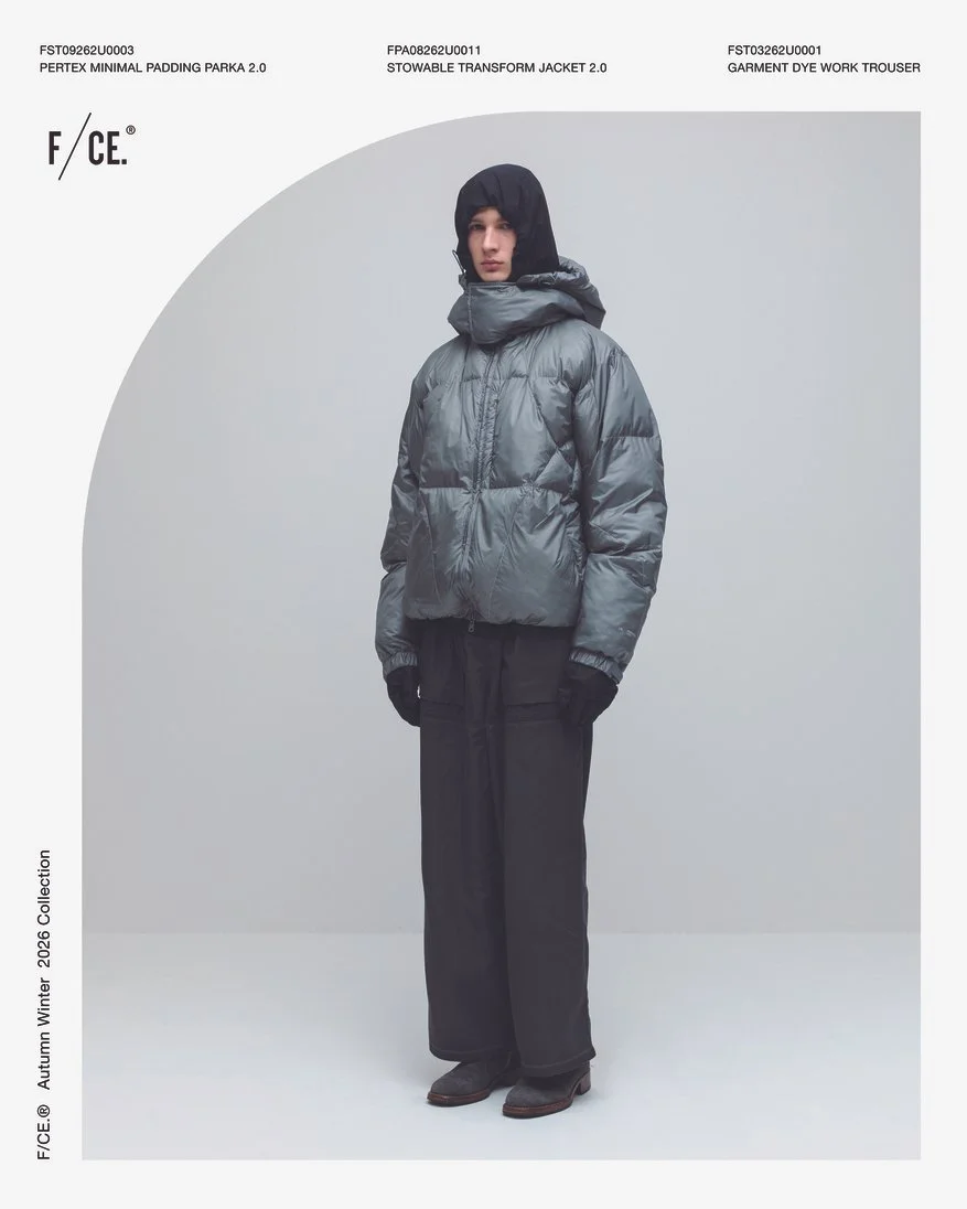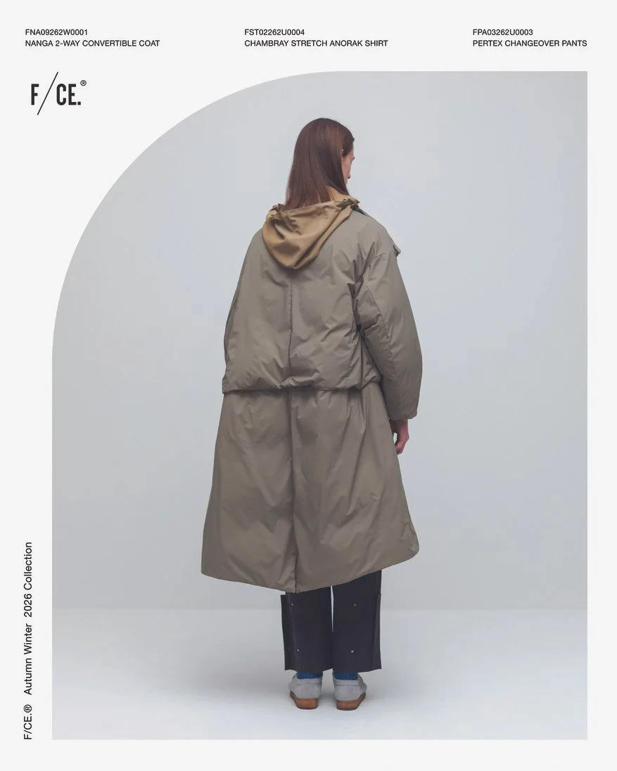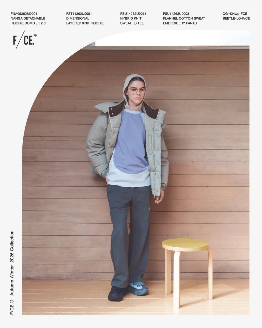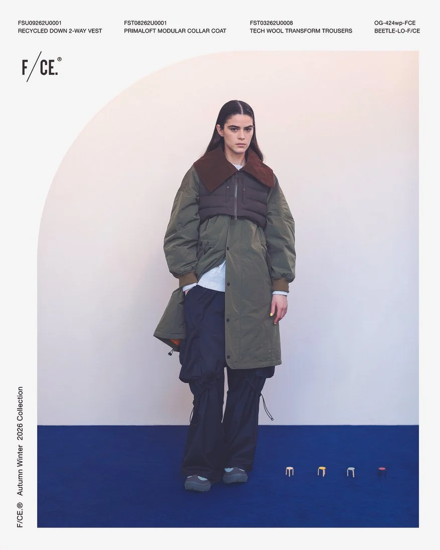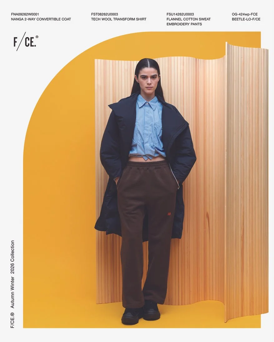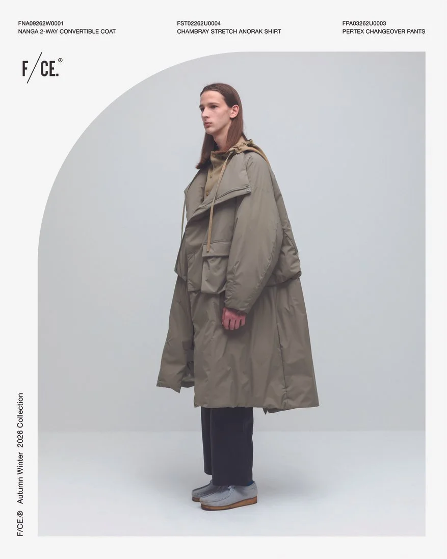 Built around the theme ‘WREKONIZE’, a concept coined by F/CE. combining wreck and recognise, this philosophy finds vision in destruction and clarity in rebirth. In line with previous output, where inspiration is drawn from countries visited by F/CE’s principal designers, Satoshi Yamane and Asami Yamane, Finland’s culture, architecture, and design serve as a point of conceptual reference, still anchored in the primary theme - WREKONISE. These ideas are expressed through colour, texture, proportion, function, and movement, culminating in a plethora of outerwear, legwear, knits, tops, bags, shirting, and more. Key silhouettes, textures, and the colour palette reference Finland: modular outerwear reimagines architectural concepts; ceramic vertical-rib quilting references glazed-tile structures; and birch, bone, and sand hues allude to the neutrality of wood and stone and to how man-made structures interact with their natural surroundings. Some of our favourites include the 2-Way Convertible Coat by NANGA, the Tech Wool Transform Shirt, and the Parachute Wide Pants. Collaborations have become a stalwart of F/CE. collections now, and Autumn/Winter ‘26 is no different. A project with Lee Jeans reinterprets denim through a technical lens and a renewed focus on movement; NANGA remains a primary partner in co-creating down outerwear, in a similar way to Taion.