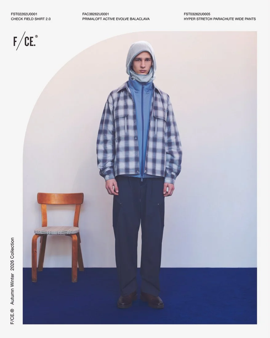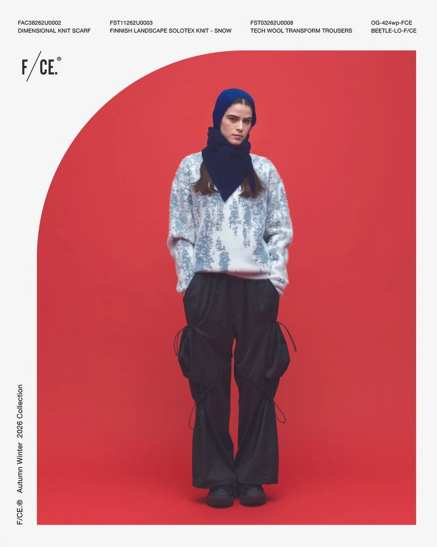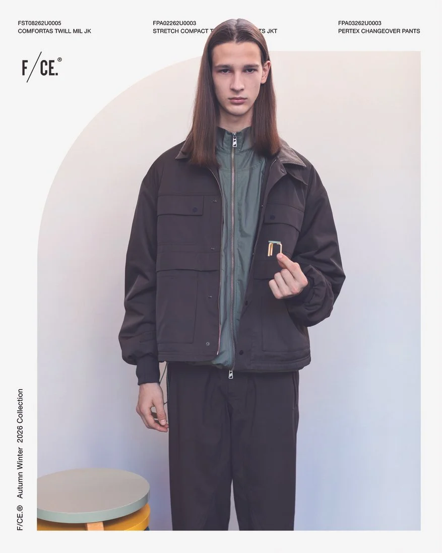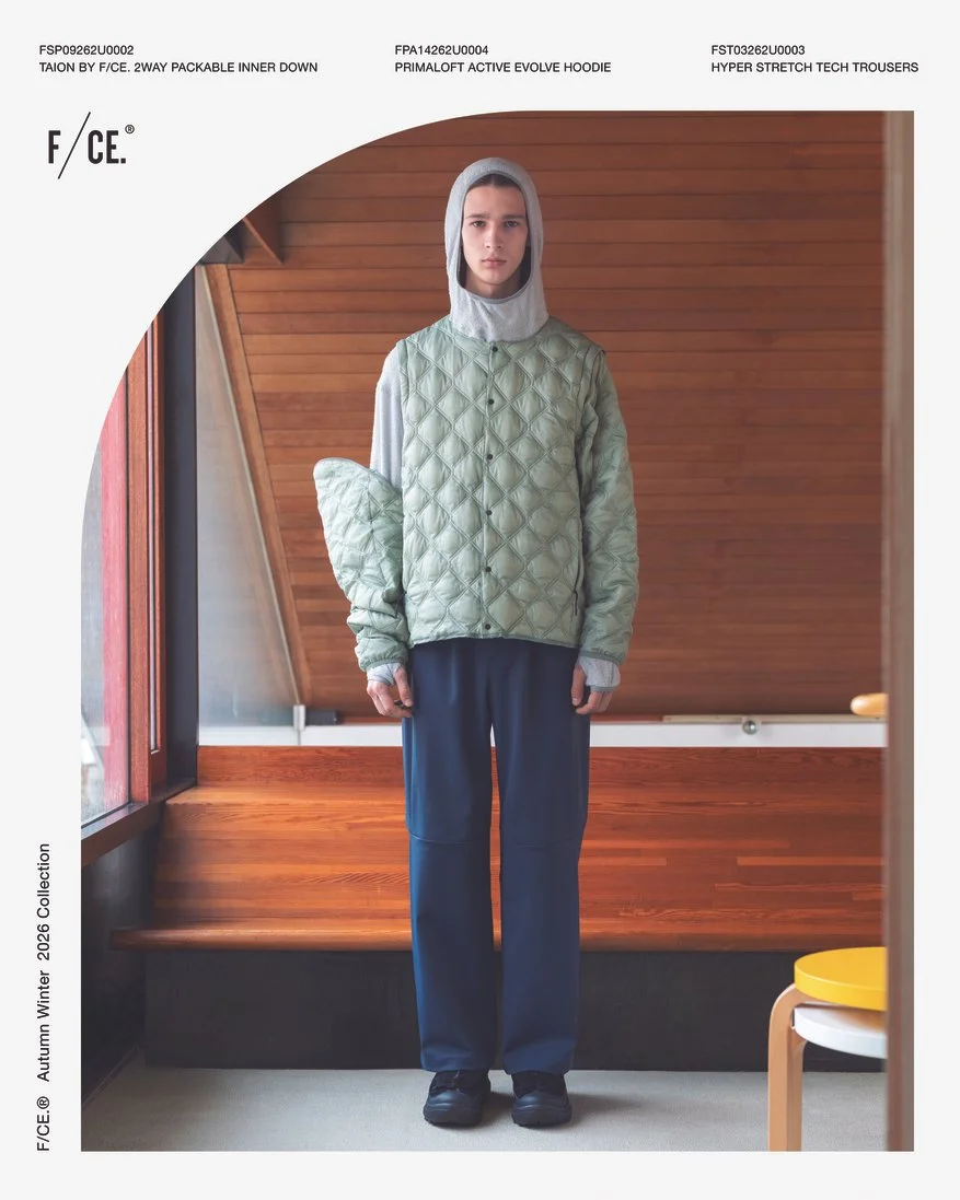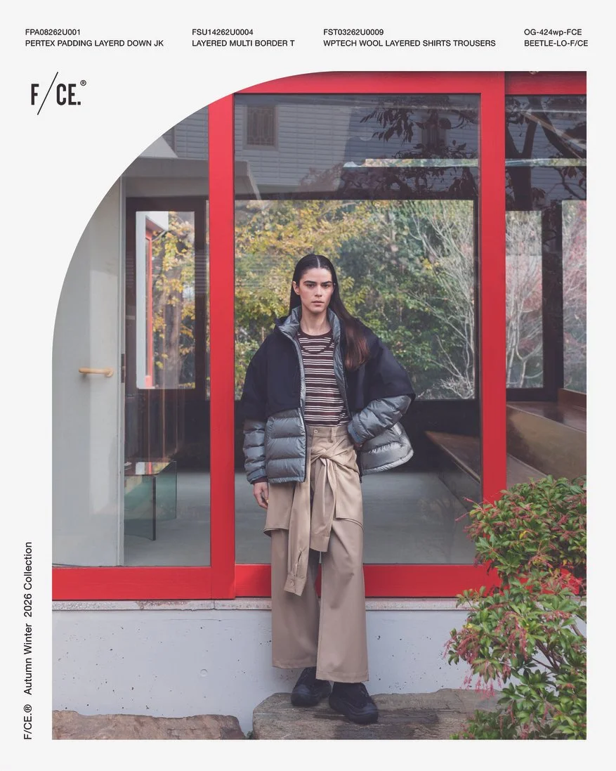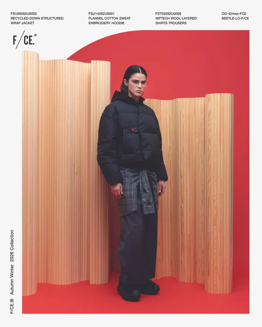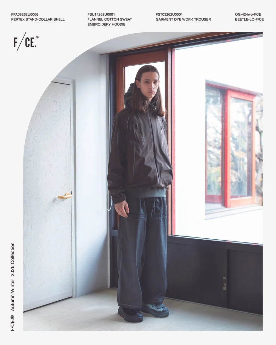 Built around the theme ‘WREKONIZE’, a concept coined by F/CE. combining wreck and recognise, this philosophy finds vision in destruction and clarity in rebirth. In line with previous output, where inspiration is drawn from countries visited by F/CE’s principal designers, Satoshi Yamane and Asami Yamane, Finland’s culture, architecture, and design serve as a point of conceptual reference, still anchored in the primary theme - WREKONISE. These ideas are expressed through colour, texture, proportion, function, and movement, culminating in a plethora of outerwear, legwear, knits, tops, bags, shirting, and more. Key silhouettes, textures, and the colour palette reference Finland: modular outerwear reimagines architectural concepts; ceramic vertical-rib quilting references glazed-tile structures; and birch, bone, and sand hues allude to the neutrality of wood and stone and to how man-made structures interact with their natural surroundings. Some of our favourites include the 2-Way Convertible Coat by NANGA, the Tech Wool Transform Shirt, and the Parachute Wide Pants. Collaborations have become a stalwart of F/CE. collections now, and Autumn/Winter ‘26 is no different. A project with Lee Jeans reinterprets denim through a technical lens and a renewed focus on movement; NANGA remains a primary partner in co-creating down outerwear, in a similar way to Taion.