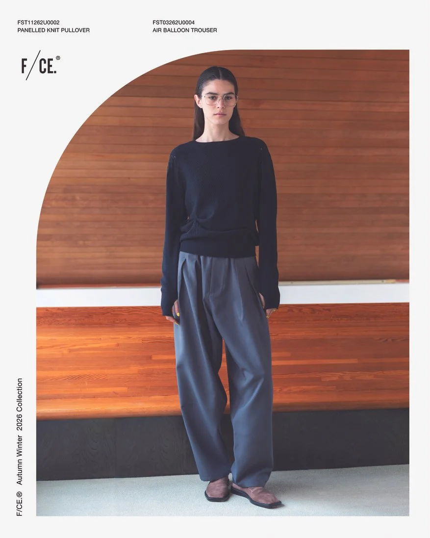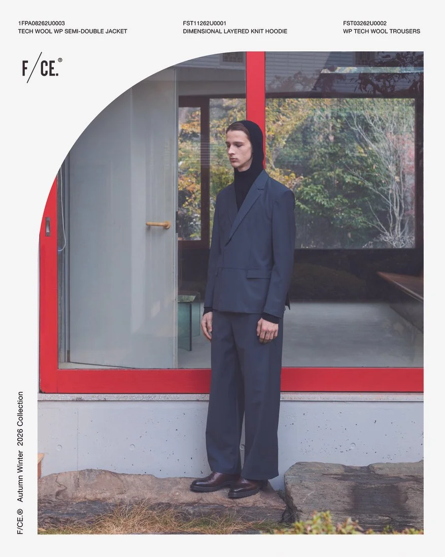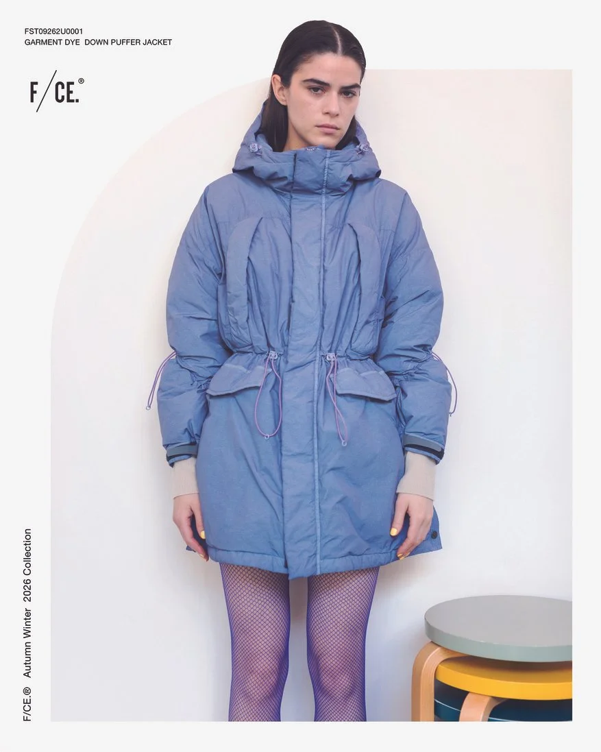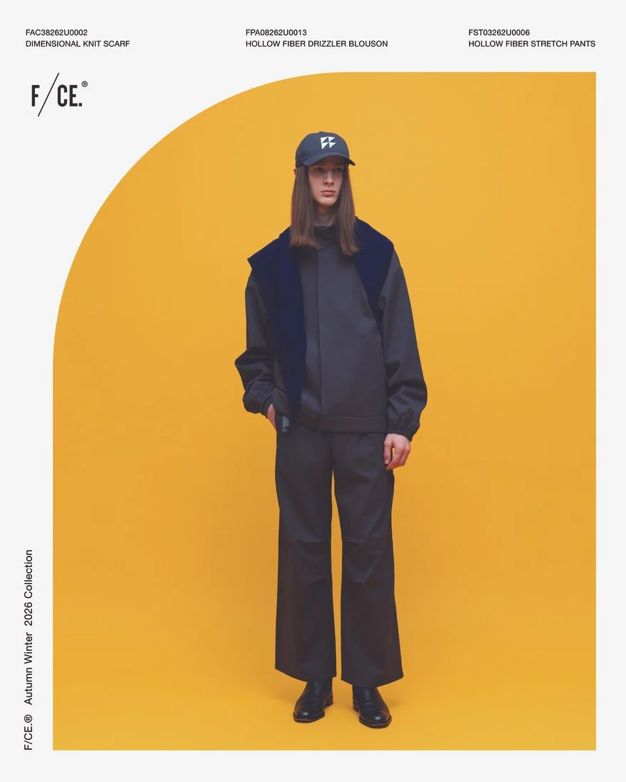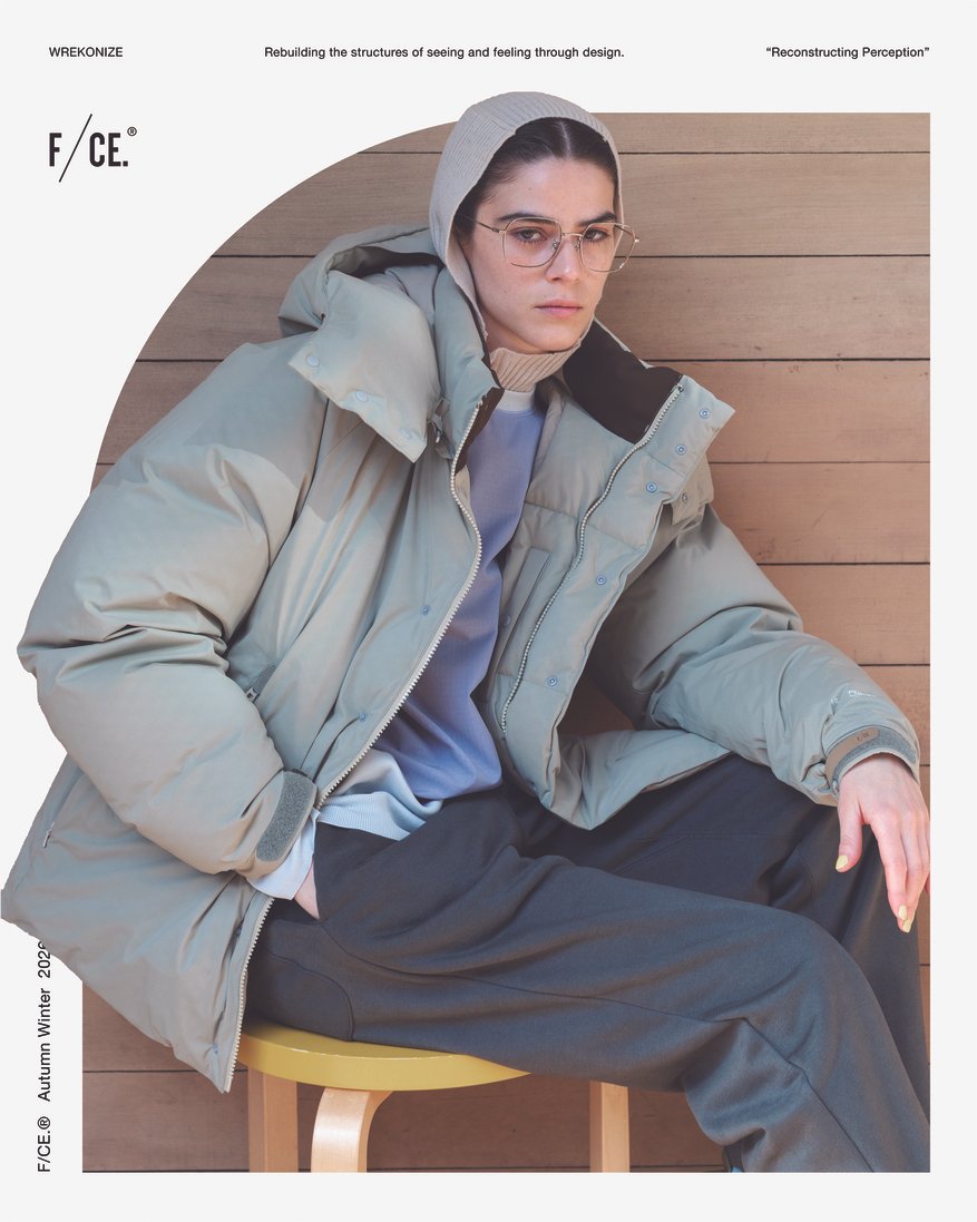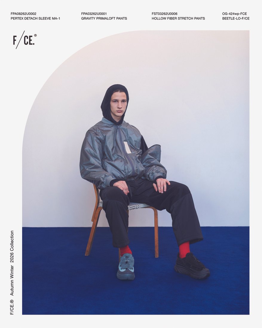 Built around the theme ‘WREKONIZE’, a concept coined by F/CE. combining wreck and recognise, this philosophy finds vision in destruction and clarity in rebirth. In line with previous output, where inspiration is drawn from countries visited by F/CE’s principal designers, Satoshi Yamane and Asami Yamane, Finland’s culture, architecture, and design serve as a point of conceptual reference, still anchored in the primary theme - WREKONISE. These ideas are expressed through colour, texture, proportion, function, and movement, culminating in a plethora of outerwear, legwear, knits, tops, bags, shirting, and more. Key silhouettes, textures, and the colour palette reference Finland: modular outerwear reimagines architectural concepts; ceramic vertical-rib quilting references glazed-tile structures; and birch, bone, and sand hues allude to the neutrality of wood and stone and to how man-made structures interact with their natural surroundings. Some of our favourites include the 2-Way Convertible Coat by NANGA, the Tech Wool Transform Shirt, and the Parachute Wide Pants. Collaborations have become a stalwart of F/CE. collections now, and Autumn/Winter ‘26 is no different. A project with Lee Jeans reinterprets denim through a technical lens and a renewed focus on movement; NANGA remains a primary partner in co-creating down outerwear, in a similar way to Taion.