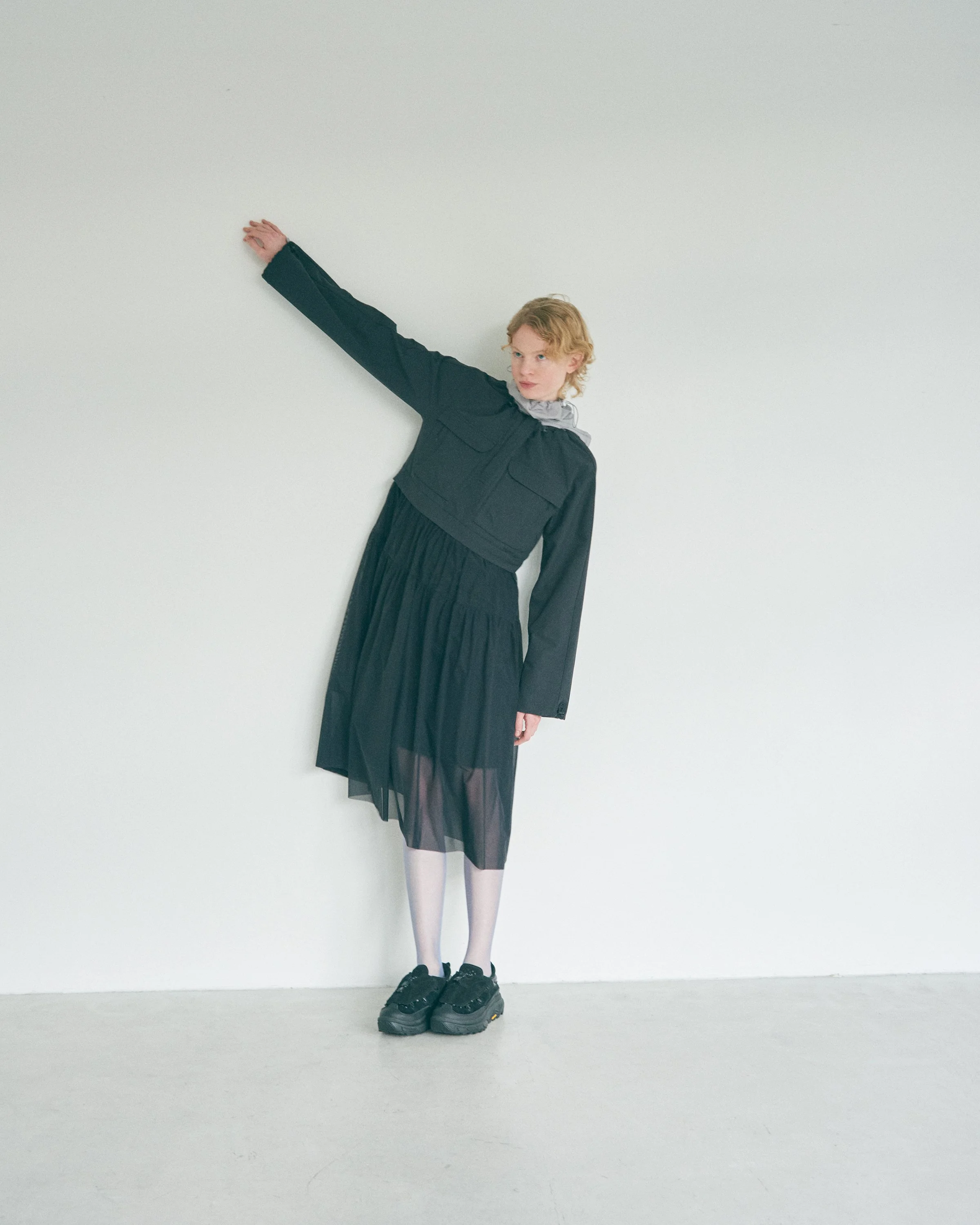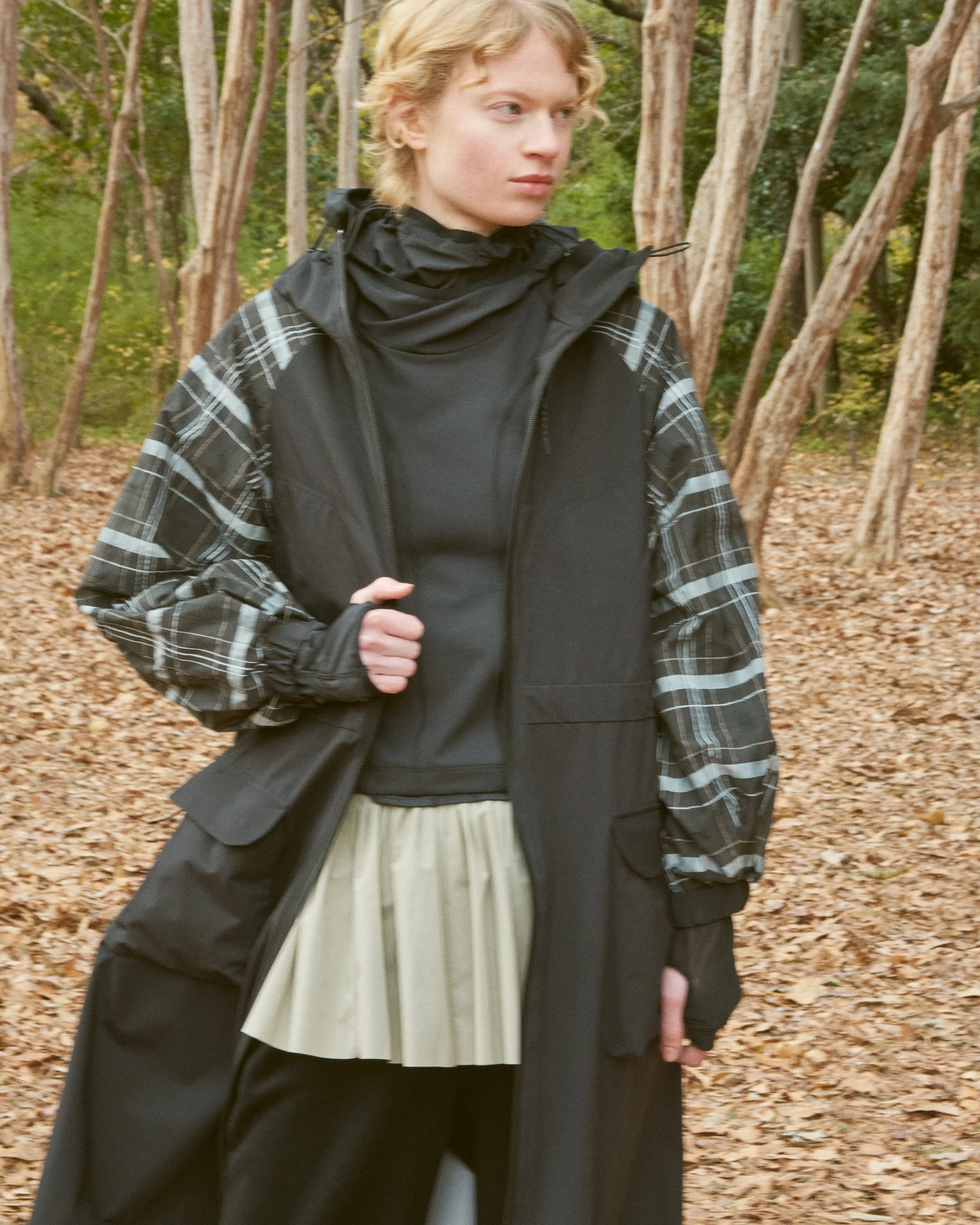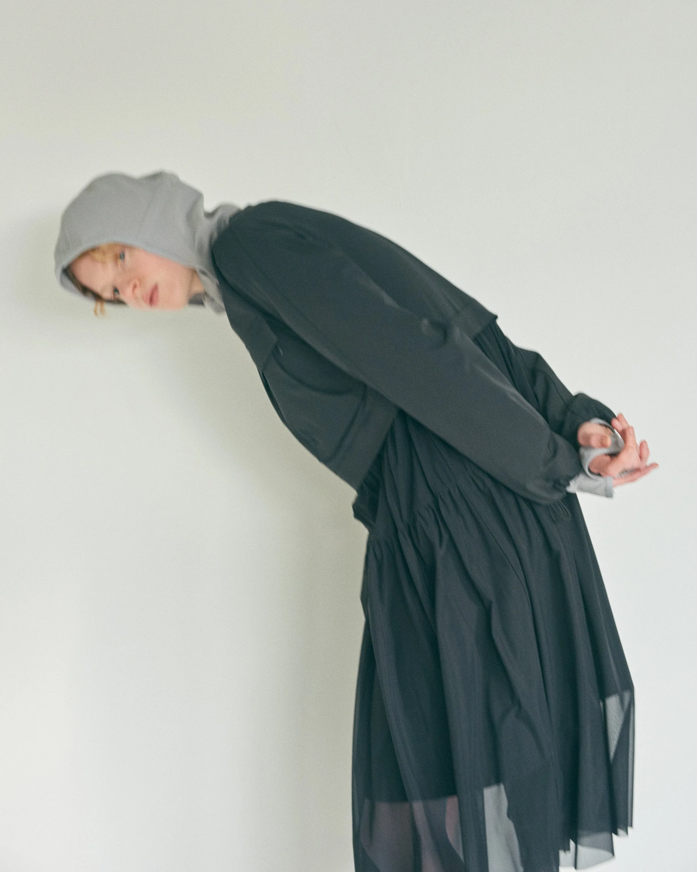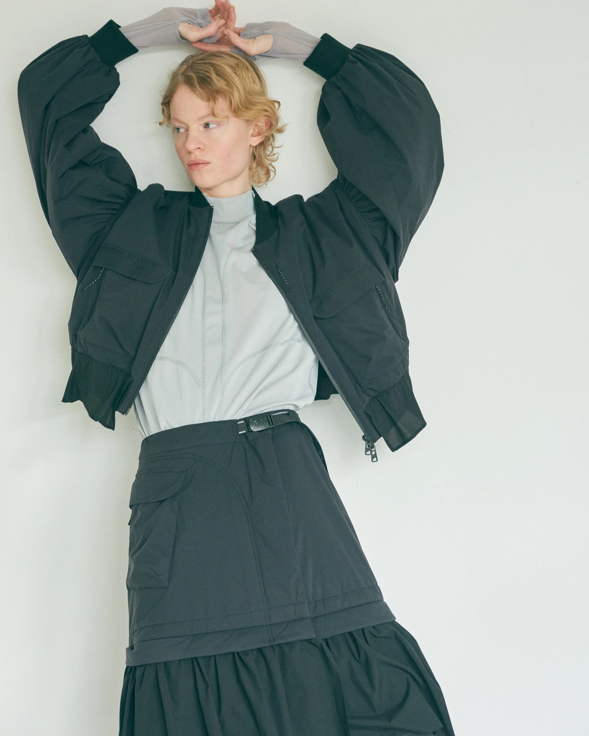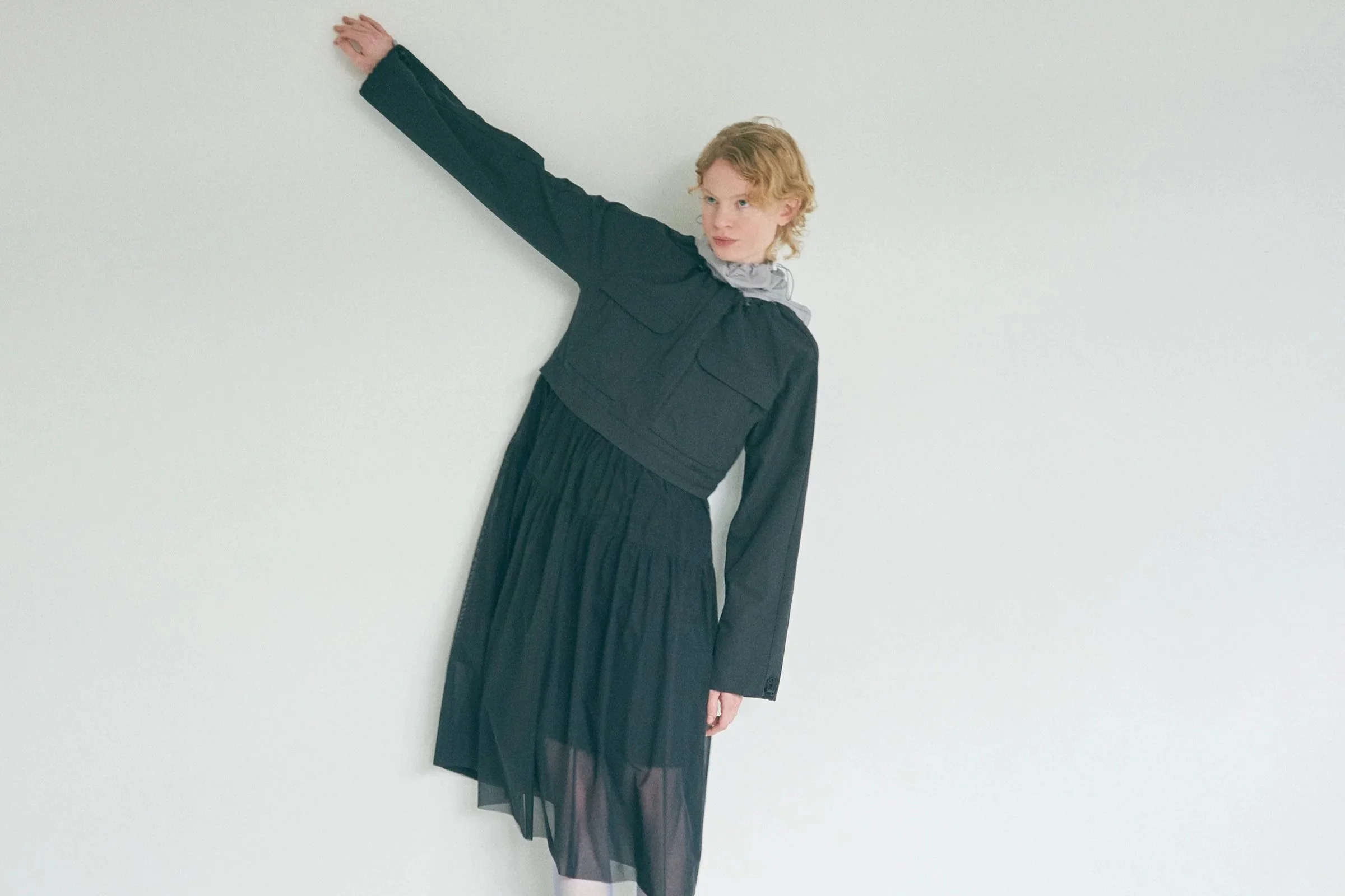 Following the same theme as its menswear line, ‘WREKONIZE’, a concept coined by F/CE. combining wreck and recognise, this philosophy finds vision in destruction and clarity in rebirth. Typically feminine silhouettes are reworked by F/CE’s principal designers, Satoshi Yamane and Asami Yamane, through a performance lens. Skirts, dresses, blouses, and jackets are built with the female body in mind, combining technical materials with daintier touches, like ruched edges and sheer fabrics. Movement is given great importance, allowing the modern woman to move through cities and outdoor areas as they choose - on foot or by bike.