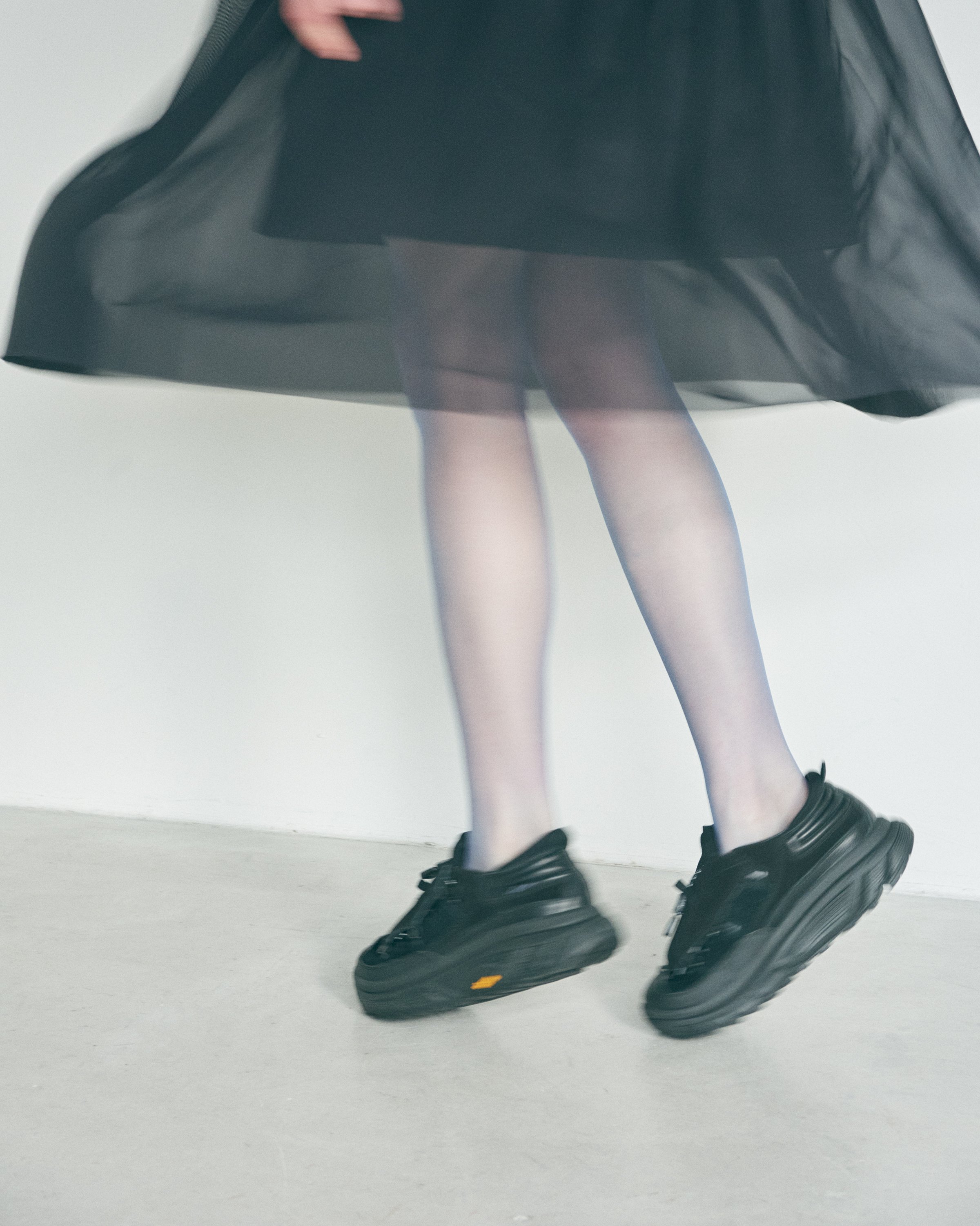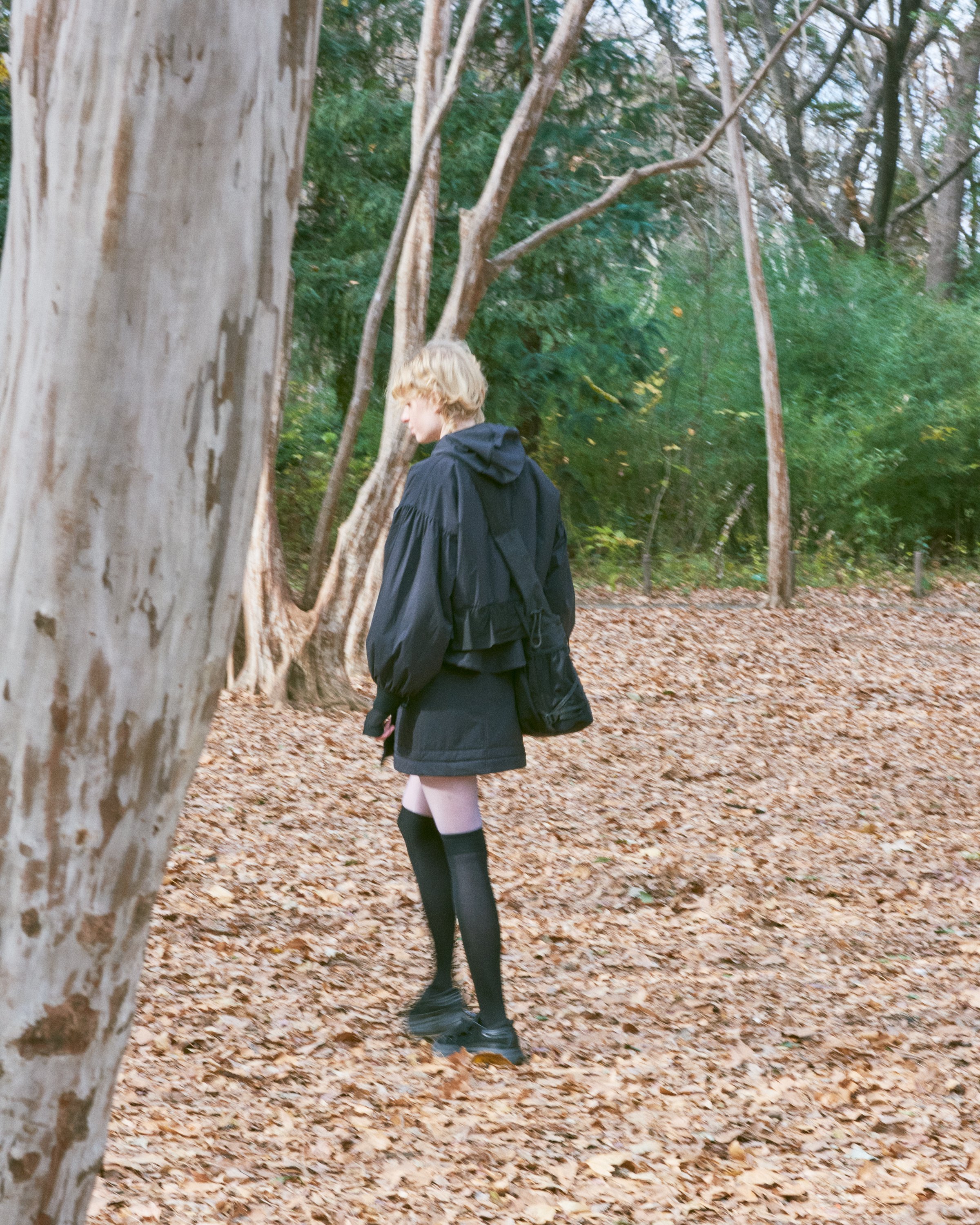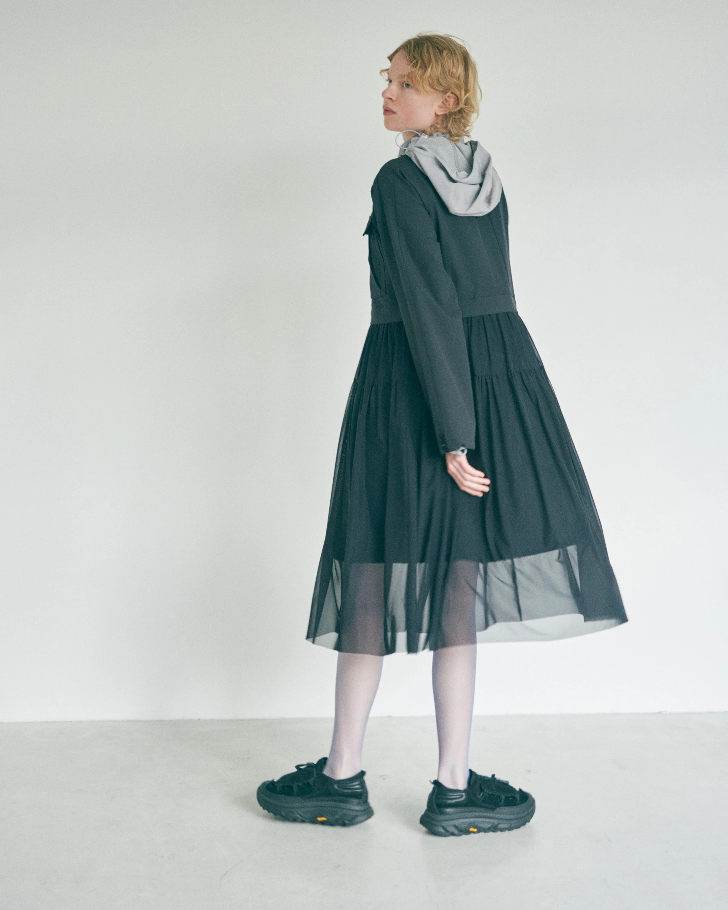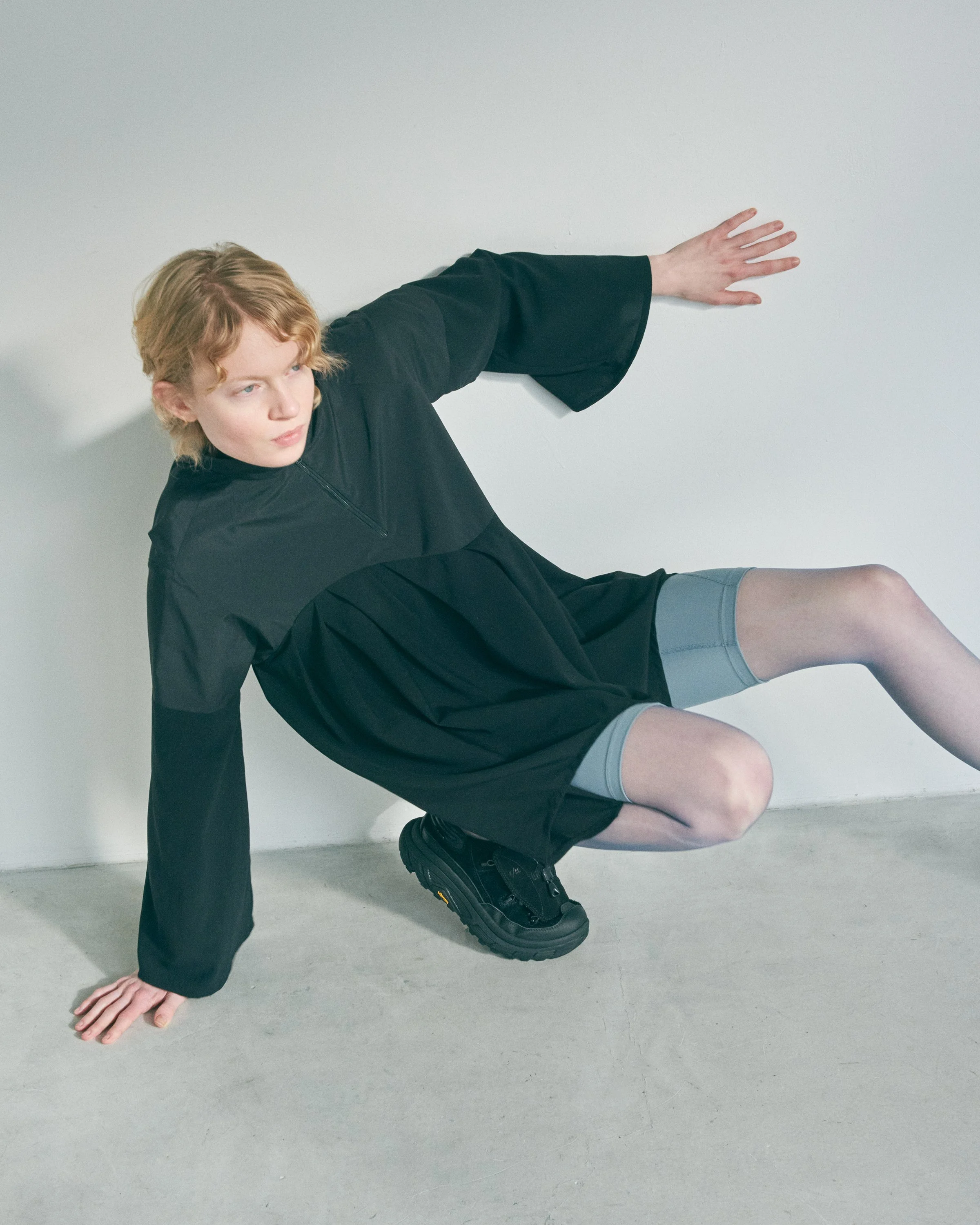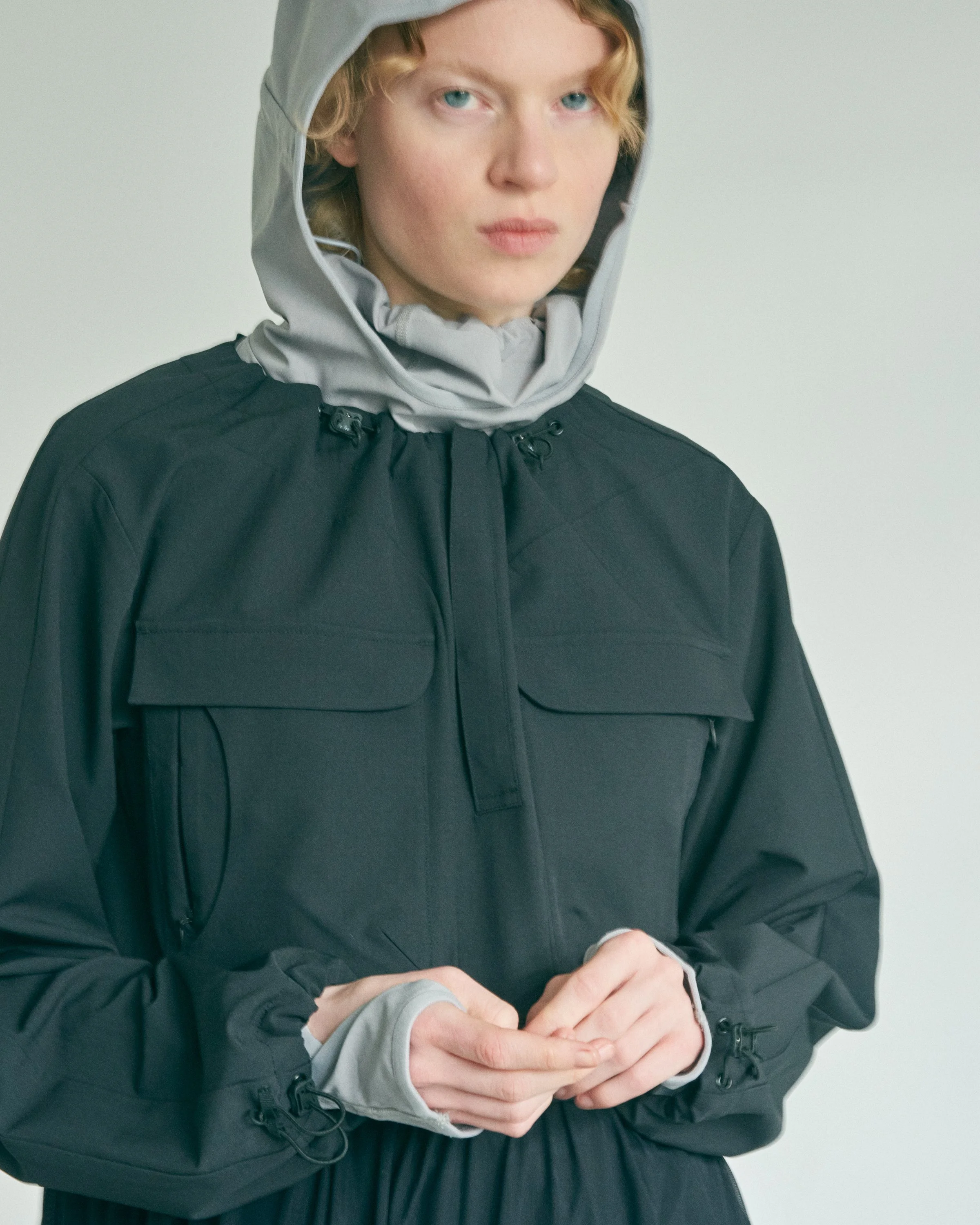 Following the same theme as its menswear line, ‘WREKONIZE’, a concept coined by F/CE. combining wreck and recognise, this philosophy finds vision in destruction and clarity in rebirth. Typically feminine silhouettes are reworked by F/CE’s principal designers, Satoshi Yamane and Asami Yamane, through a performance lens. Skirts, dresses, blouses, and jackets are built with the female body in mind, combining technical materials with daintier touches, like ruched edges and sheer fabrics. Movement is given great importance, allowing the modern woman to move through cities and outdoor areas as they choose - on foot or by bike.