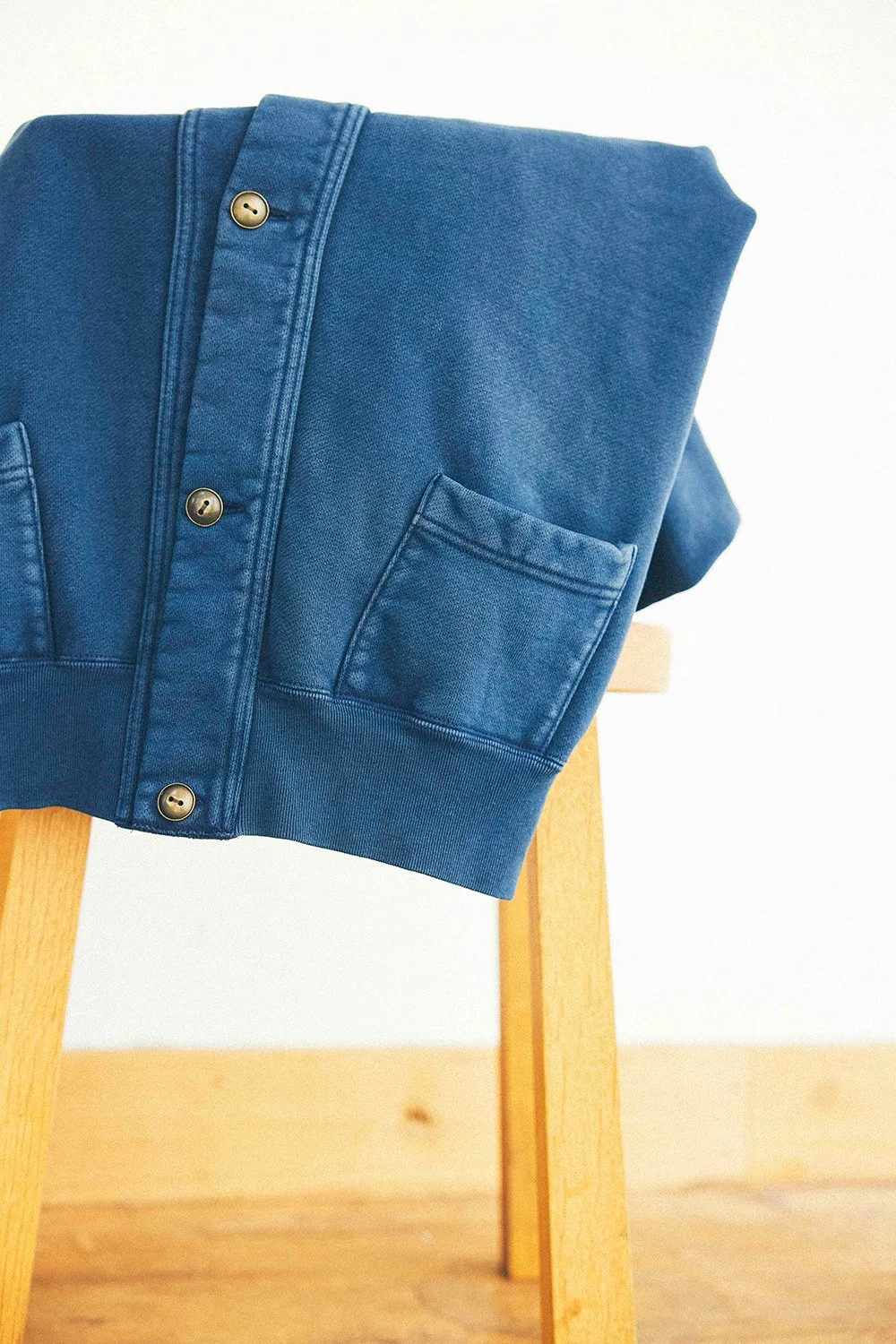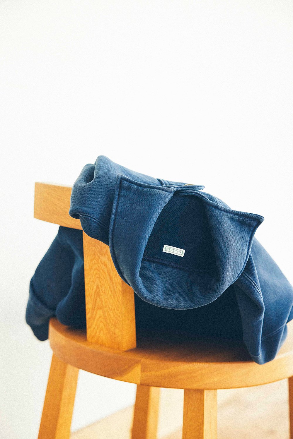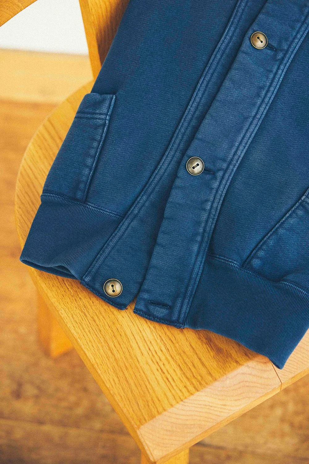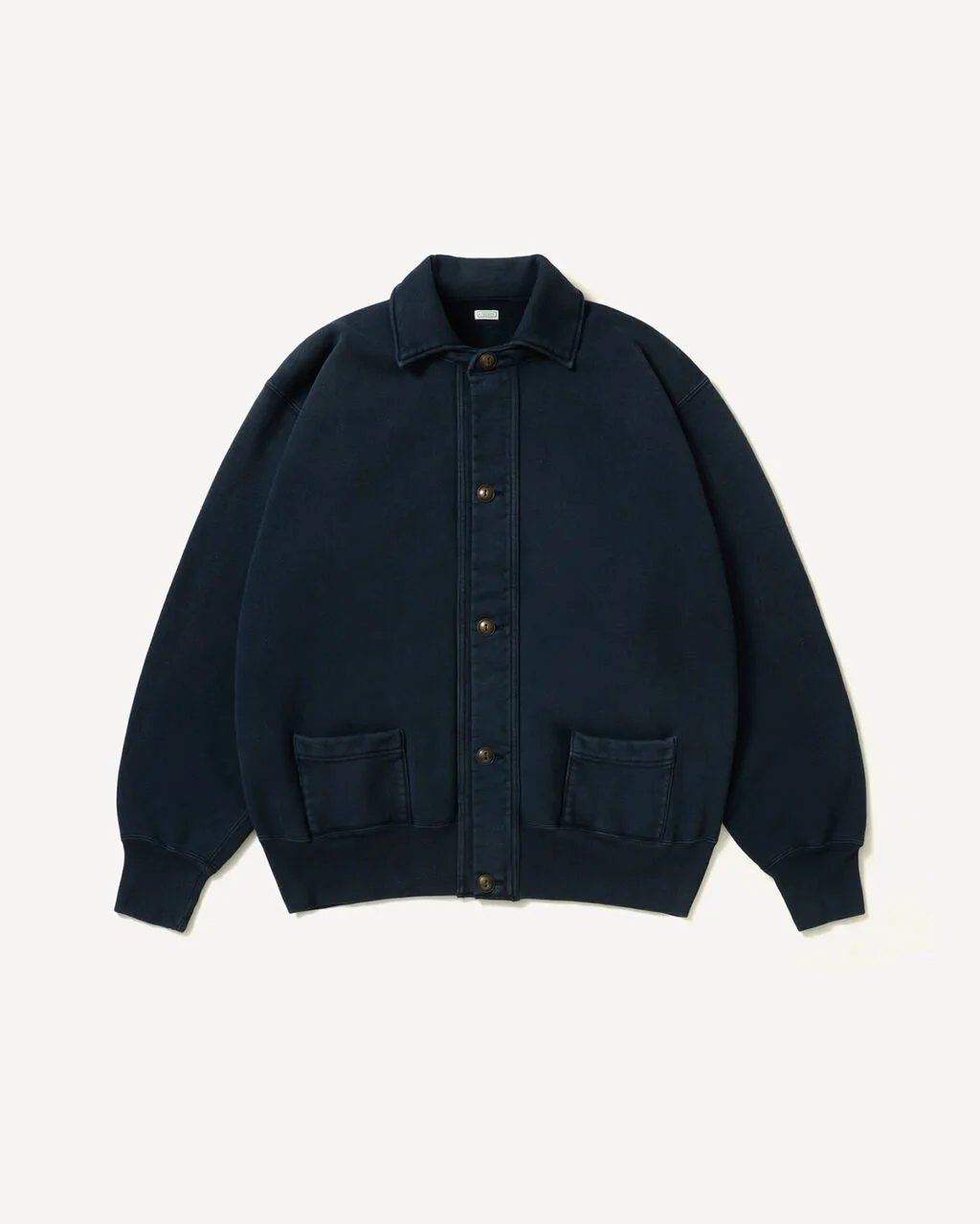 Starting with the Black Chambray Detroit Jacket, modelled on Carhartt’s iconic Detroit Jacket, a workwear style born in the 1990s that transcended its original purpose. Doing away with some of its original features, the shoulder pleats are removed, and the body is unlined, with naturally draped shoulders. The jacket is made from a high-density chambray gabardine with an uneven texture that mimics stains and dirt from natural wear. Meanwhile, the Vintage Sweat Cardigan is inspired by 1930s silhouettes, with a shorter body and thicker sleeves. It comes in navy, a colourway unique to this special order. Elasticated cuffs, two drop pockets, and wooden buttons on the placket complete this style.