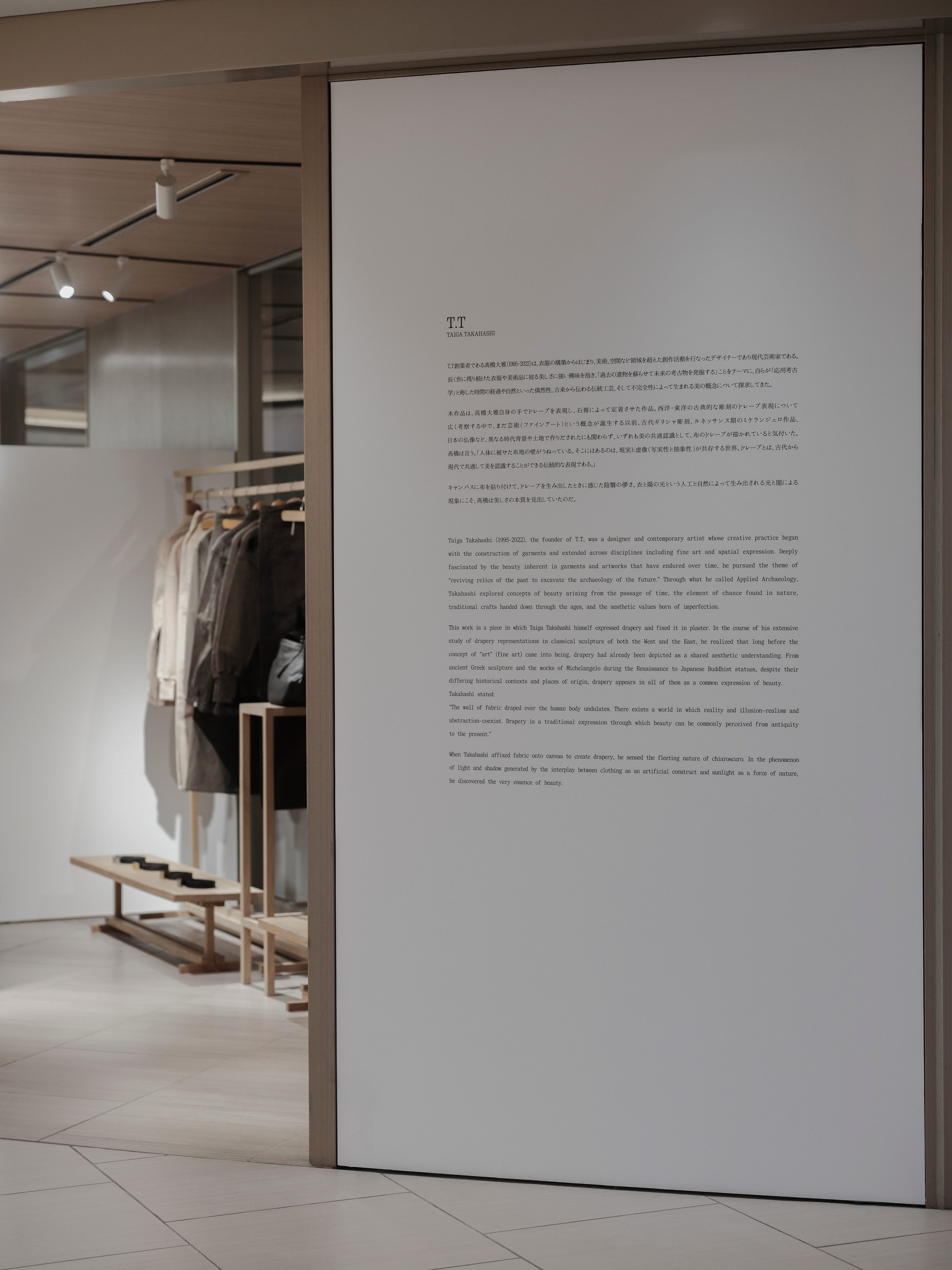 From the 25th of February until the 24th of March, T.T is hosting a pop-up at GINZA SIX. Visitors can view the Spring/Summer ‘26 collection in full alongside a pop-up exclusive, naturally-dyed three-piece capsule in collaboration with BUAISOU, two types of incense previously only available at T.T’s Gion store, with incense holders by ceramic artist Ryuta Fukumura, and three pieces of draped textile art by Taiga Takahasi, titled ‘In Praise of Shadows’.