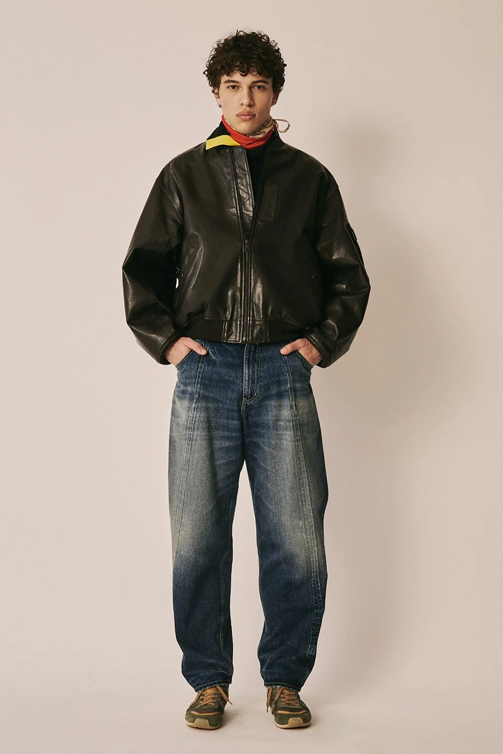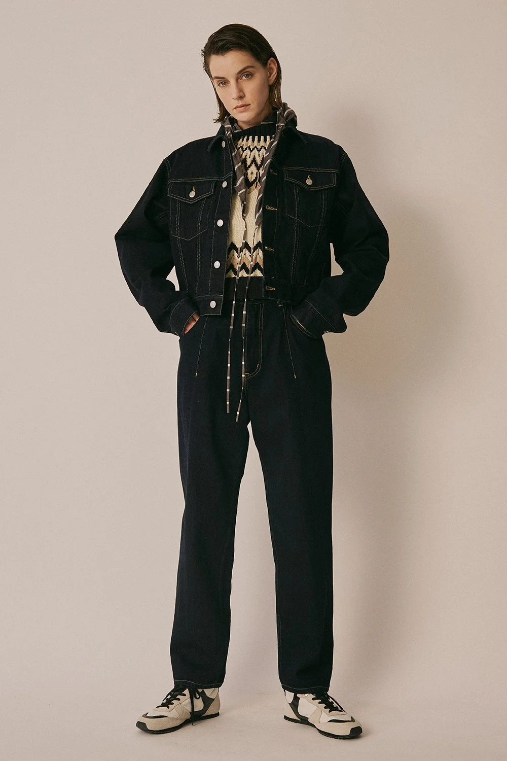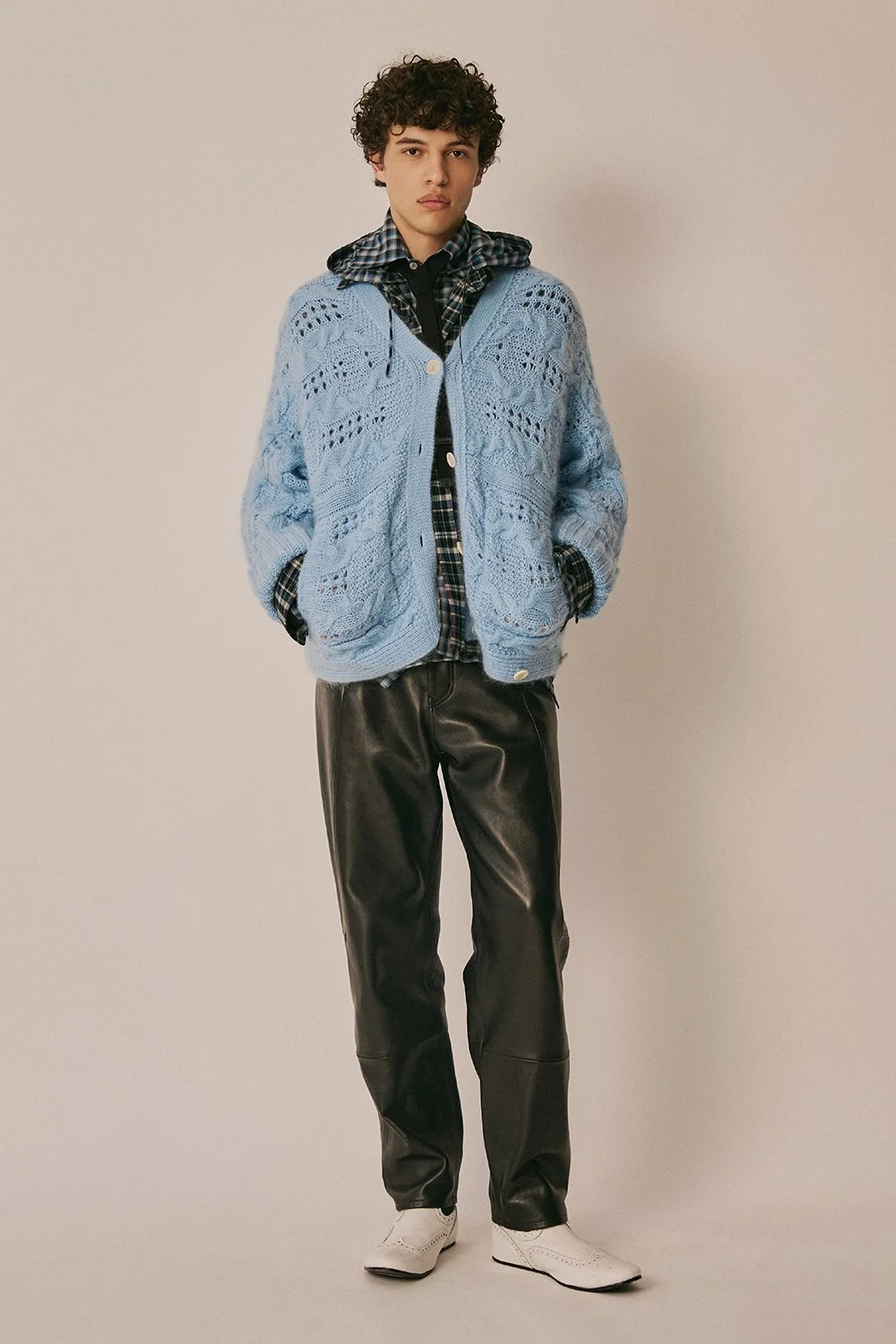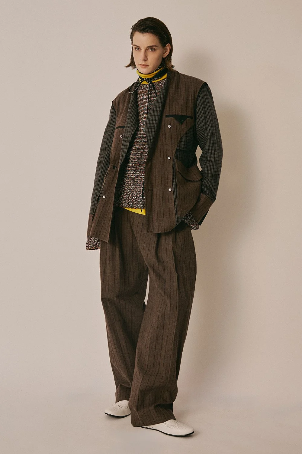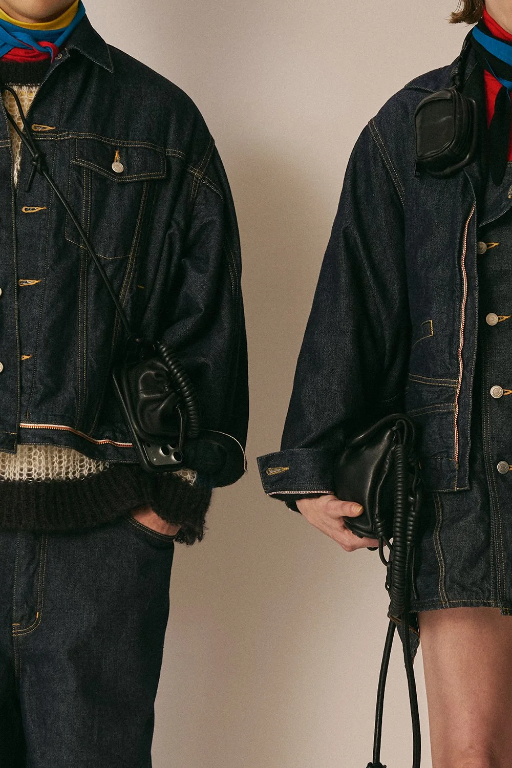 This season, the Japanese label, founded by Hidenori Kumakiri, focuses on the theme ‘resourcefulness’, whereby restraints and limitations are viewed as opportunities to recreate and wander. Archetypal clothing silhouettes are reimagined, fit and form are adjusted, fabrics are tweaked to coordinate with Winter, and colour is dialled down a touch, offering a new perspective on clothing. Legwear comprises wide-legged denim with twisted seams, leather-look trousers, and flowy dresses. Knitwear becomes a foundational layer, with sleeveless vests, chunky jumpers, and mixed-wool sweaters falling into place. The outerwear offering is inclusive, spanning oversized structured parkas with adjustable points, denim jackets, and cropped zip-up blousons available in different fabric blends. Tops, leather goods, shirting, and accessories are as critical to the line, providing energy to seasonal looks.