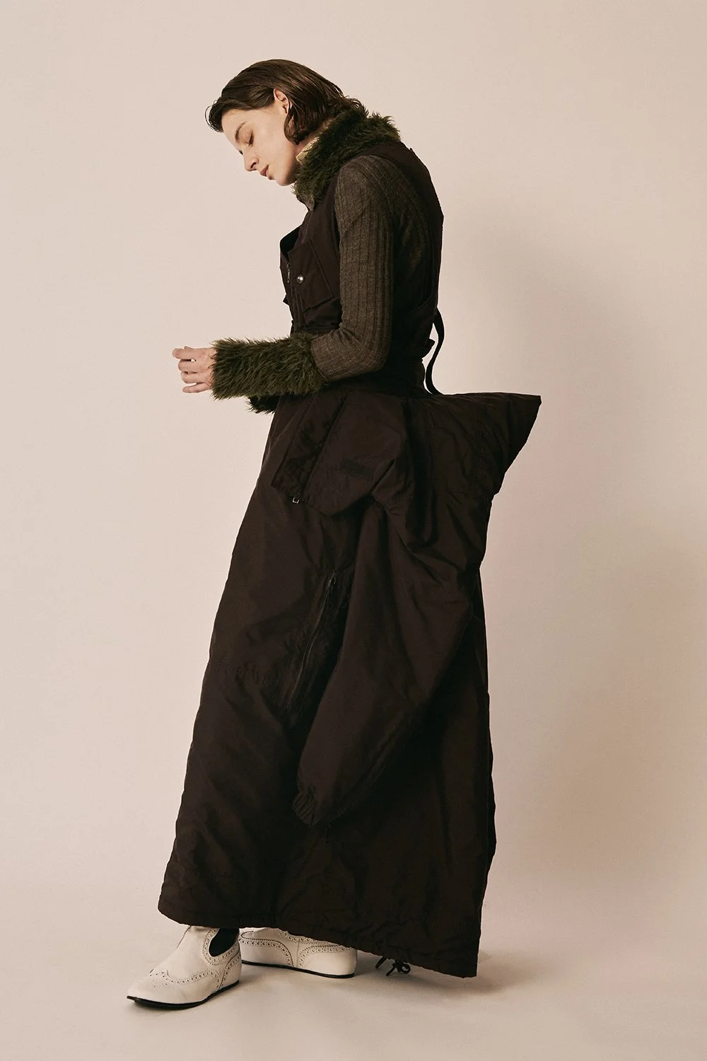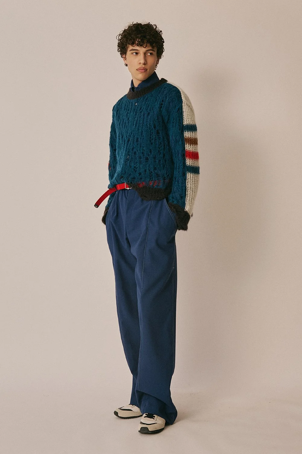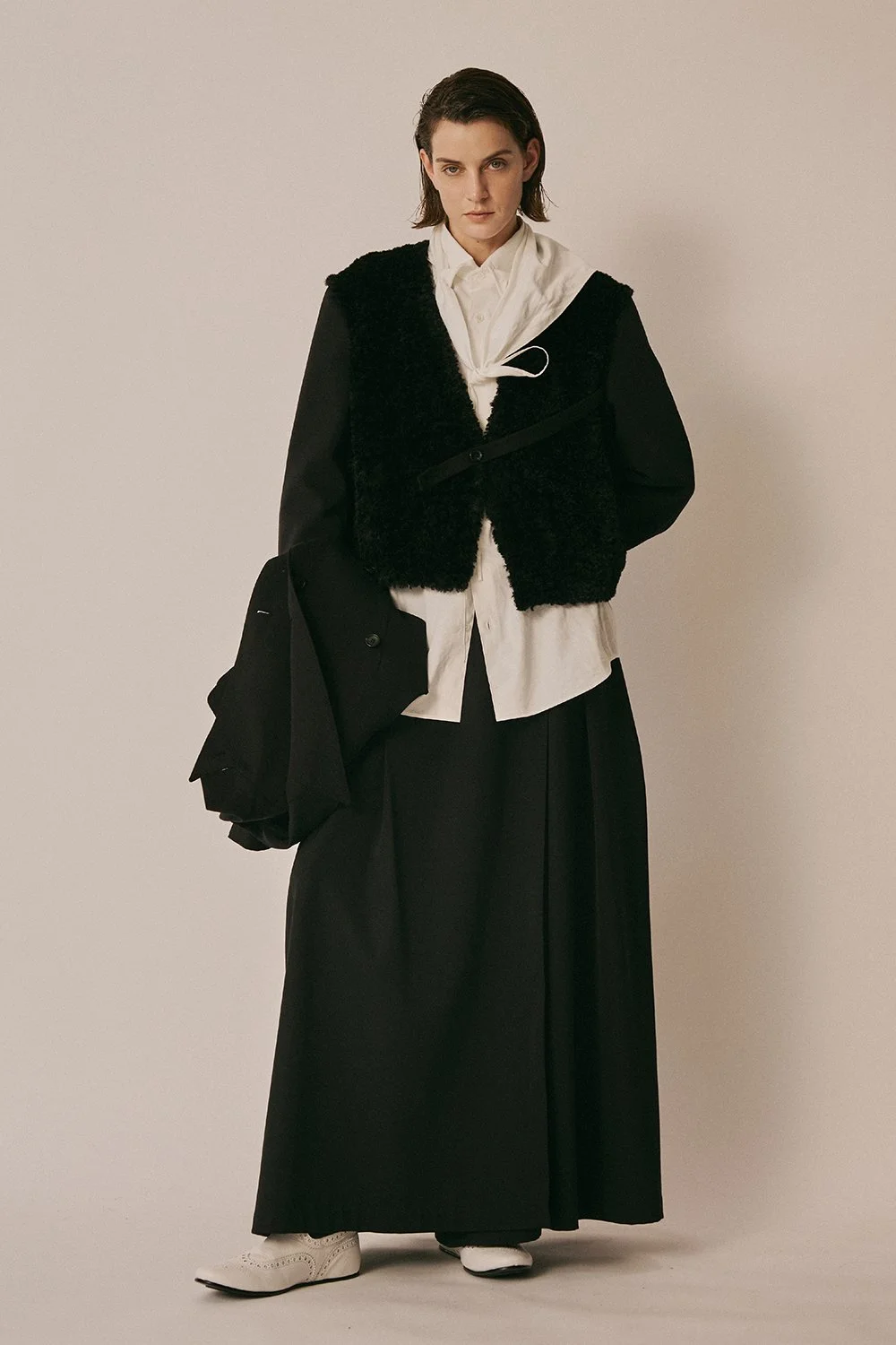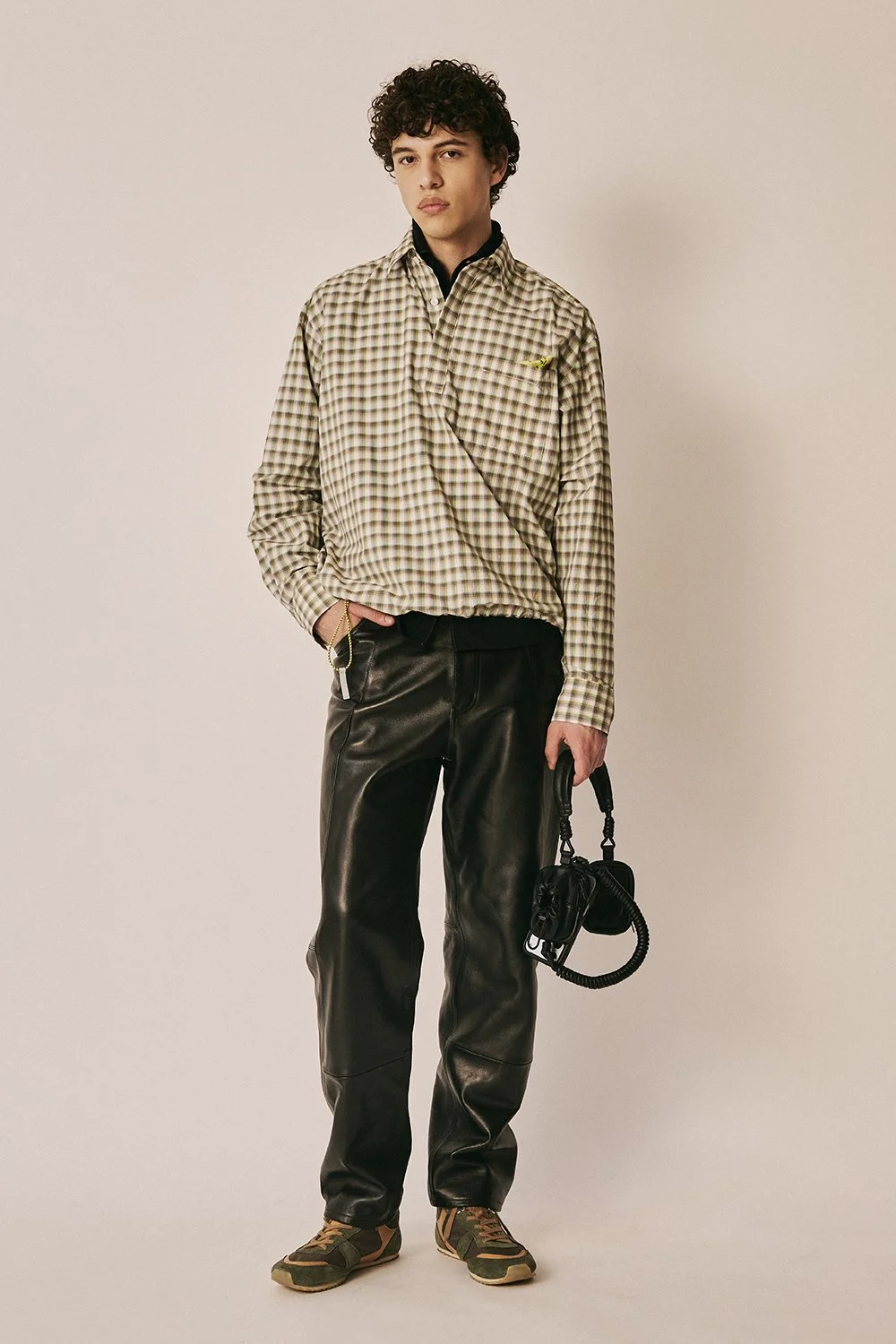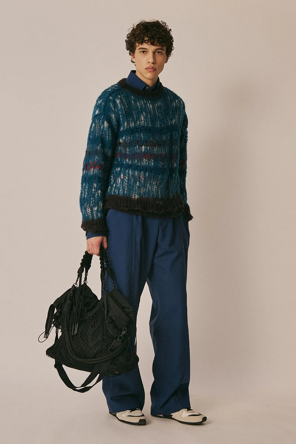 This season, the Japanese label, founded by Hidenori Kumakiri, focuses on the theme ‘resourcefulness’, whereby restraints and limitations are viewed as opportunities to recreate and wander. Archetypal clothing silhouettes are reimagined, fit and form are adjusted, fabrics are tweaked to coordinate with Winter, and colour is dialled down a touch, offering a new perspective on clothing. Legwear comprises wide-legged denim with twisted seams, leather-look trousers, and flowy dresses. Knitwear becomes a foundational layer, with sleeveless vests, chunky jumpers, and mixed-wool sweaters falling into place. The outerwear offering is inclusive, spanning oversized structured parkas with adjustable points, denim jackets, and cropped zip-up blousons available in different fabric blends. Tops, leather goods, shirting, and accessories are as critical to the line, providing energy to seasonal looks.