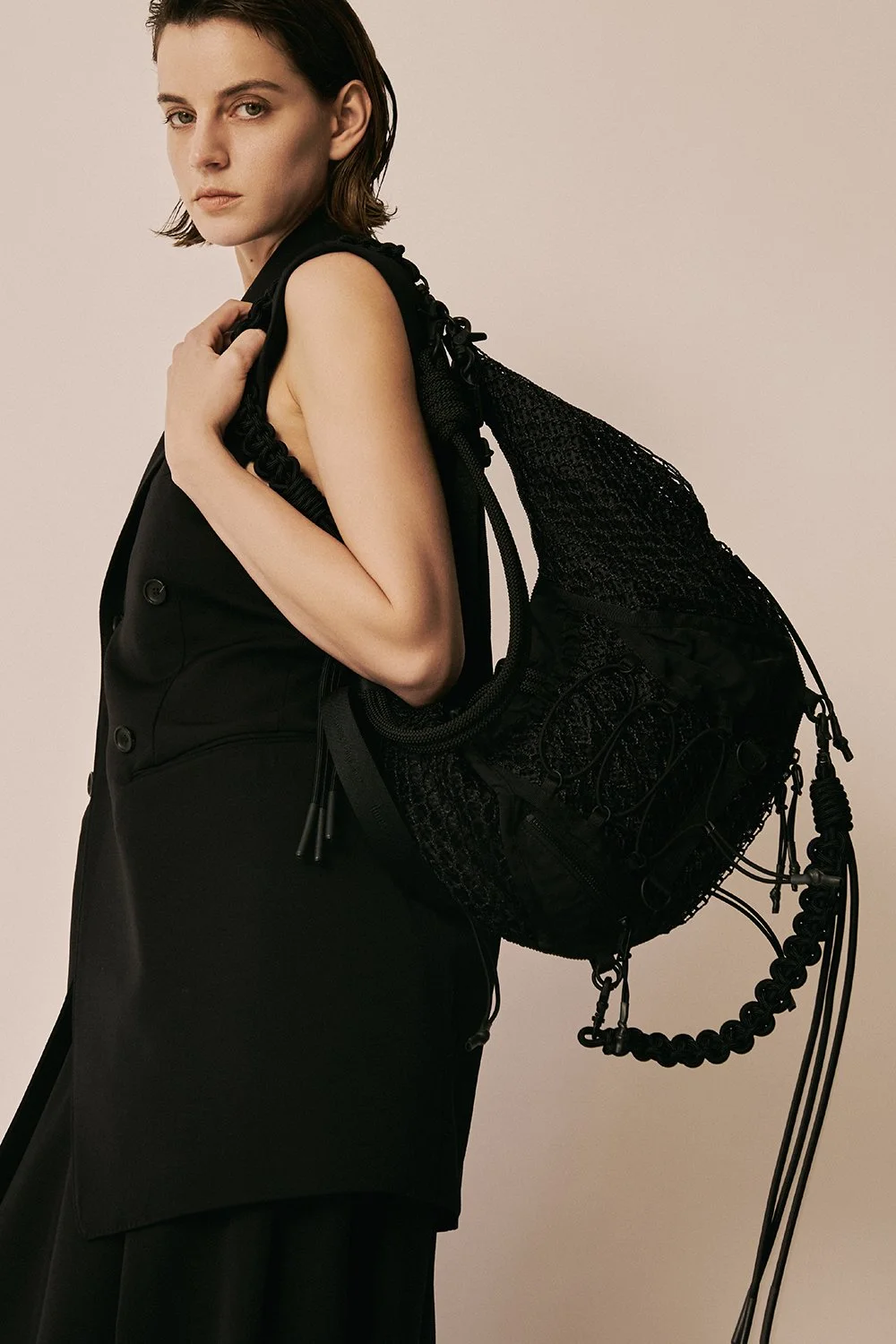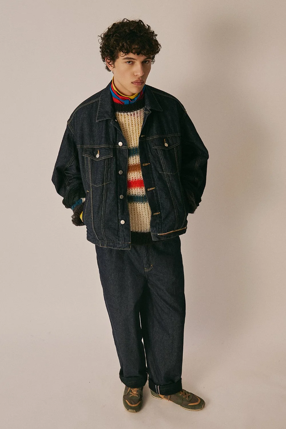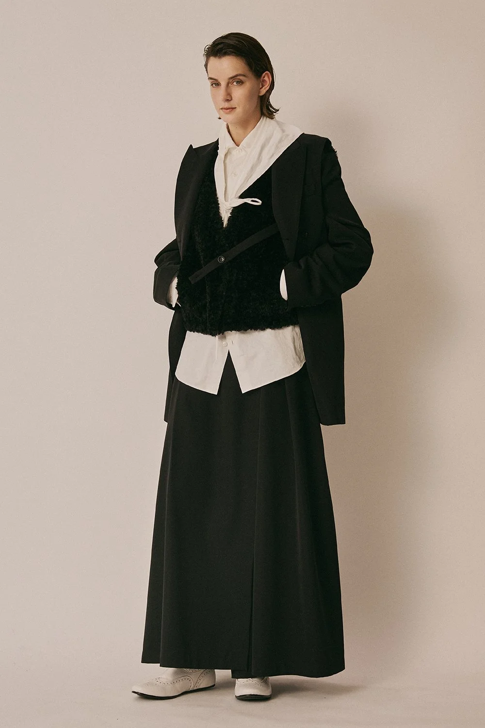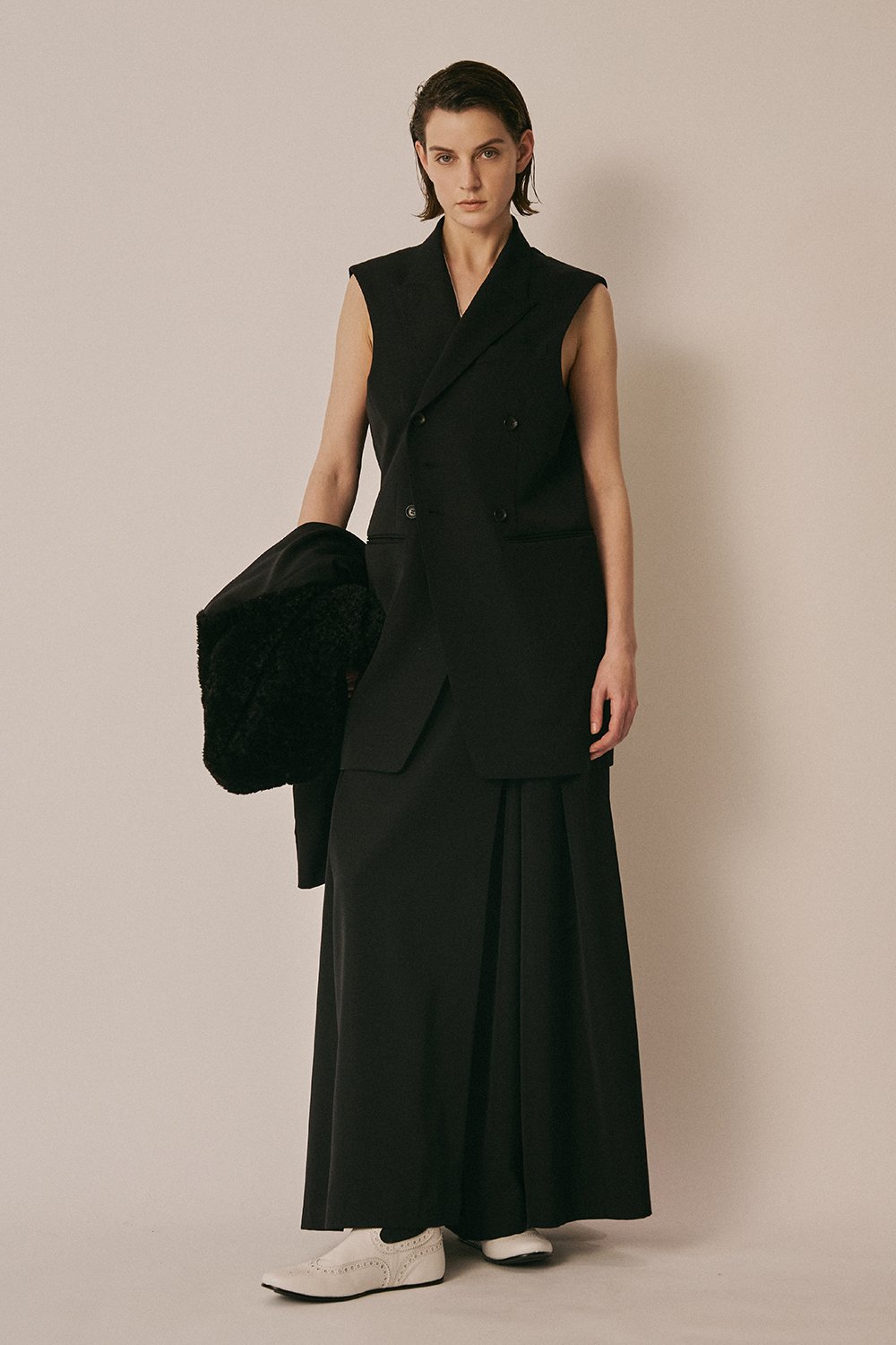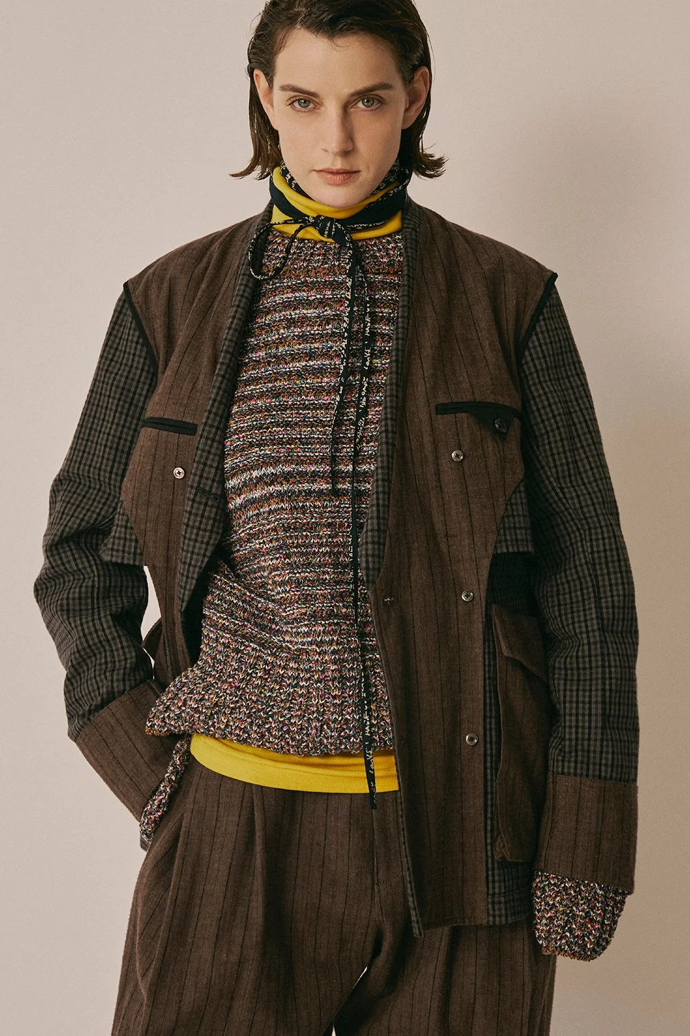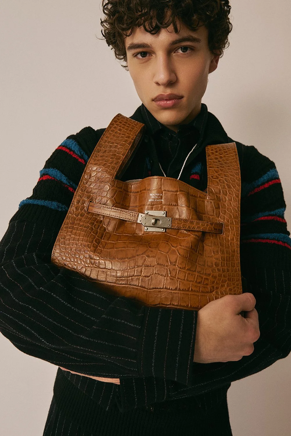 This season, the Japanese label, founded by Hidenori Kumakiri, focuses on the theme ‘resourcefulness’, whereby restraints and limitations are viewed as opportunities to recreate and wander. Archetypal clothing silhouettes are reimagined, fit and form are adjusted, fabrics are tweaked to coordinate with Winter, and colour is dialled down a touch, offering a new perspective on clothing. Legwear comprises wide-legged denim with twisted seams, leather-look trousers, and flowy dresses. Knitwear becomes a foundational layer, with sleeveless vests, chunky jumpers, and mixed-wool sweaters falling into place. The outerwear offering is inclusive, spanning oversized structured parkas with adjustable points, denim jackets, and cropped zip-up blousons available in different fabric blends. Tops, leather goods, shirting, and accessories are as critical to the line, providing energy to seasonal looks.