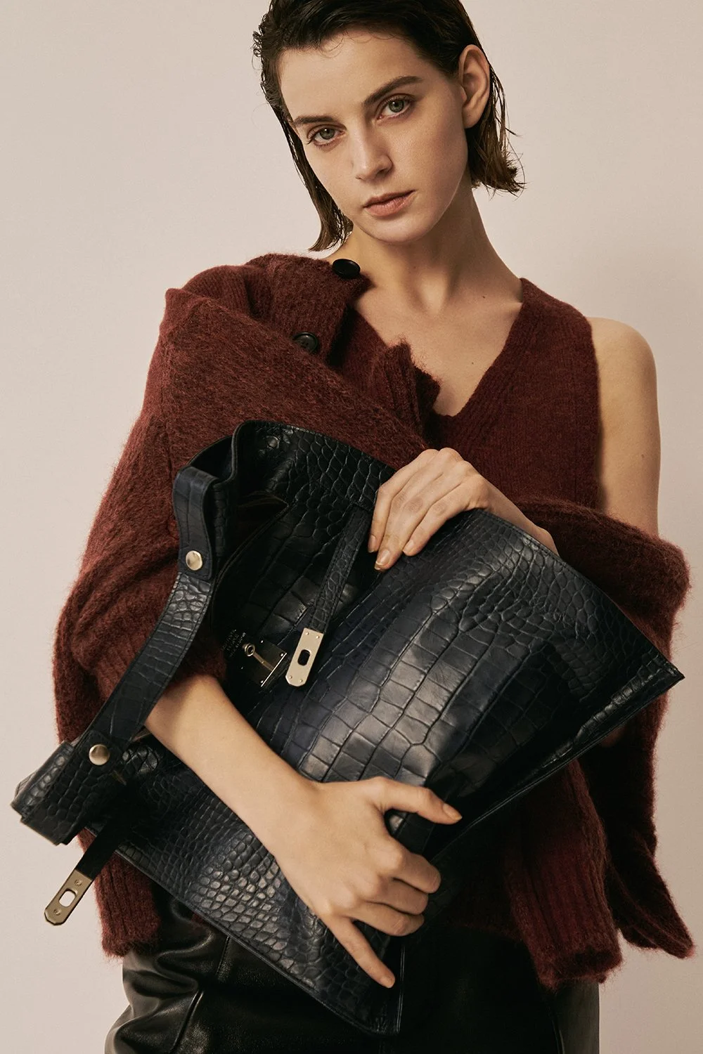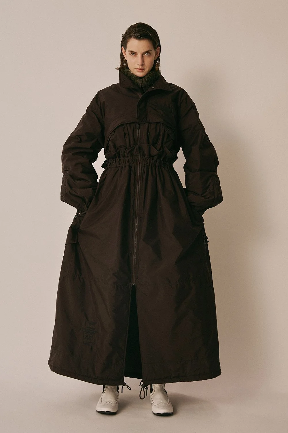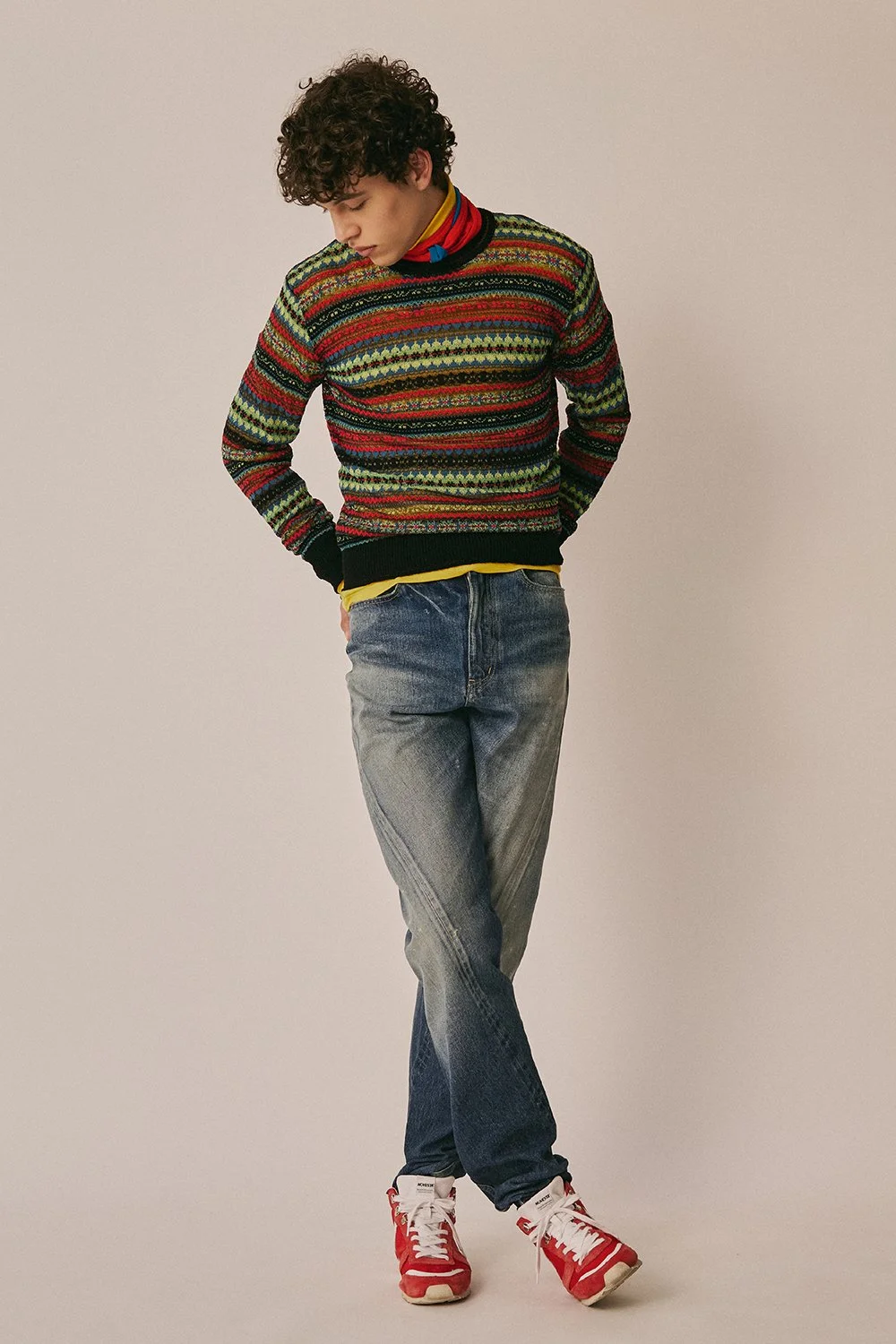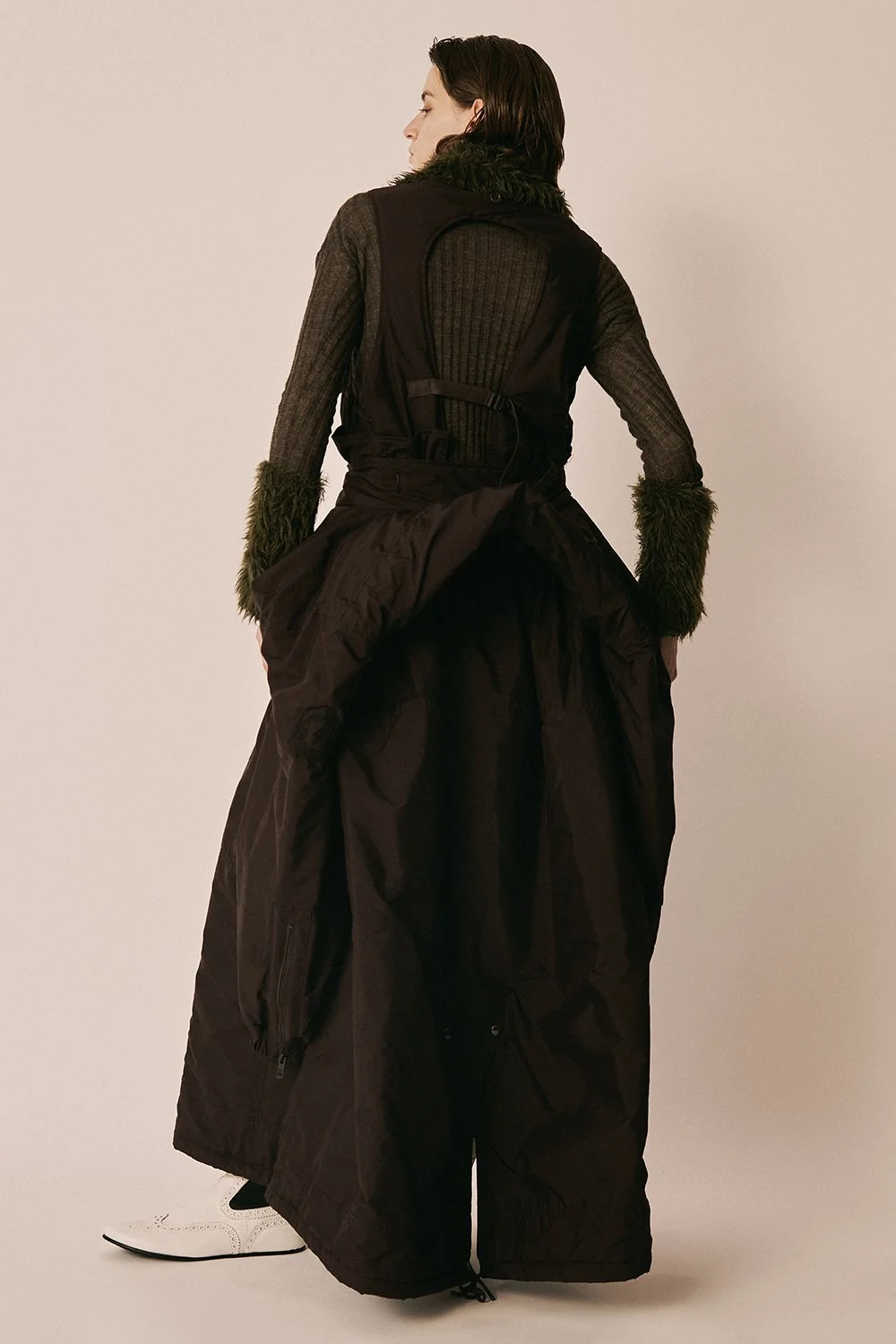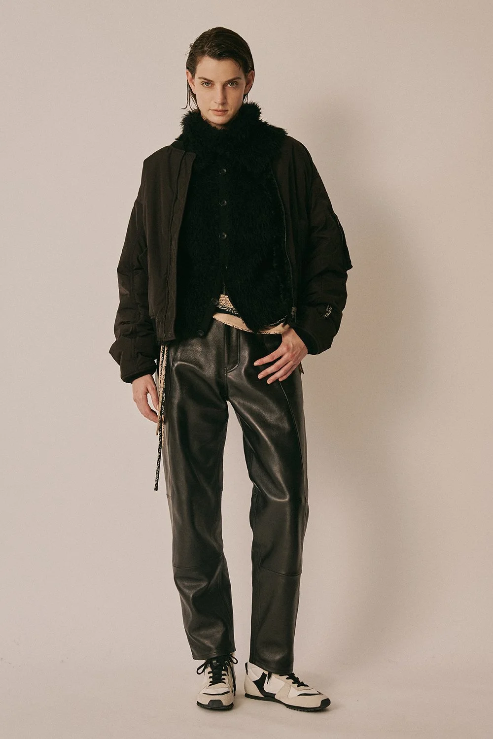 This season, the Japanese label, founded by Hidenori Kumakiri, focuses on the theme ‘resourcefulness’, whereby restraints and limitations are viewed as opportunities to recreate and wander. Archetypal clothing silhouettes are reimagined, fit and form are adjusted, fabrics are tweaked to coordinate with Winter, and colour is dialled down a touch, offering a new perspective on clothing. Legwear comprises wide-legged denim with twisted seams, leather-look trousers, and flowy dresses. Knitwear becomes a foundational layer, with sleeveless vests, chunky jumpers, and mixed-wool sweaters falling into place. The outerwear offering is inclusive, spanning oversized structured parkas with adjustable points, denim jackets, and cropped zip-up blousons available in different fabric blends. Tops, leather goods, shirting, and accessories are as critical to the line, providing energy to seasonal looks.