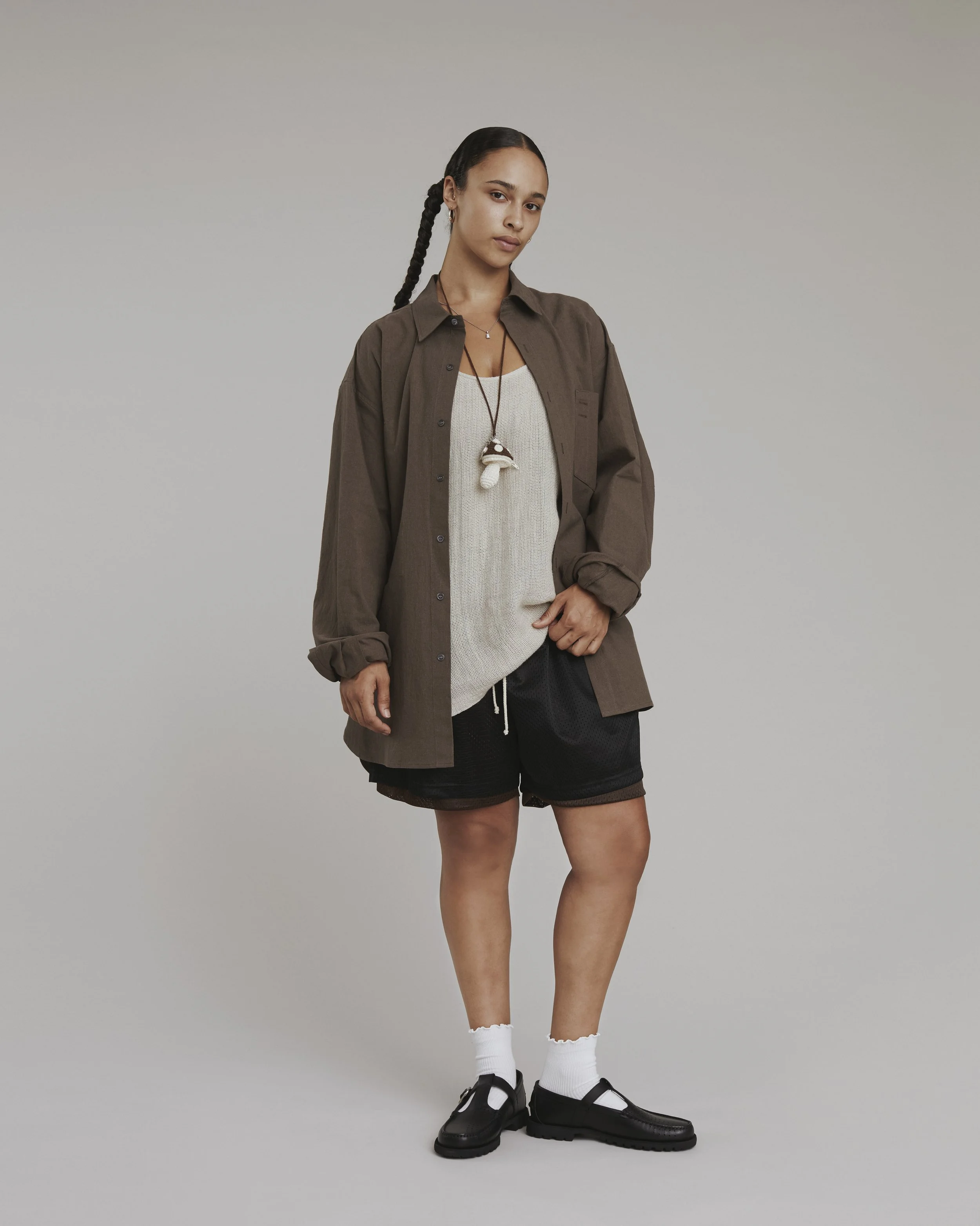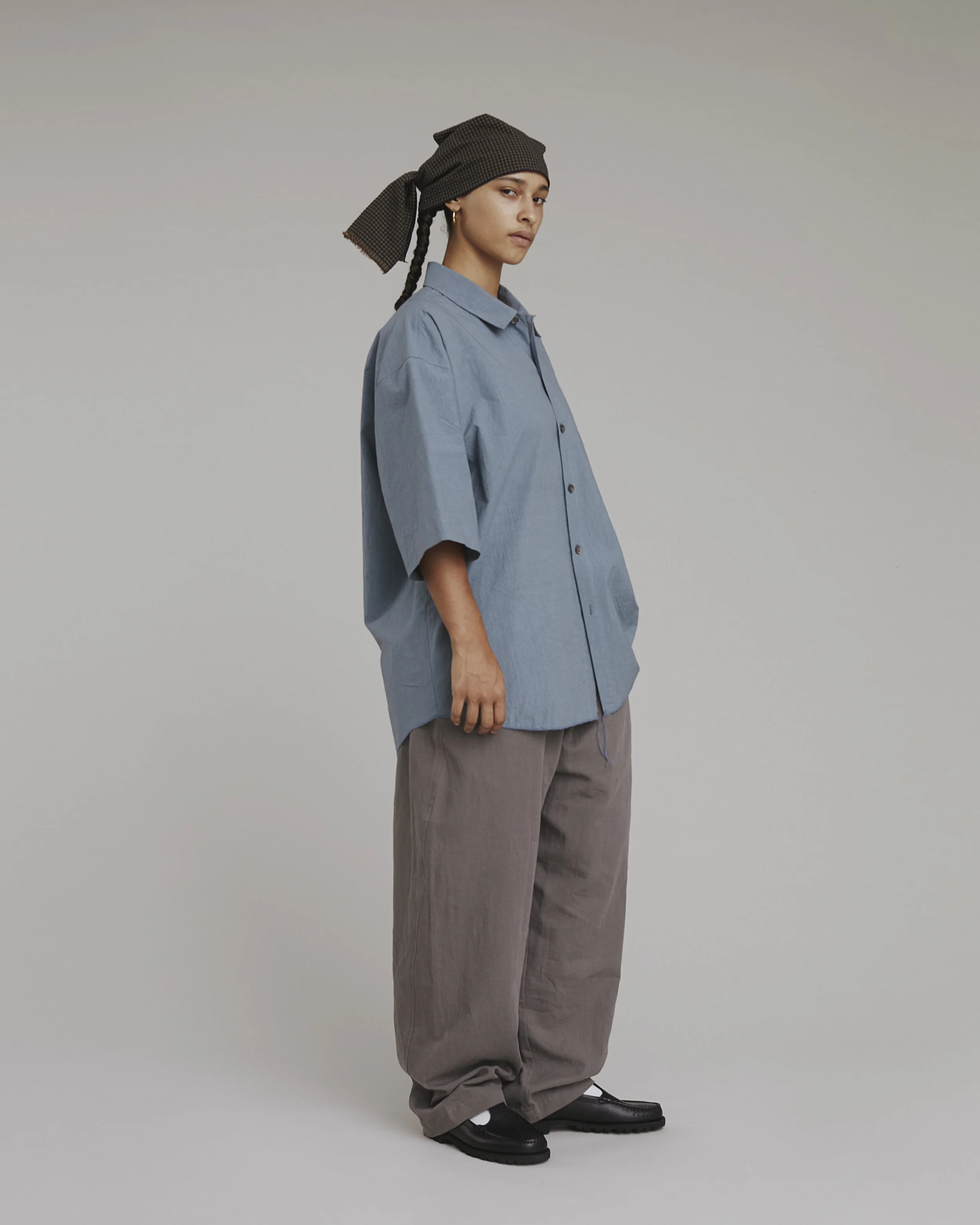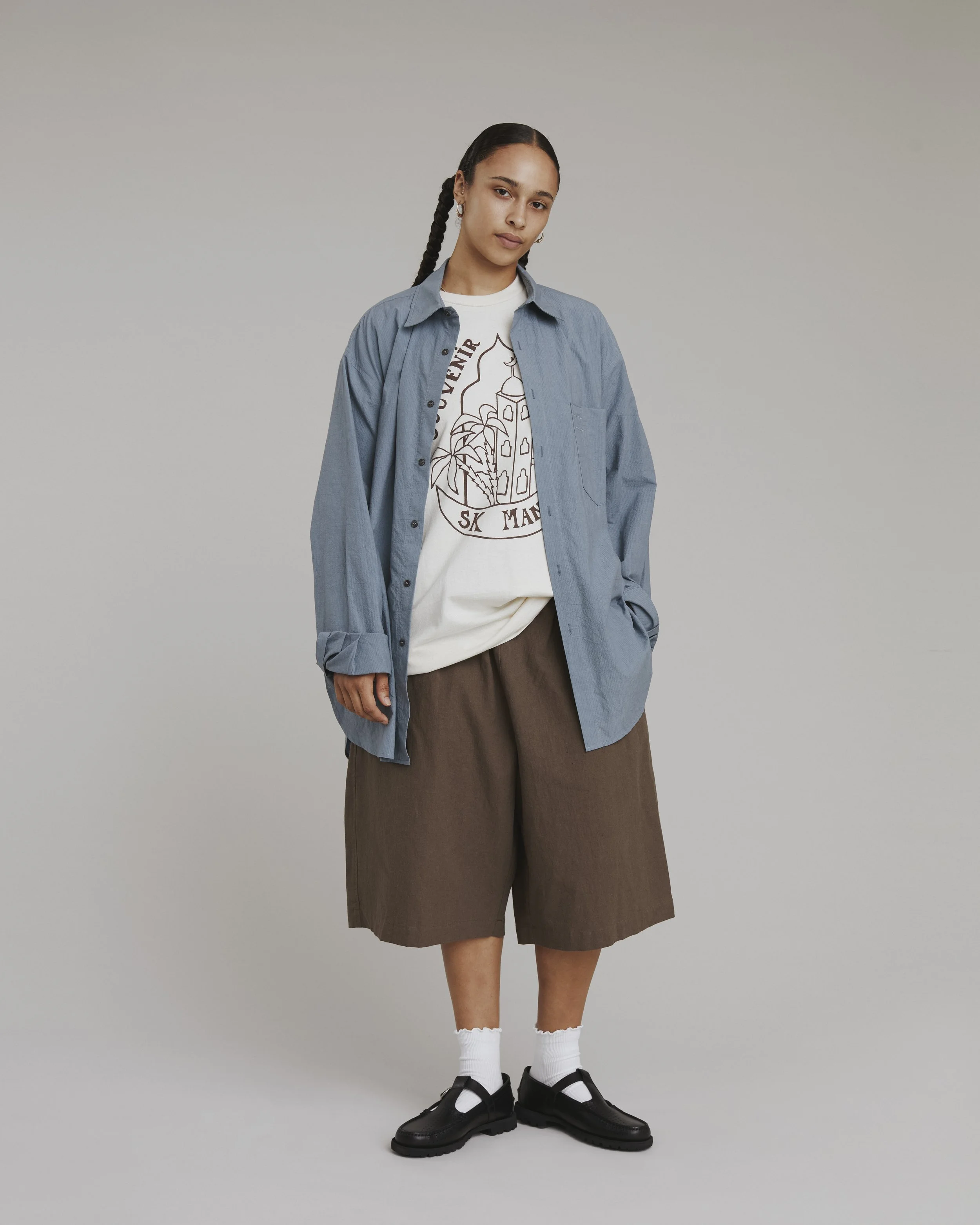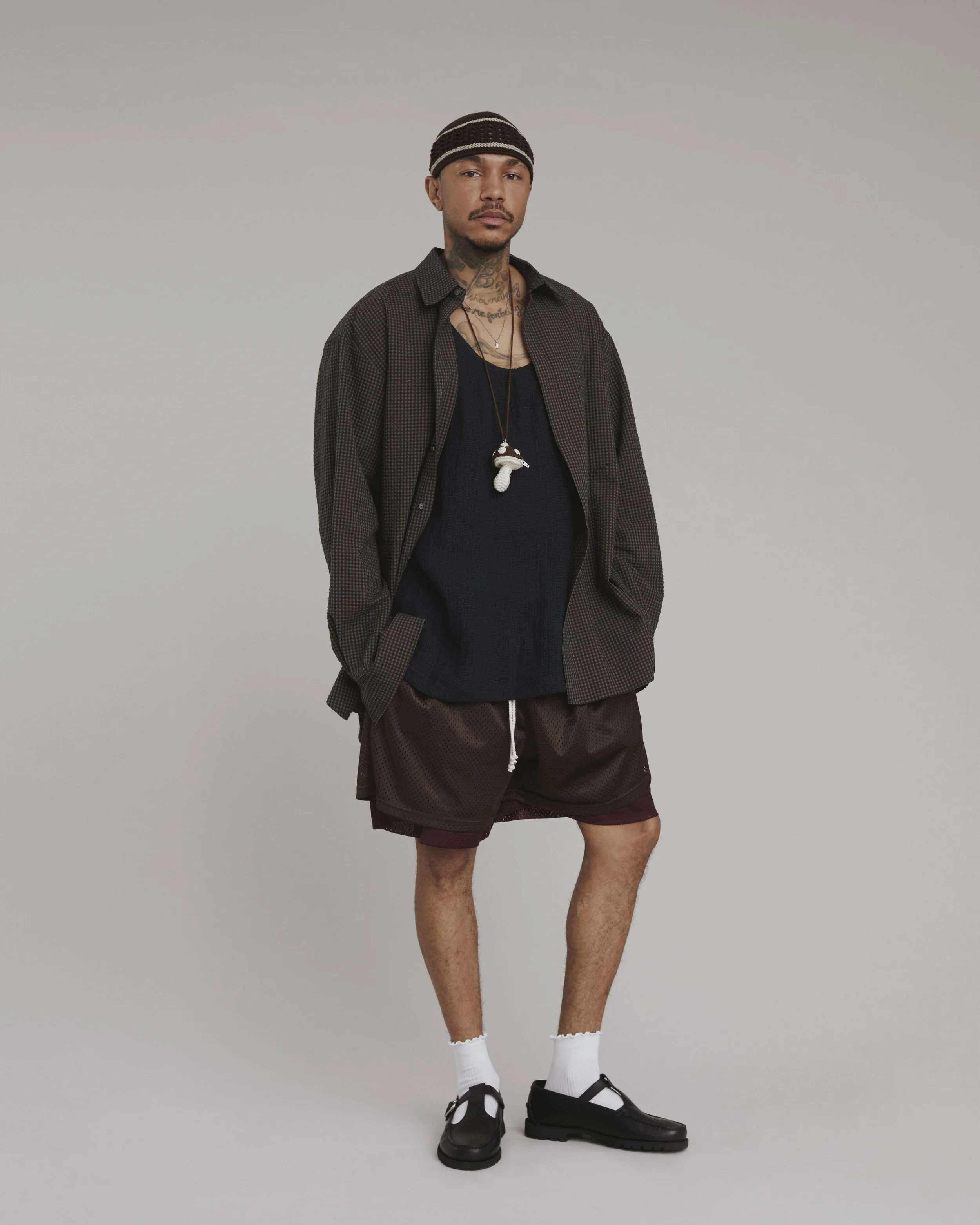 Built around the power of juxtaposition, the season explores where skyscraper meets nomad, where modesty meets provocateur, and where suiting meets wilderness. Longer shorts, coordinated separates, and relaxed layering create an effortless sense of versatility. Sheer black cotton shirting and seersucker plaids add texture and breathability, balancing structure with ease. The palette moves between cool maritime blues and the warm browns of Tunisian streets, grounding the collection in both travel and memory. Favourites of ours include the Ridge Jacket, the Aloha Shirt, and the Scribe Shirt.
