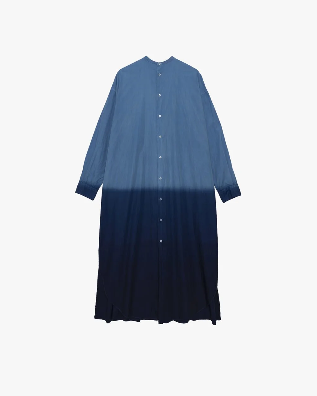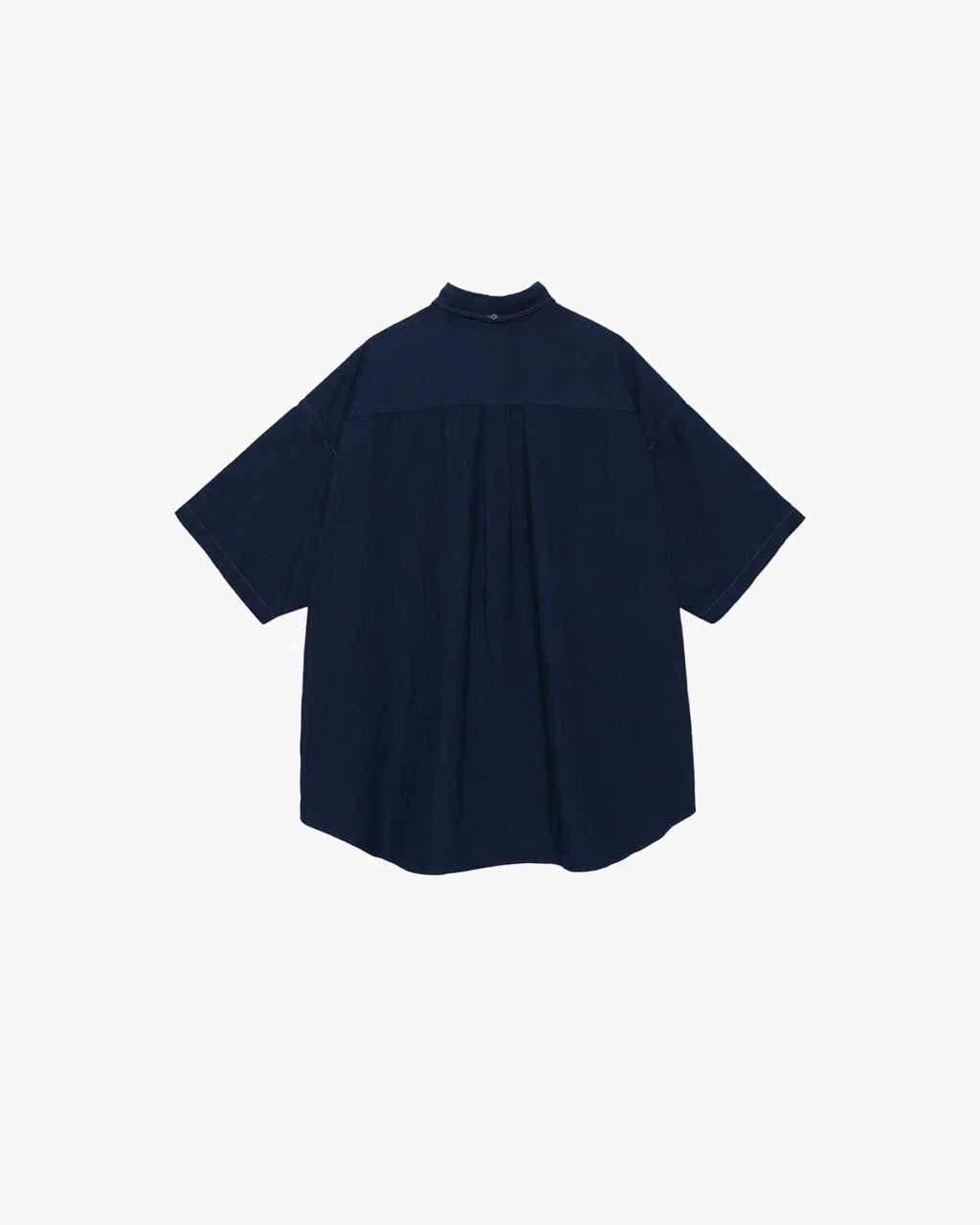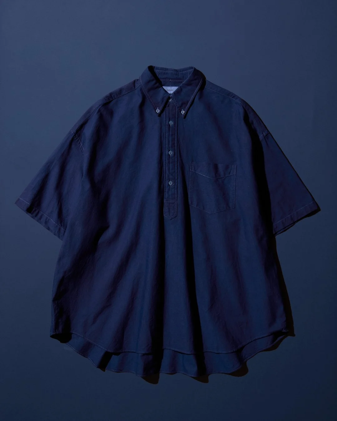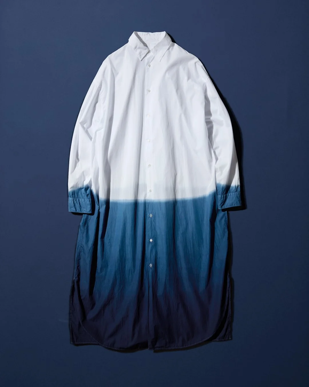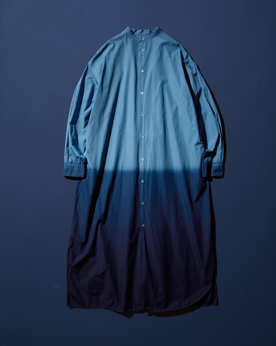 The Ryukyu Okinawa Research Institute consistently performs everything from soil creation to cultivation, dye extraction and dyeing to inherit the traditional Okinawa craft, Ryukyuu Okinawa. This particular colour, feel, and depth of indigo can only be achieved naturally and cannot be expressed using chemical dyes; the institute preserves tradition by naming it RYUKYU BLUE®. The result is four original Graphpaper styles, rendered in RYUKYU BLUE®, the S/S Pocket Tee, Oversized B.D Pullover Shirt, and the Oversized Shirt Dress in the Broad and Regular configurations. The t-shirts and shirts are dyed approximately 10 times, while being kneaded to ensure even colour distribution. In contrast, the shirt dress is defined by its graded fade, achieved by repeat dyeing to create a smooth transition between ligh and dark shades.